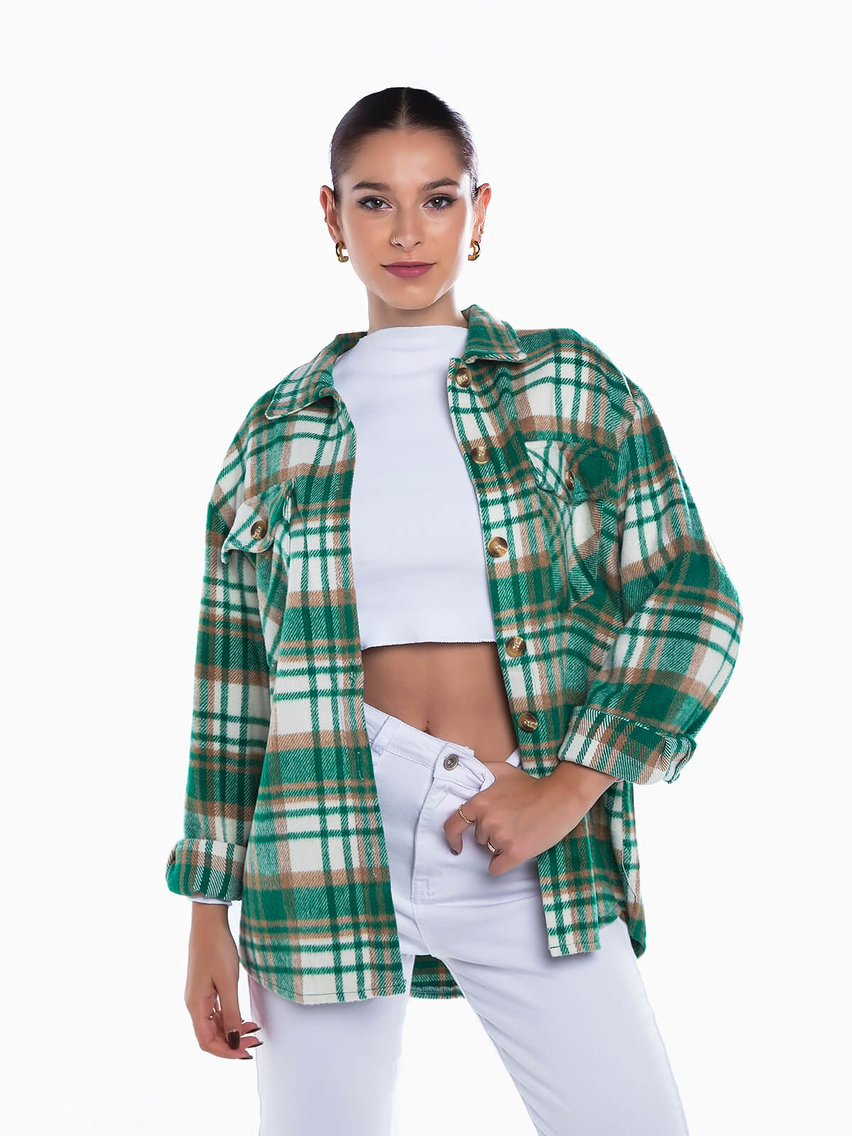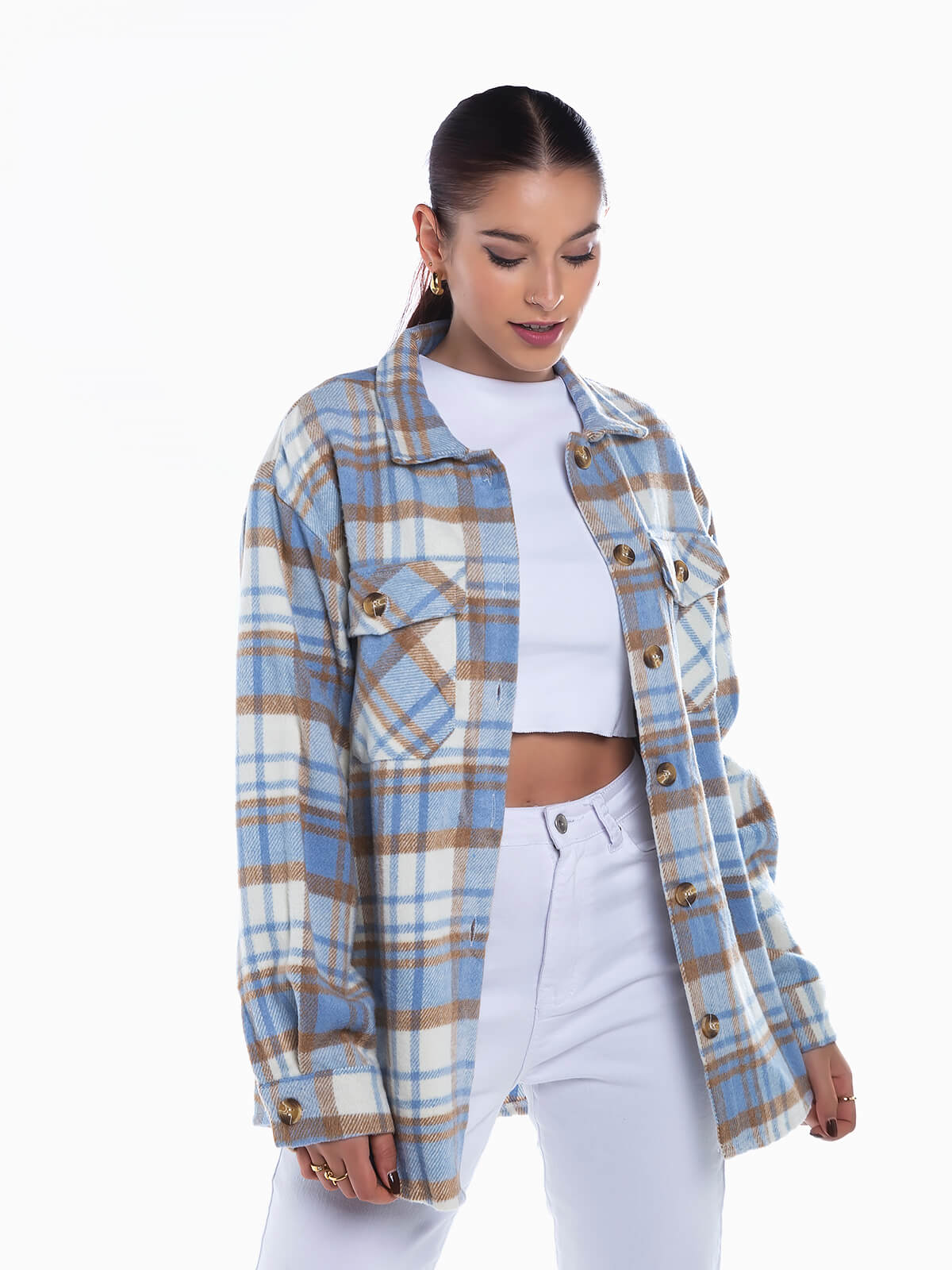 Casaco camiseiro em xadrez de flanela para senhora. Sobrecamisa em tecido quente e de toque macio. Manga comprida com punhos abotoados. 2 bolsos no peito. Gola de abas. Aperto frontal de botões.