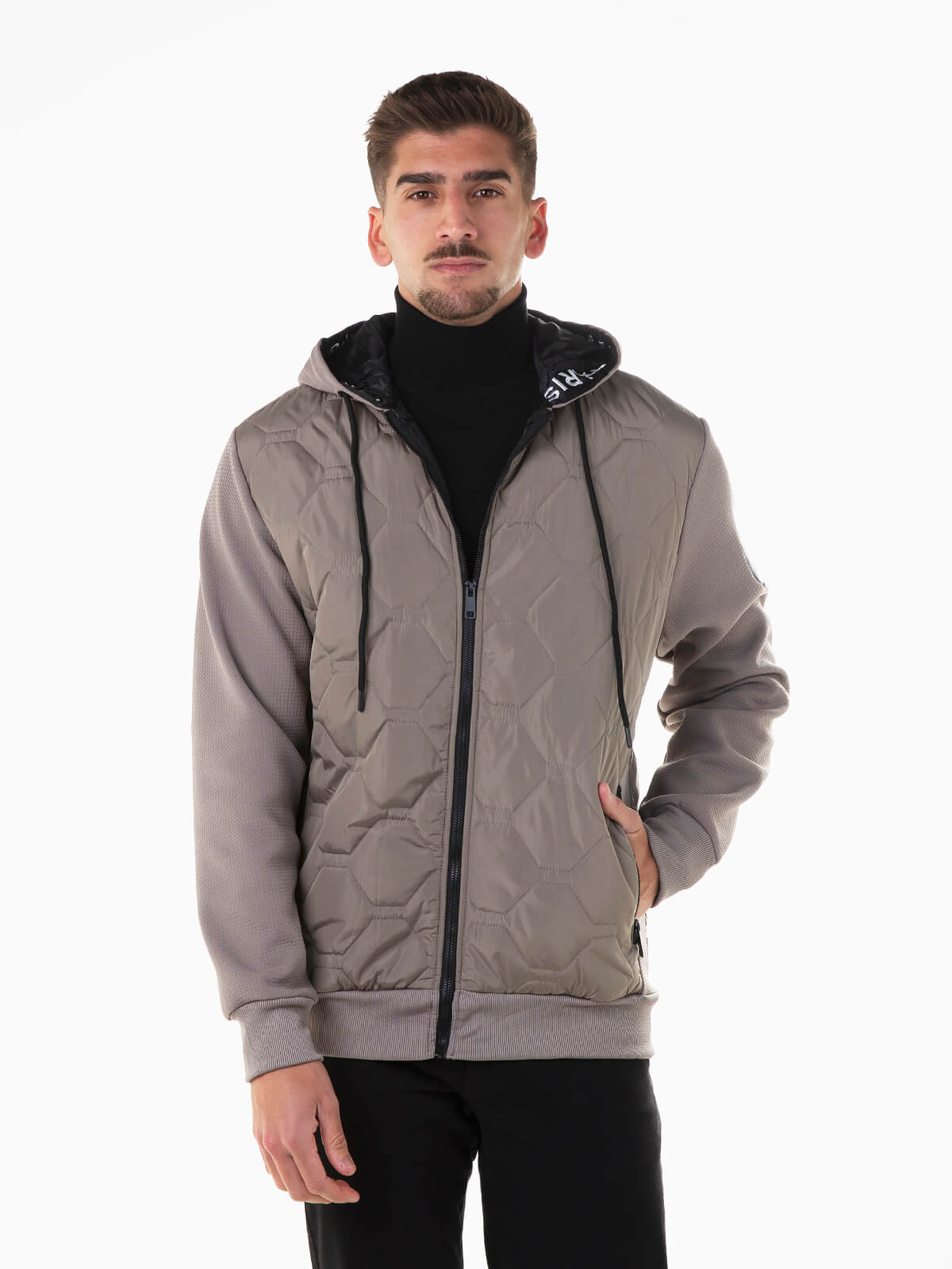 Casaco combinado com parte acolchoada à frente e atrás. Casaco com capuz e cordão para para ajustar. 2 bolsos. Aperto de fecho zíper.