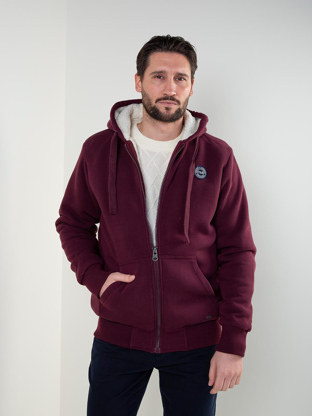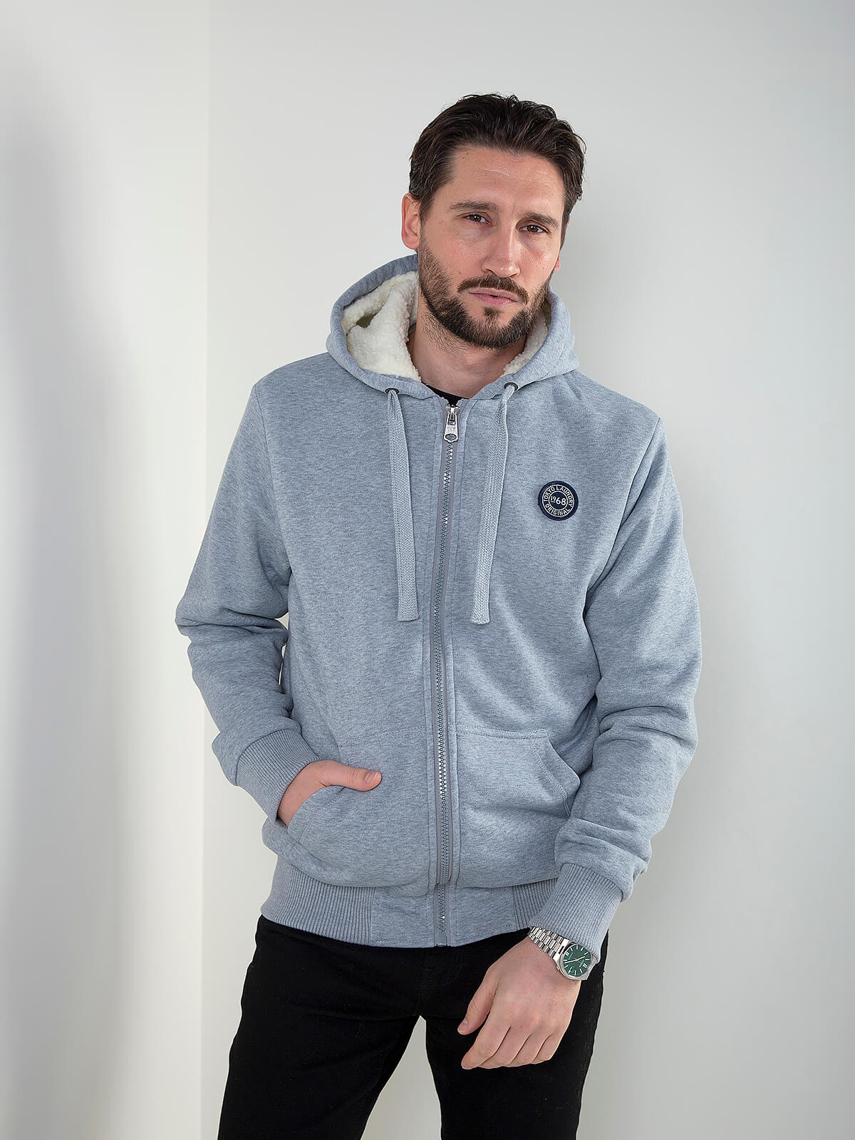 Casaco com capuz para homem, com pelo no interior, fecho de correr e bolsos frontais. Ideal para dias frios e looks casuais.