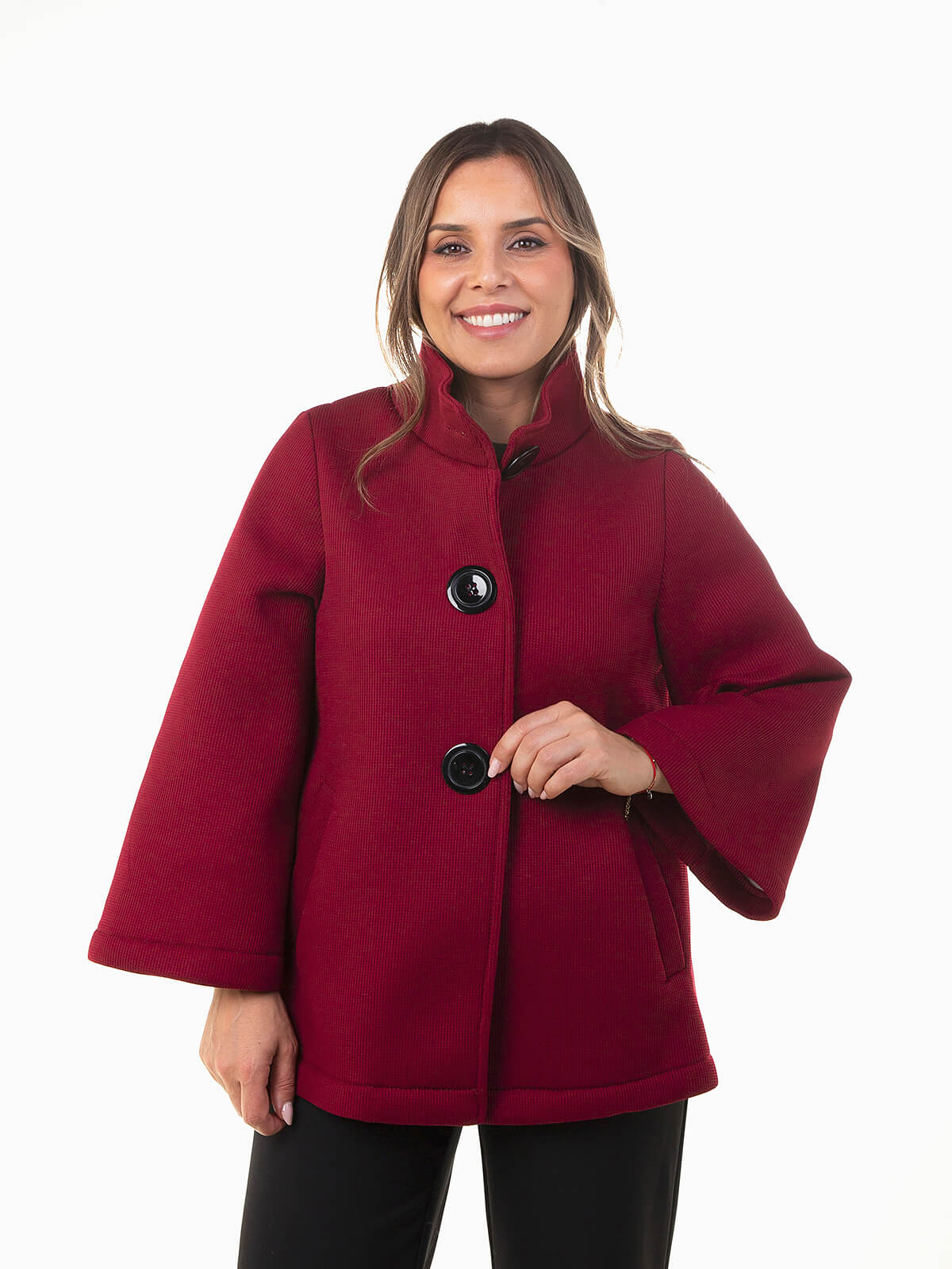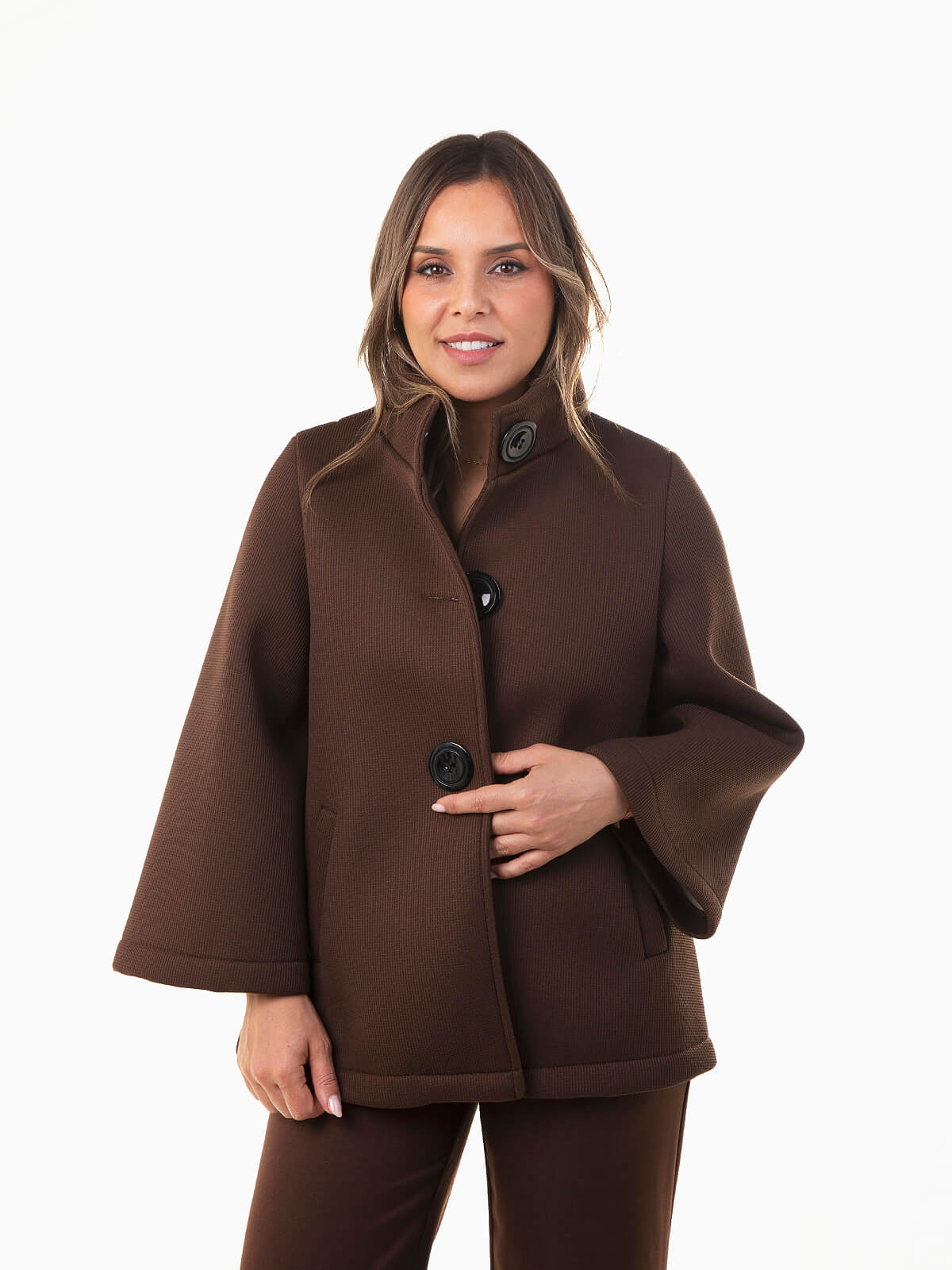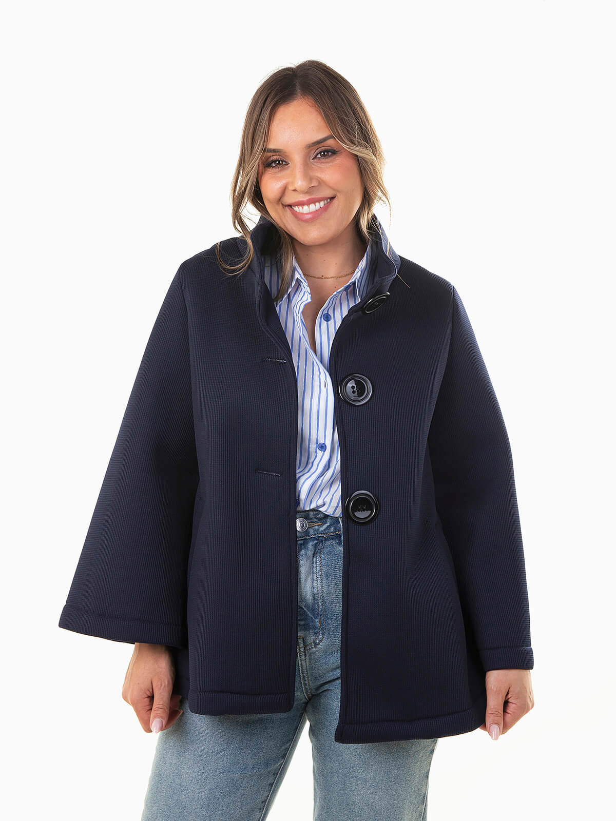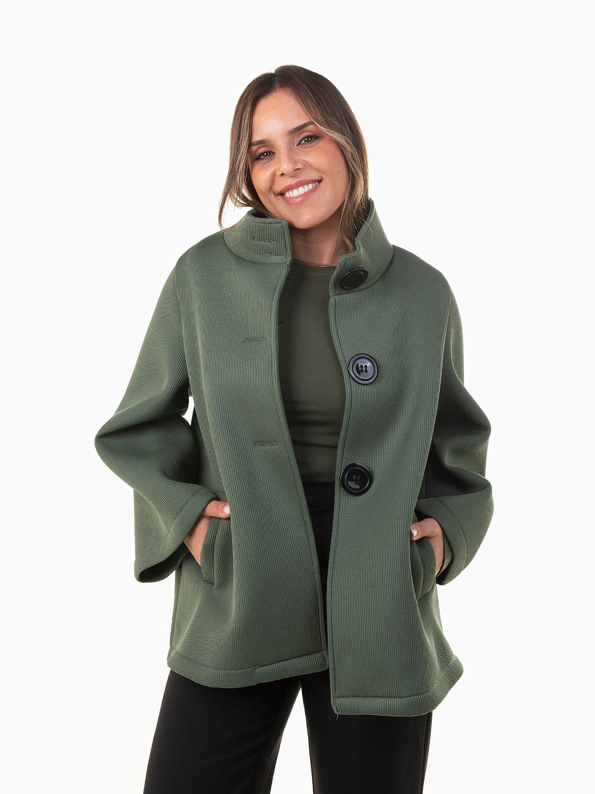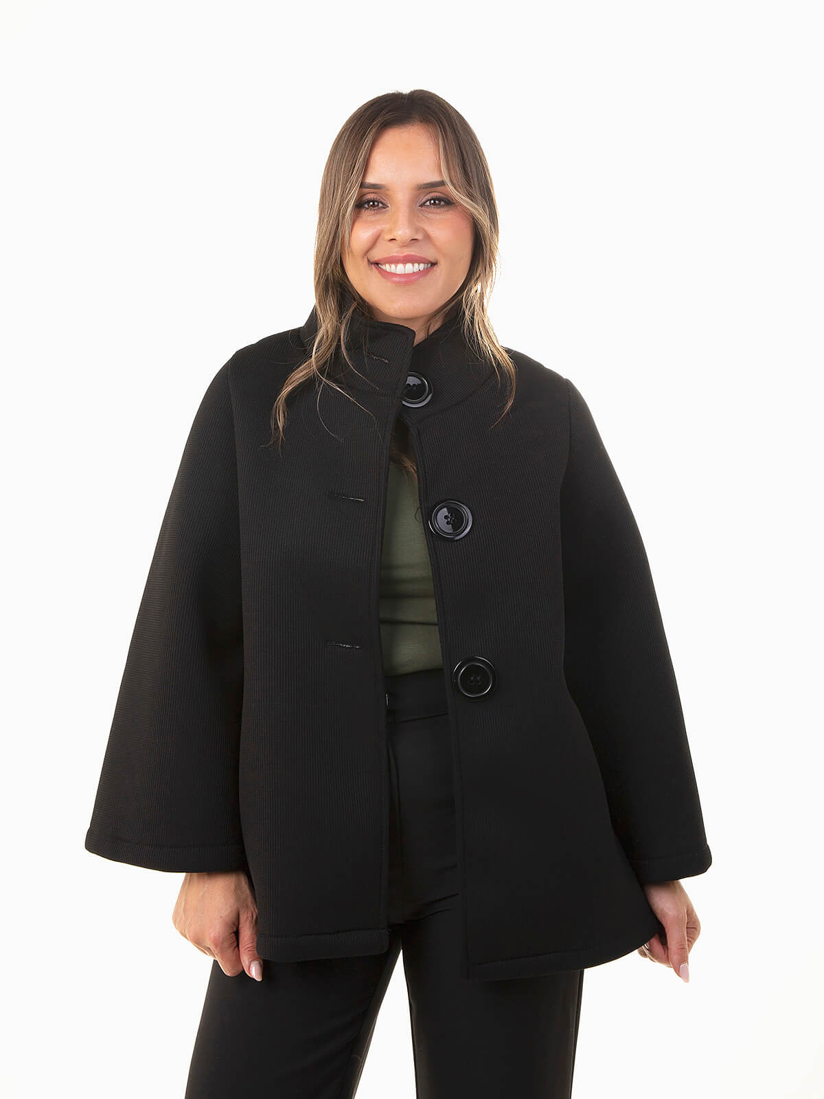 Casaco em tecido estruturado tipo neopreno, com textura e gola alta. Modelo de manga 3/4 estilo capa, dois bolsos e aperto com botões. Uma peça moderna e distinta, perfeita para elevar qualquer look da temporada.