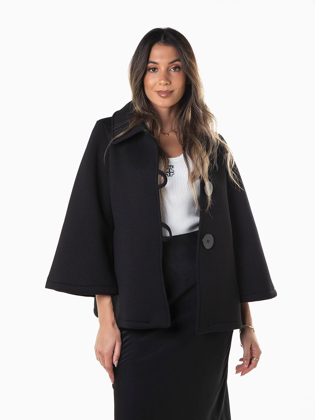 Casaco em neoprene para um ajuste perfeito e durabilidade excecional. Casaco com manga 3/4 tipo capa. Tecido com textura. Gola de abas. 2 bolsos. Aperto de botões.