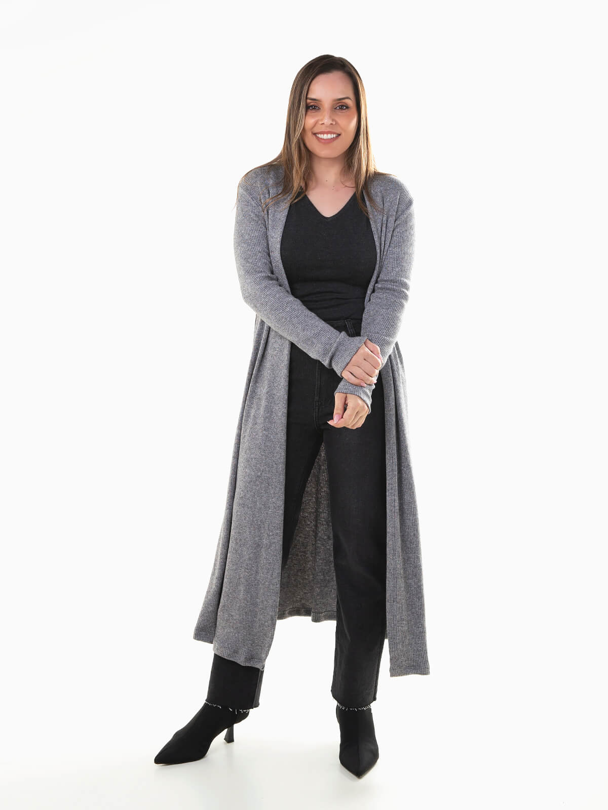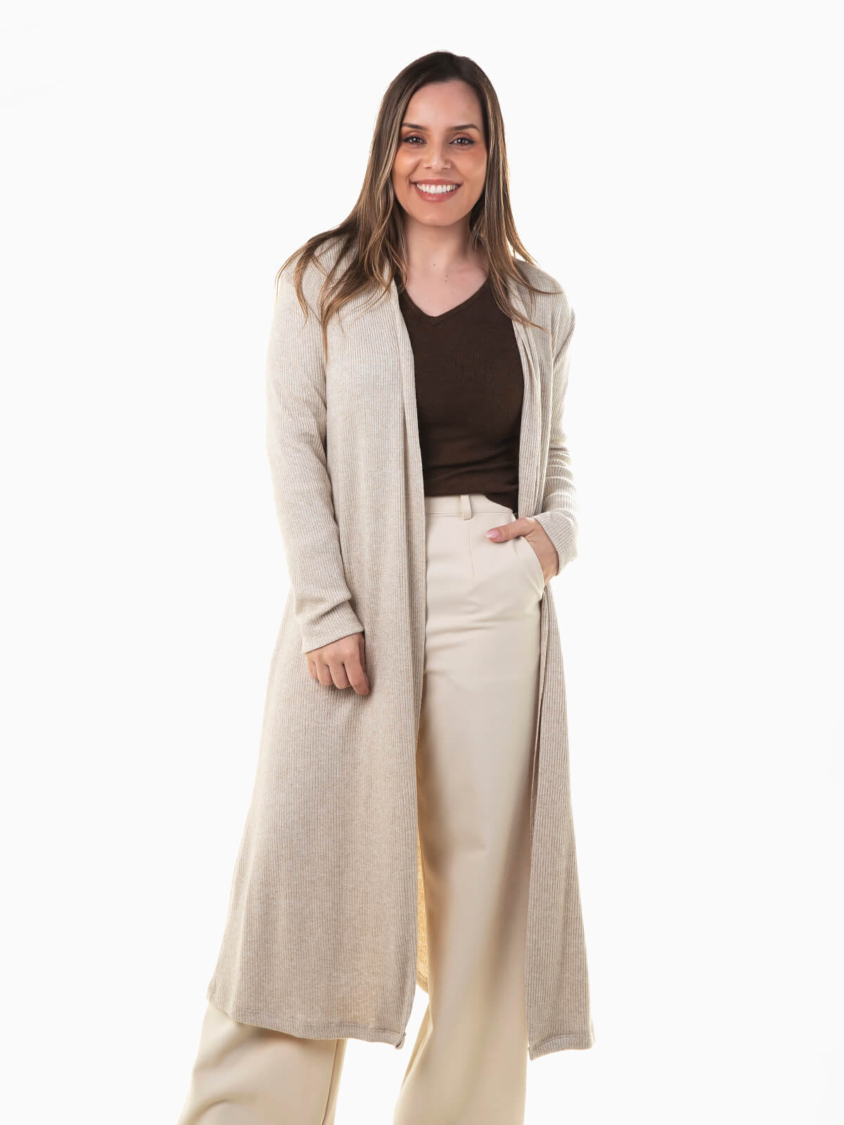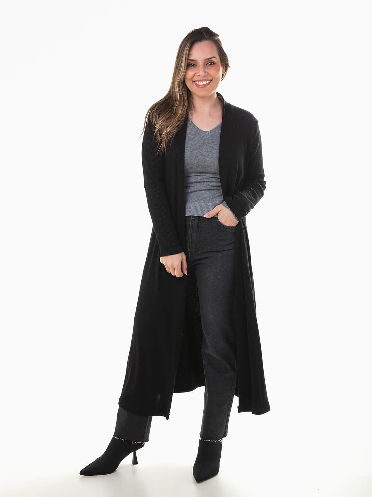 Casaco comprido em malha canelada com fios luréx para efeito brilhante. Casaco aberto de manga comprida para mulher.