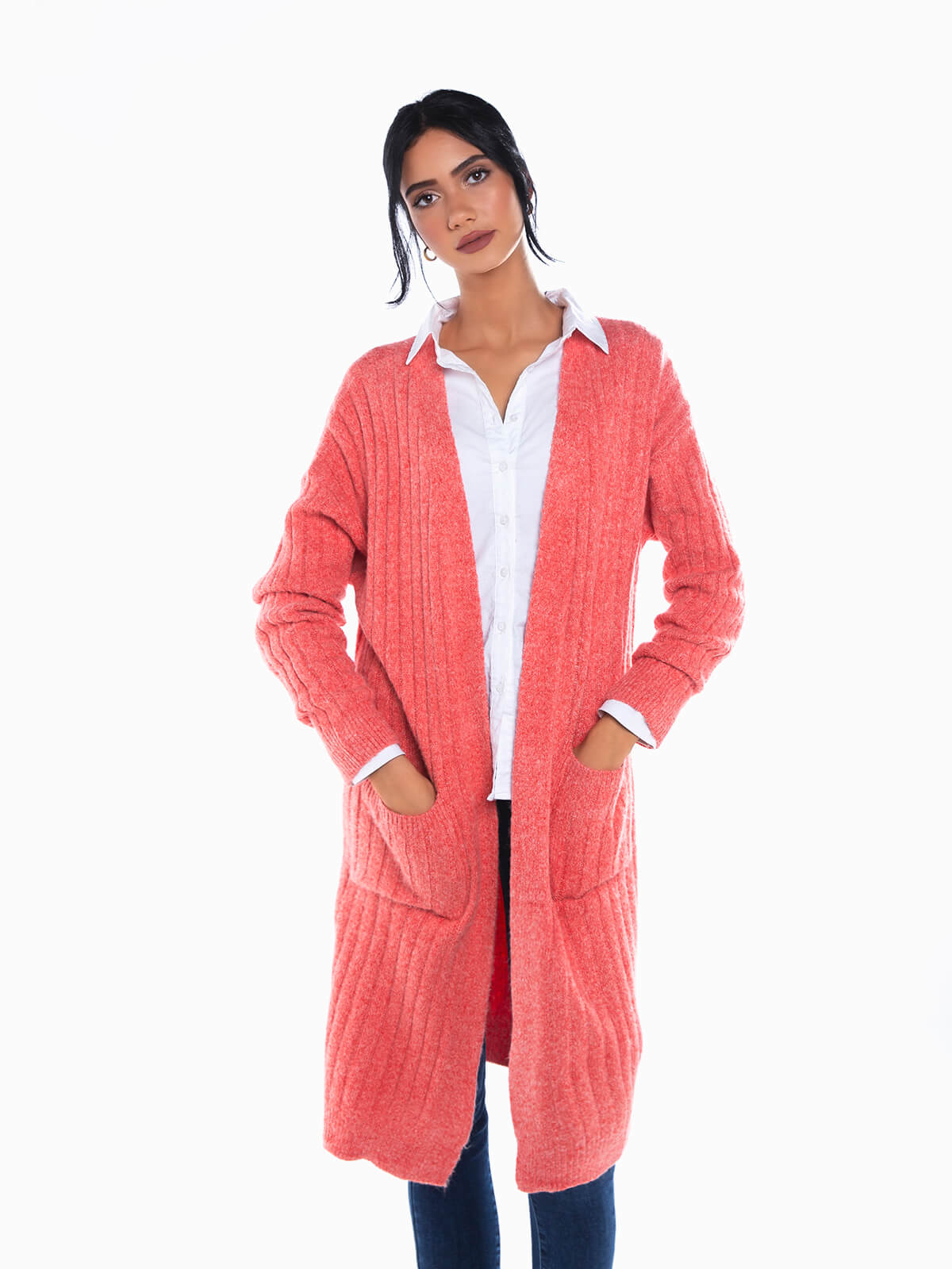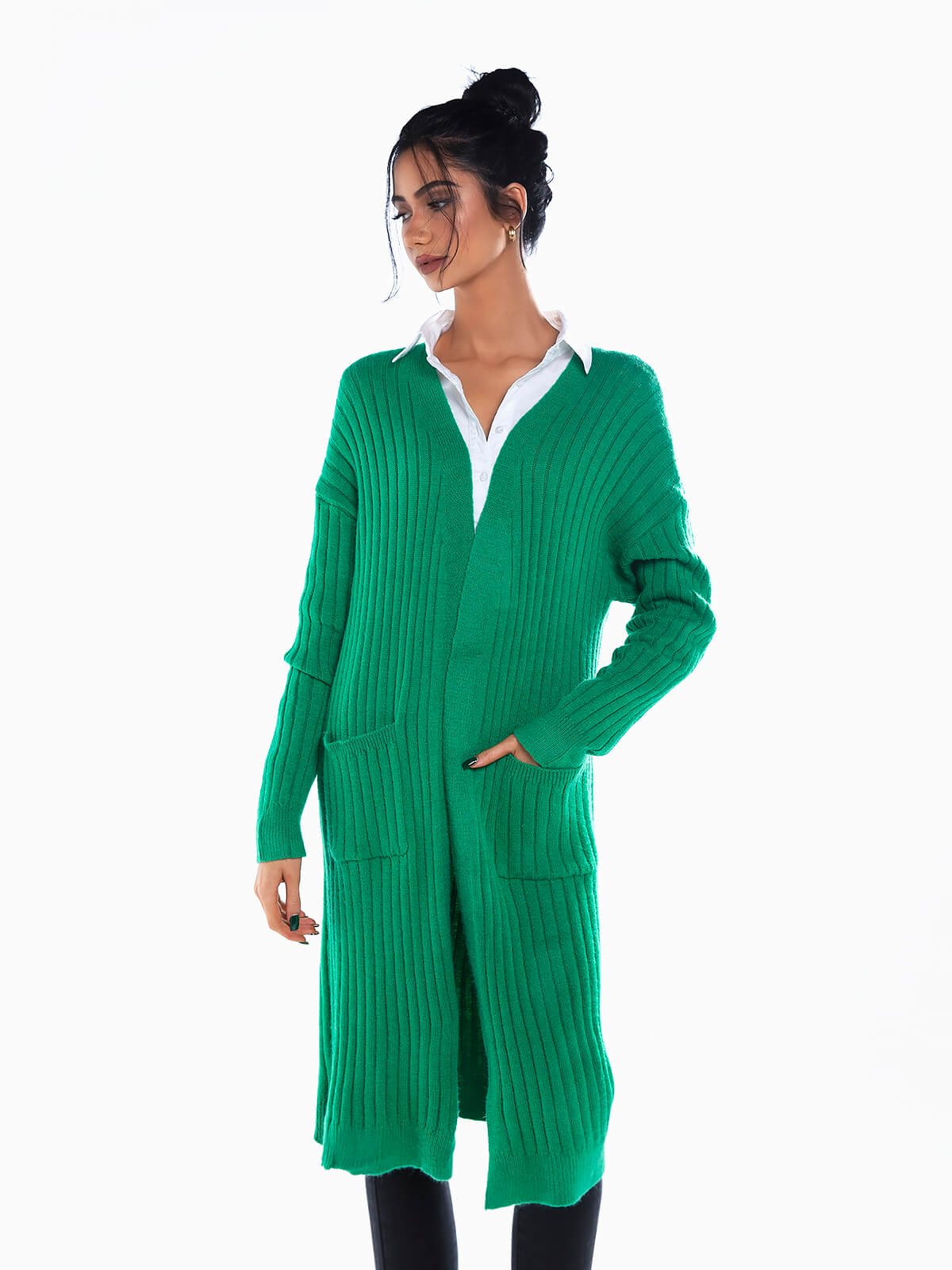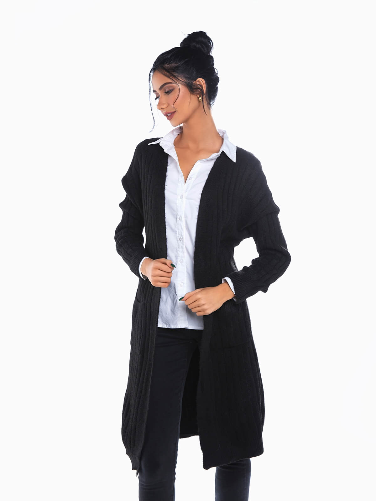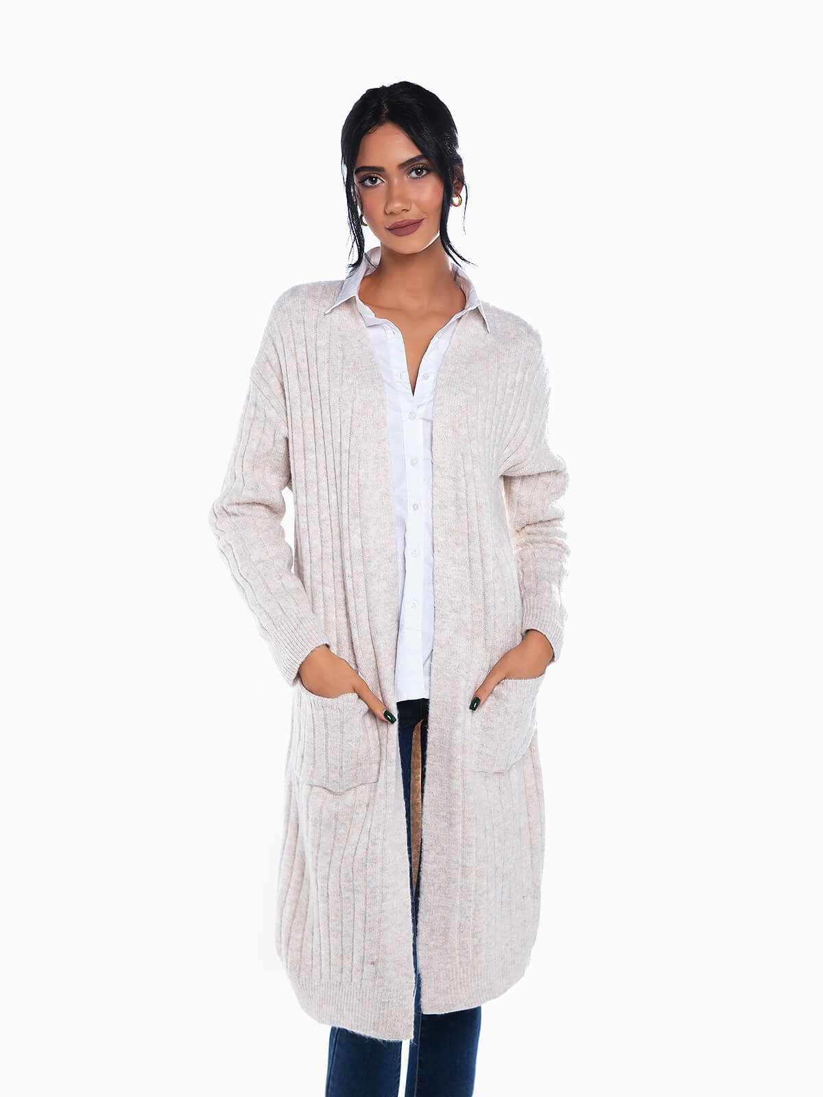 Casaco comprido em malha canelada para senhora. Cardigan aberto com dois bolsos quadrados à frente. Manga comprida. Acabamentos em nervuras.