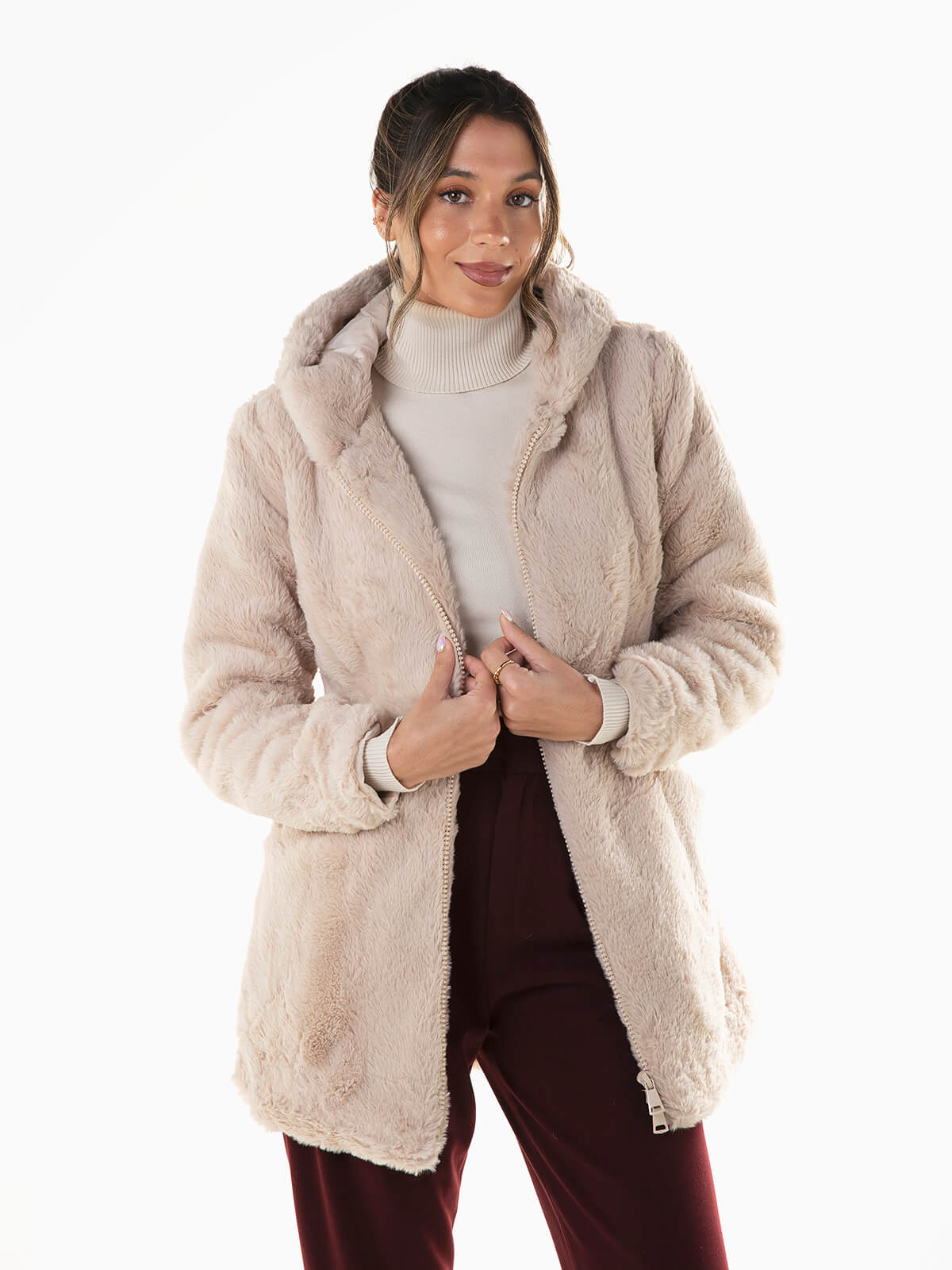 Casaco comprido com efeito pelo e capuz. Casaco manga comprida para senhora com interior forrado. 2 bolsos. Aperto de duplo fecho zíper.