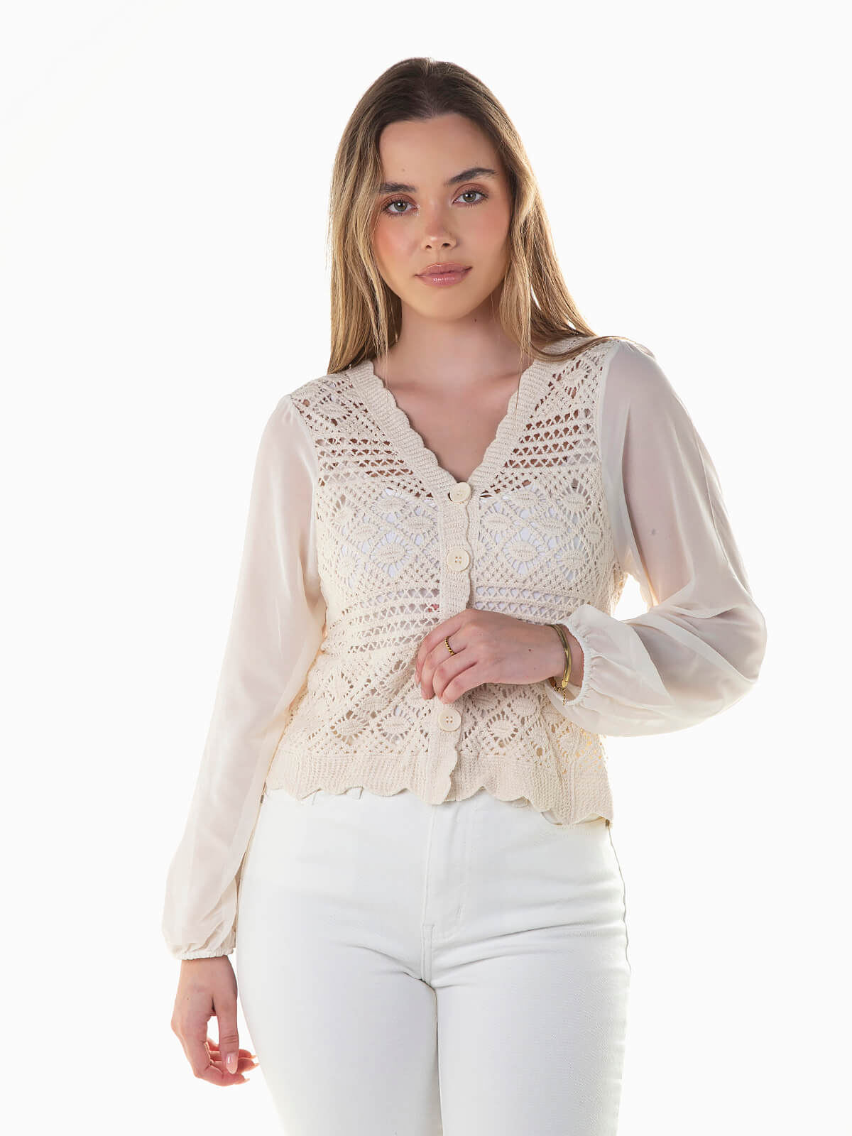 Casaco bege em crochet combinado com manga comprida em tecido fluído. Cardigan com decote em bico e punhos elásticos. Aperto de botões.