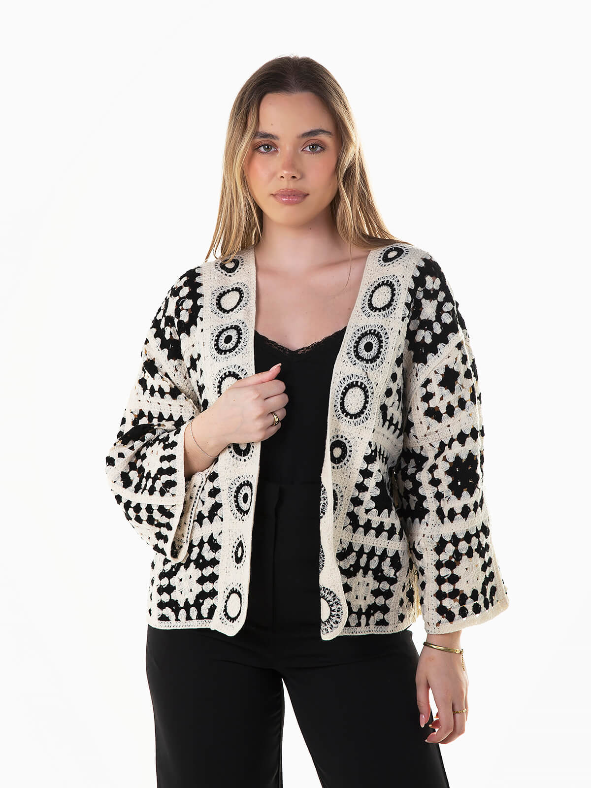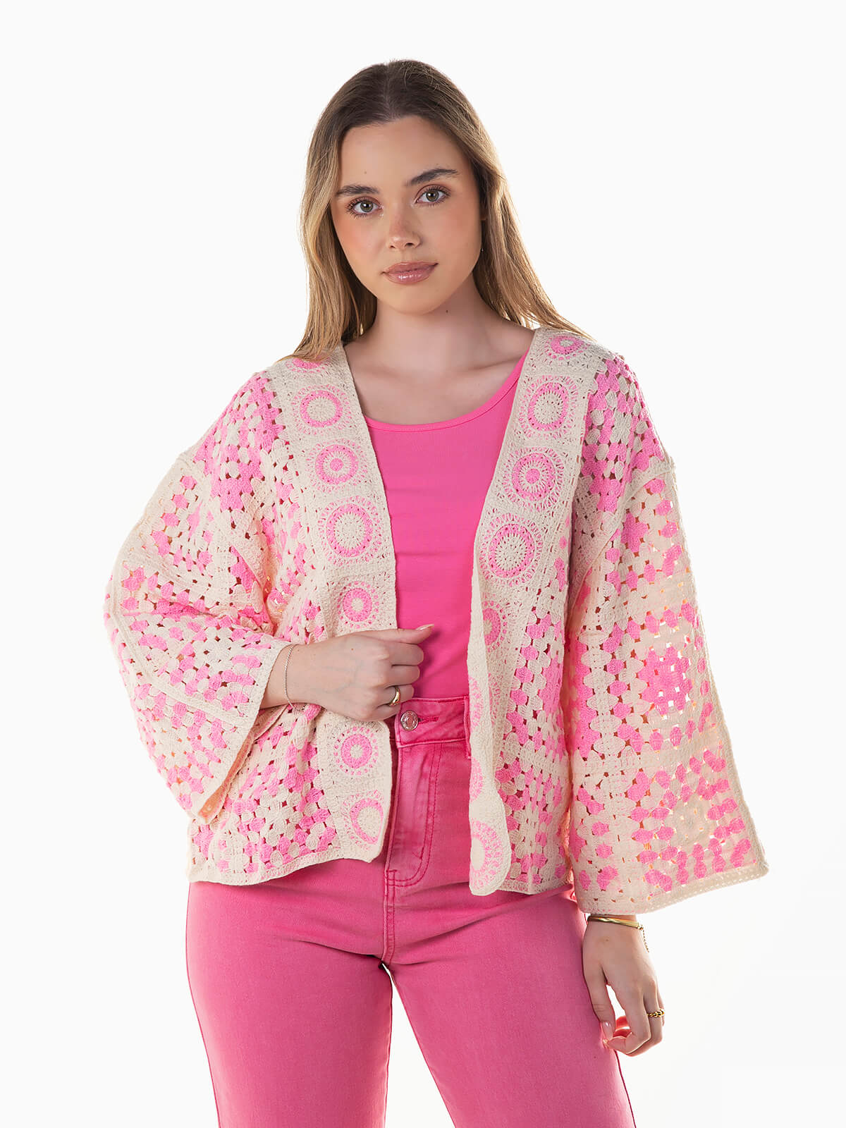 Casaco em crochet combinado com cor em contraste. Quimono aberto com manga 3/4 larga.