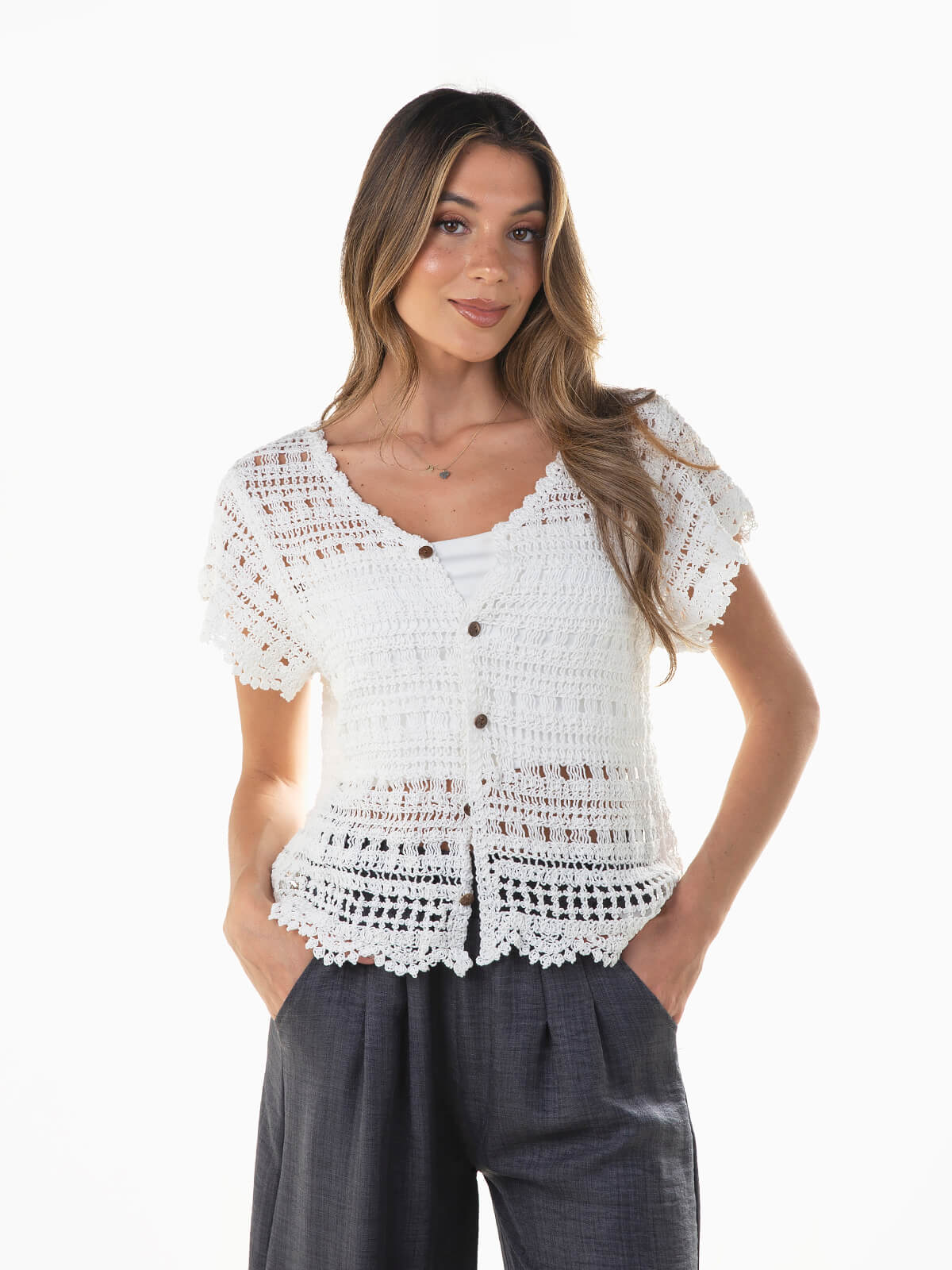 Casaco de manga curta em crochet para mulher. Casaco estilo boho com decote em V e aperto frontal de botões.
