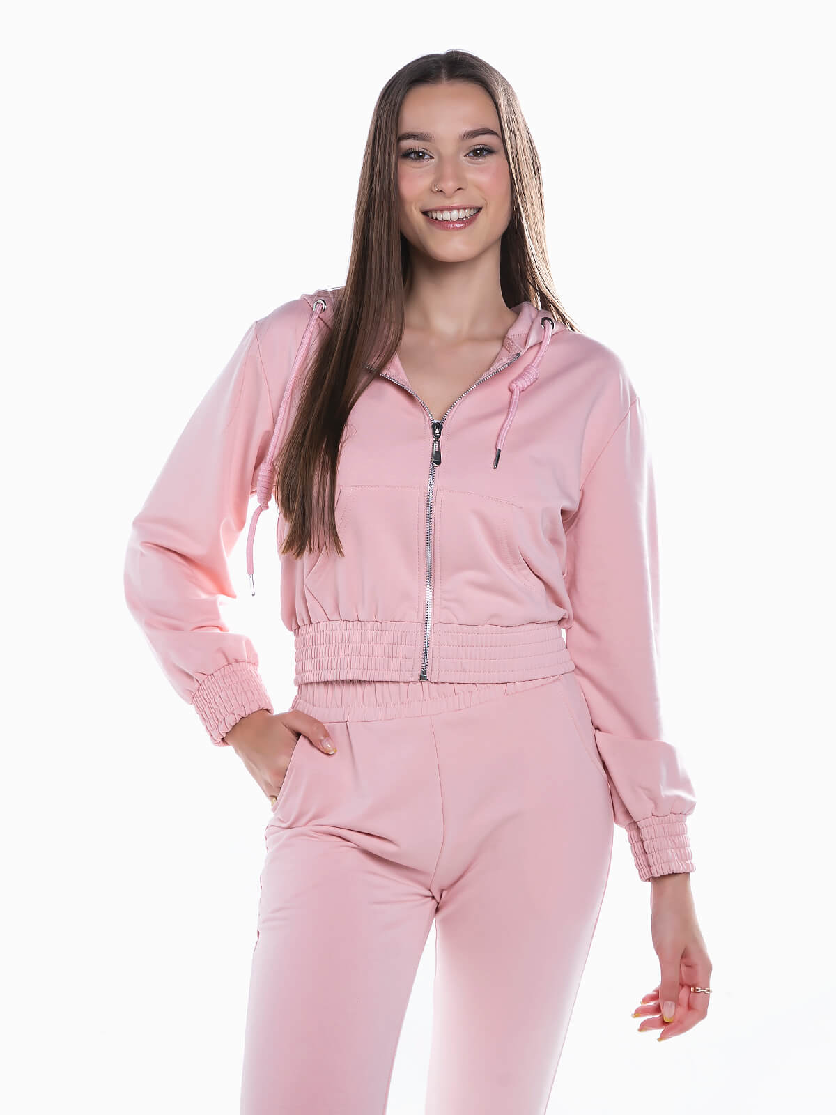 Casaco cropped desportivo para senhora. Casaco com capuz e cordão para ajustar. Extremidades elásticas. Manga comprida.