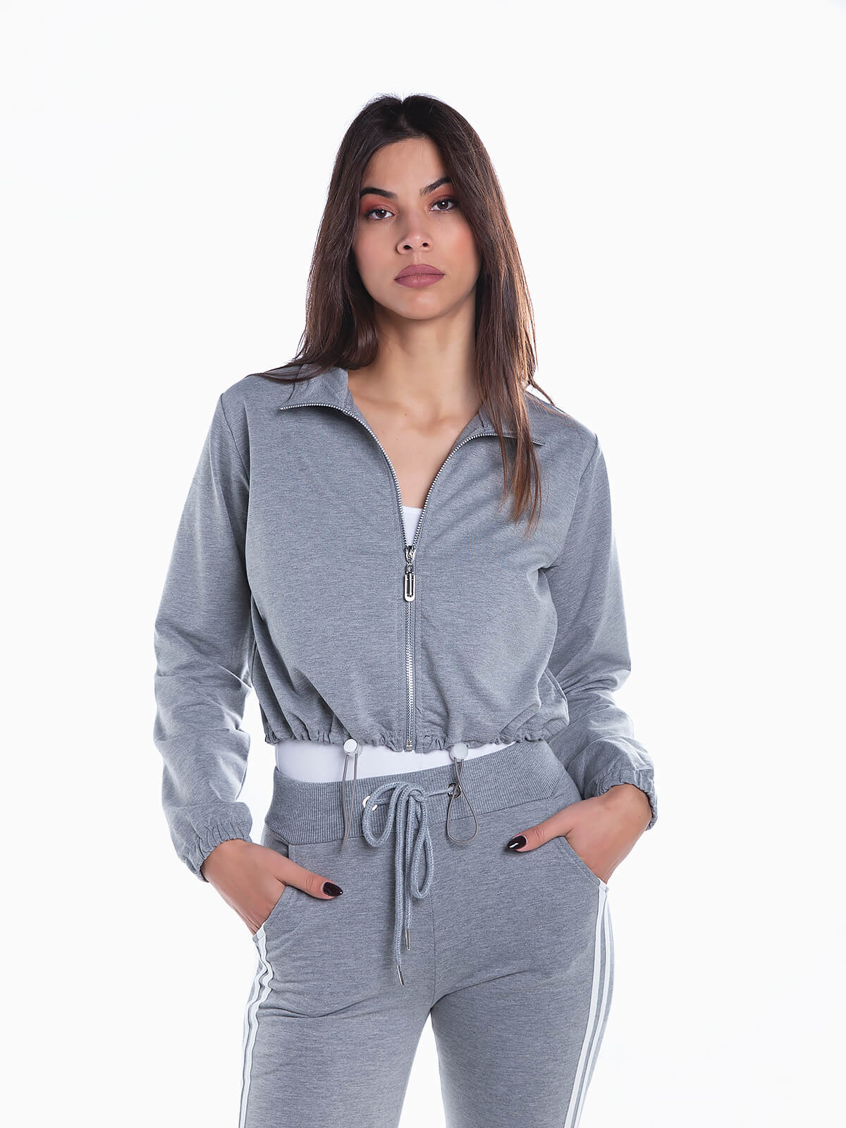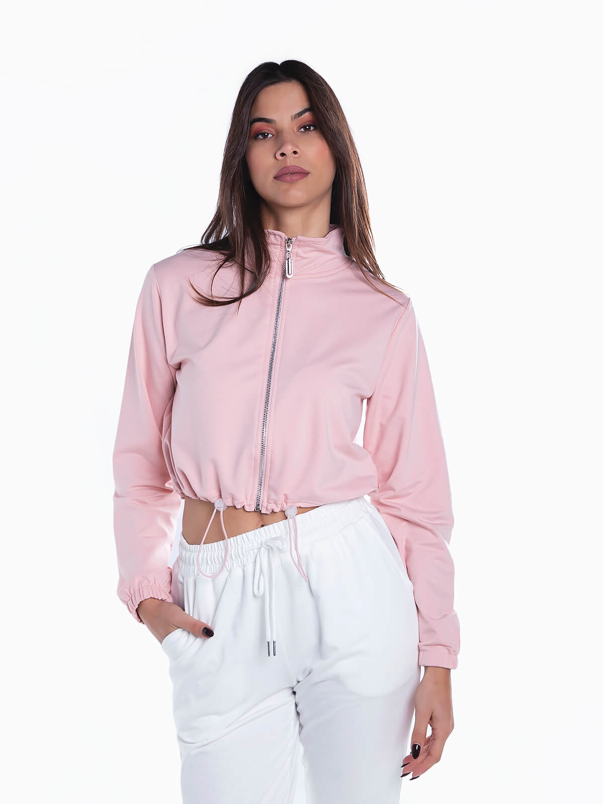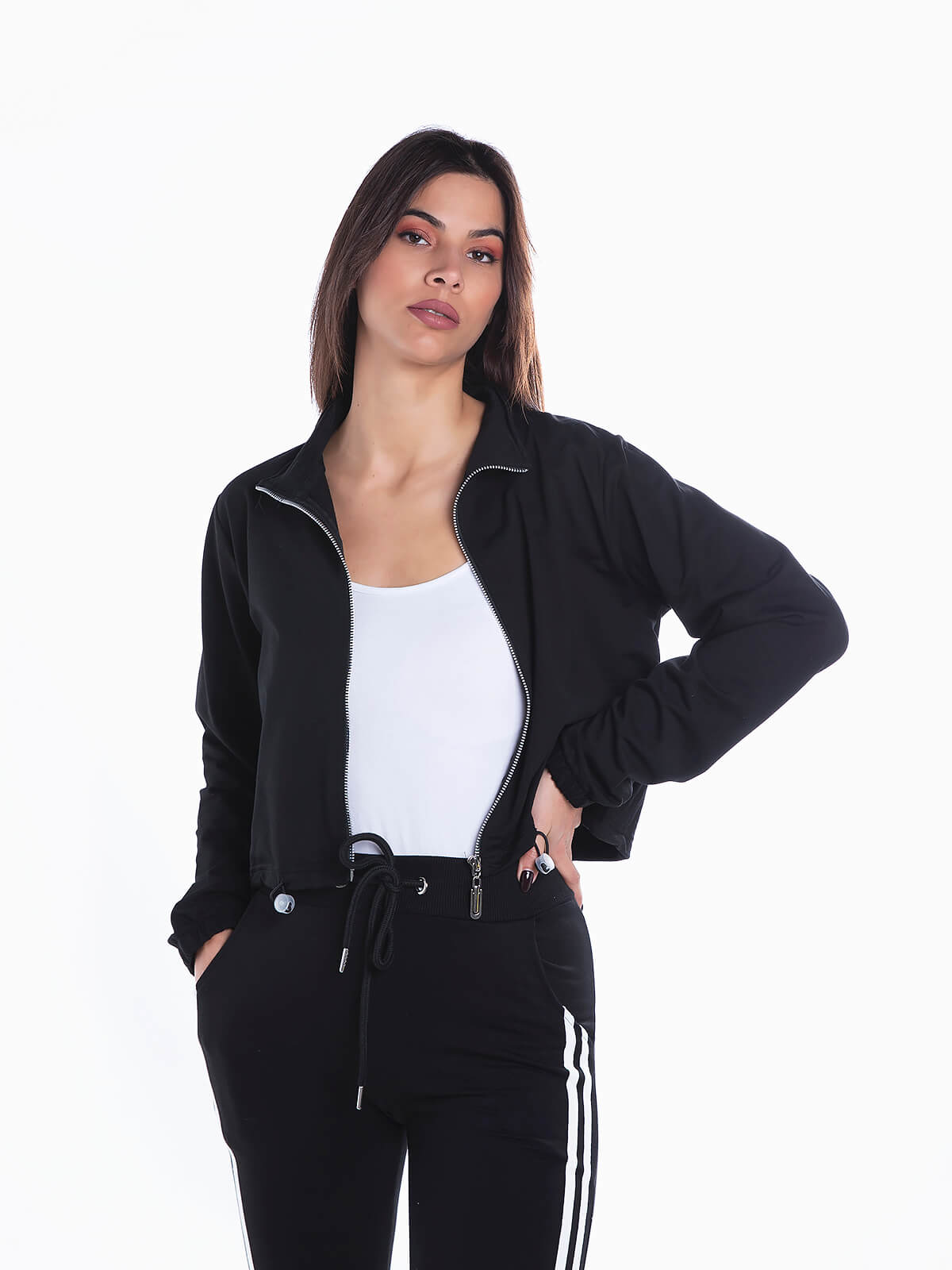 Casaco cropped desportivo de gola subida. Cós com cordão elástico para ajustar. Punhos elásticos. Aperto de fecho zíper.