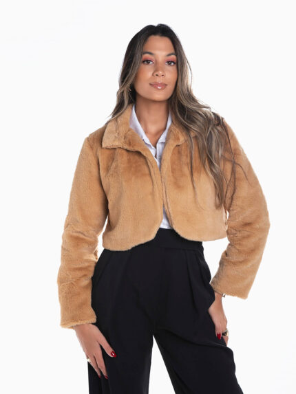 Casaco cropped estilo blazer com aperto cruzado de botões. Casaco bege claro com manga comprida franzida e bolso. Acabamentos elásticos. Interior forrado.