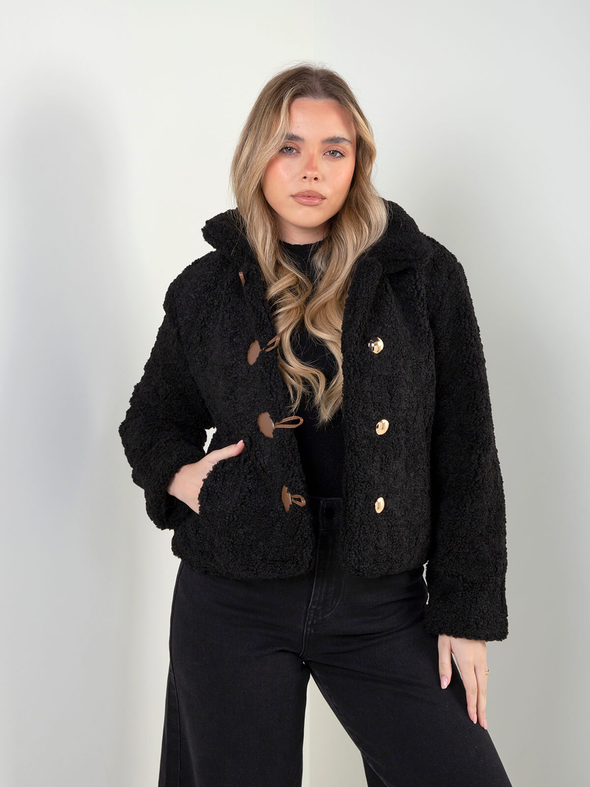 Casaco curto em tecido efeito borrego, com toque macio e interior forrado. Modelo com gola, mangas compridas e fechos decorativos à frente. Ideal para looks de inverno, combina facilmente com calças de alfaiataria ou ganga.