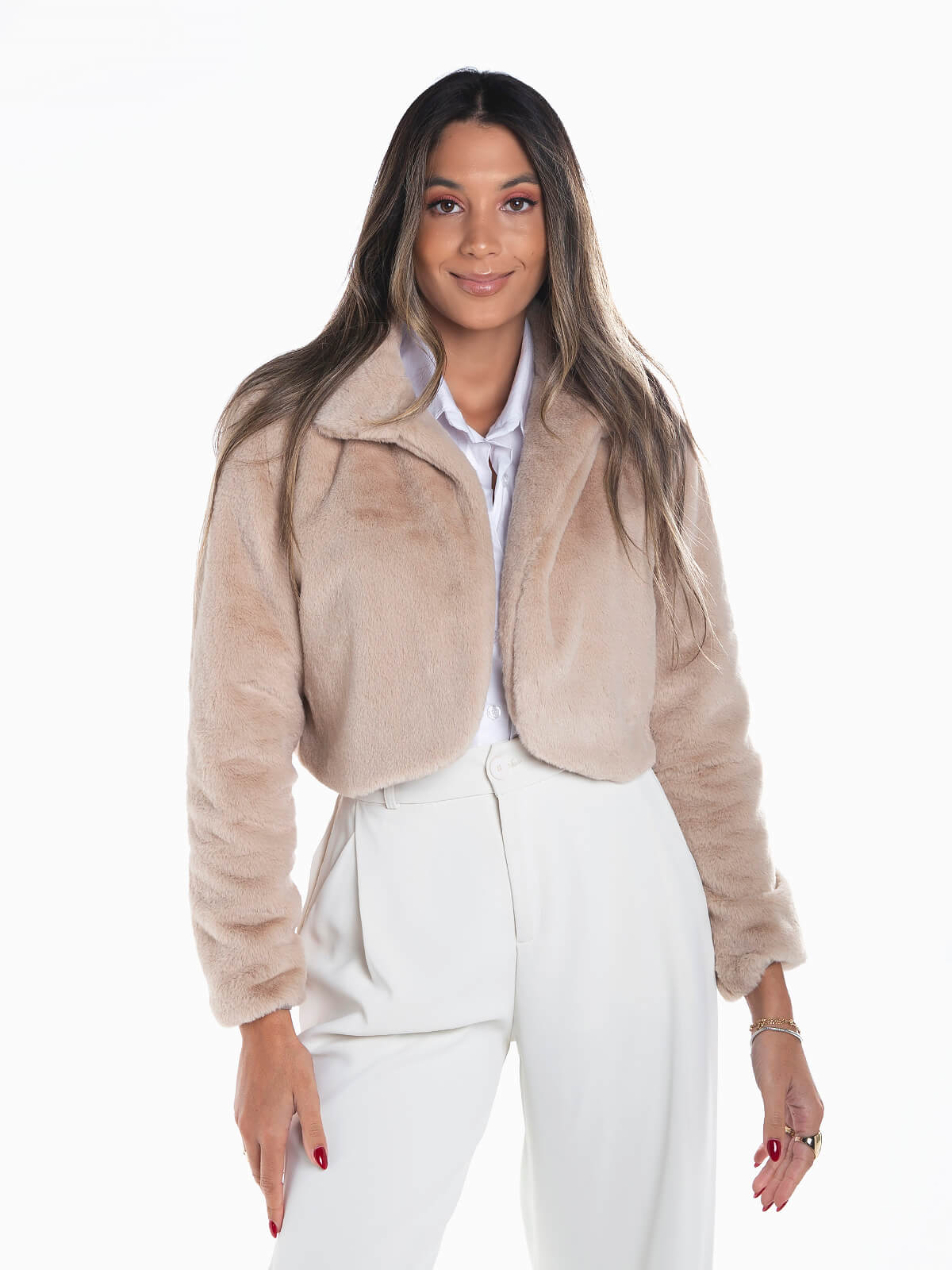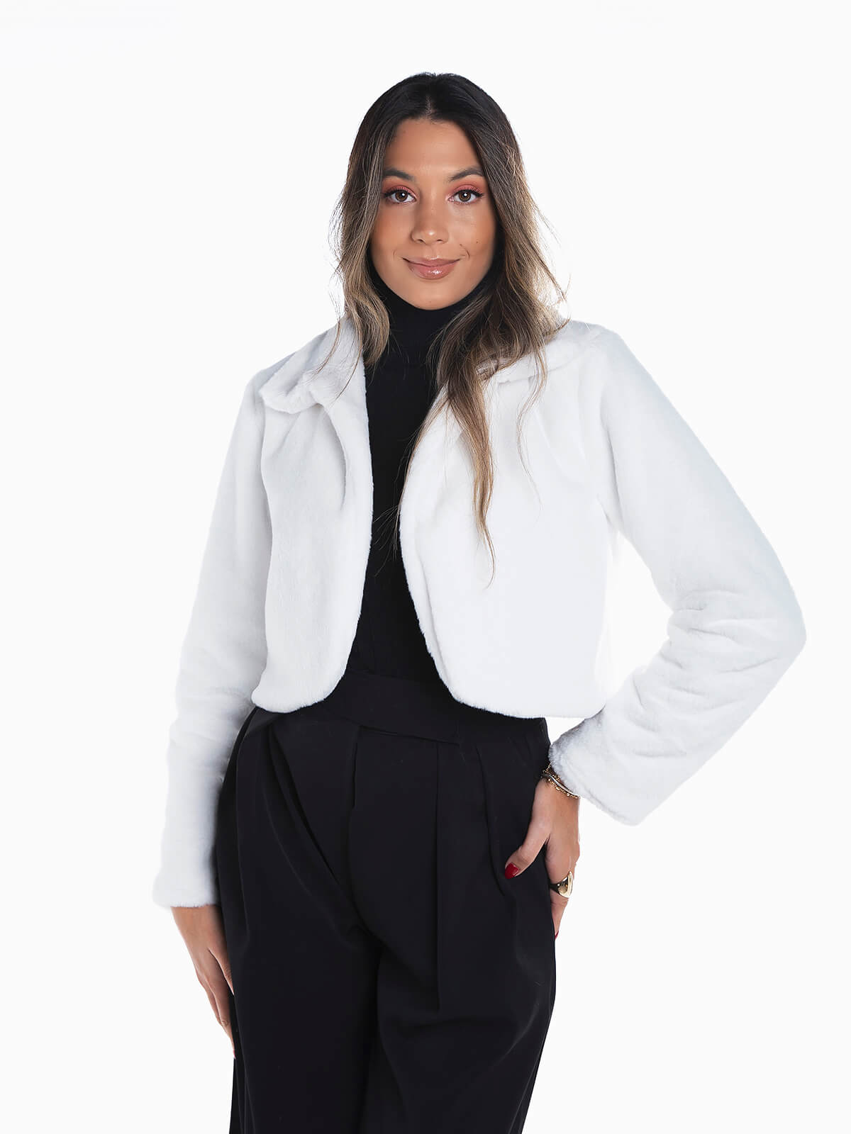 Casaco curto em pelo sintético para senhora. Casaco aberto de manga comprida com interior forrado em tecido. Gola de aba.