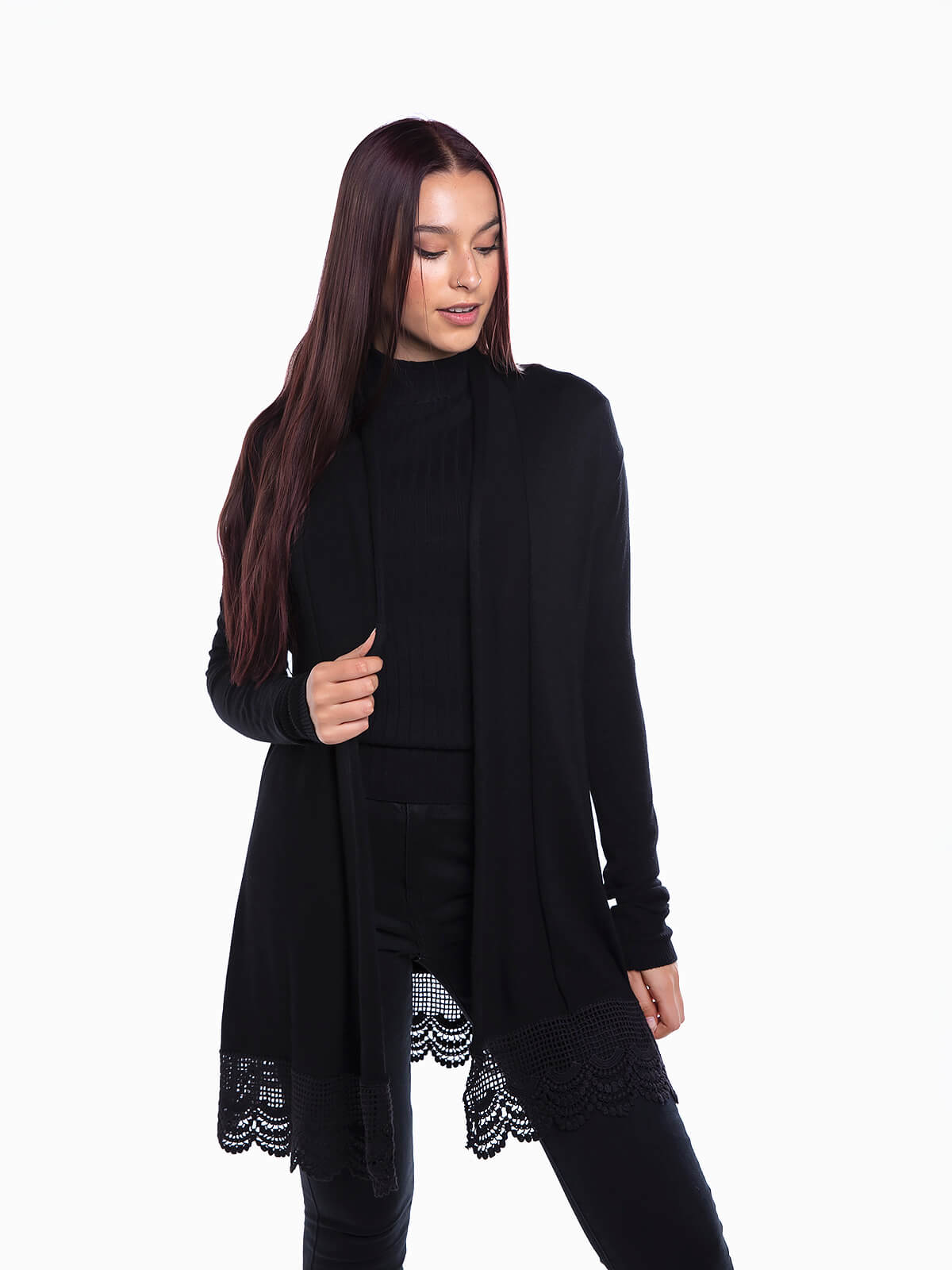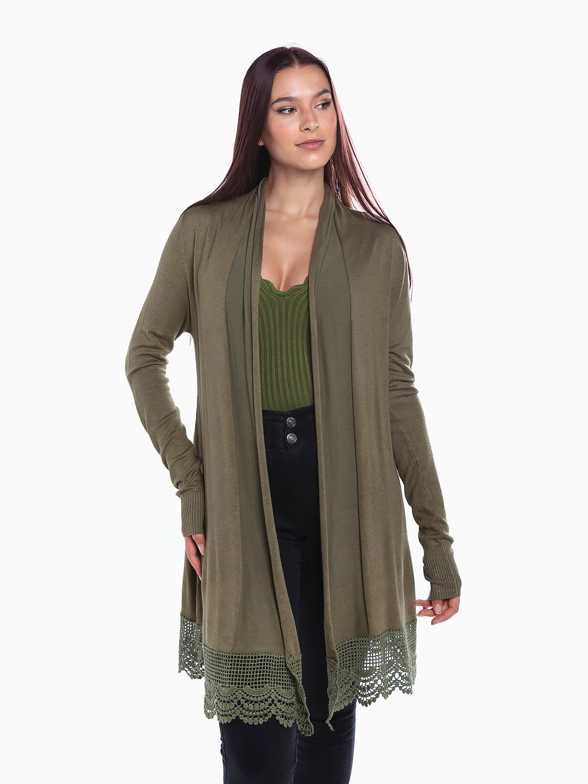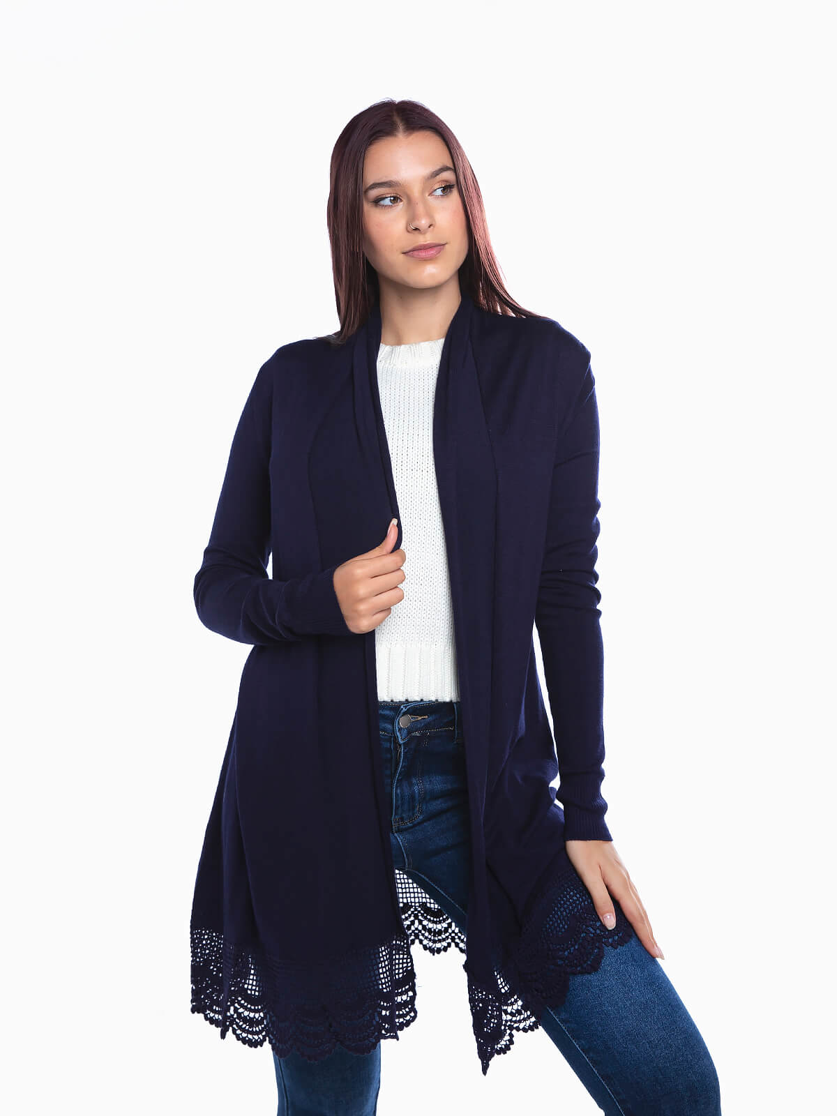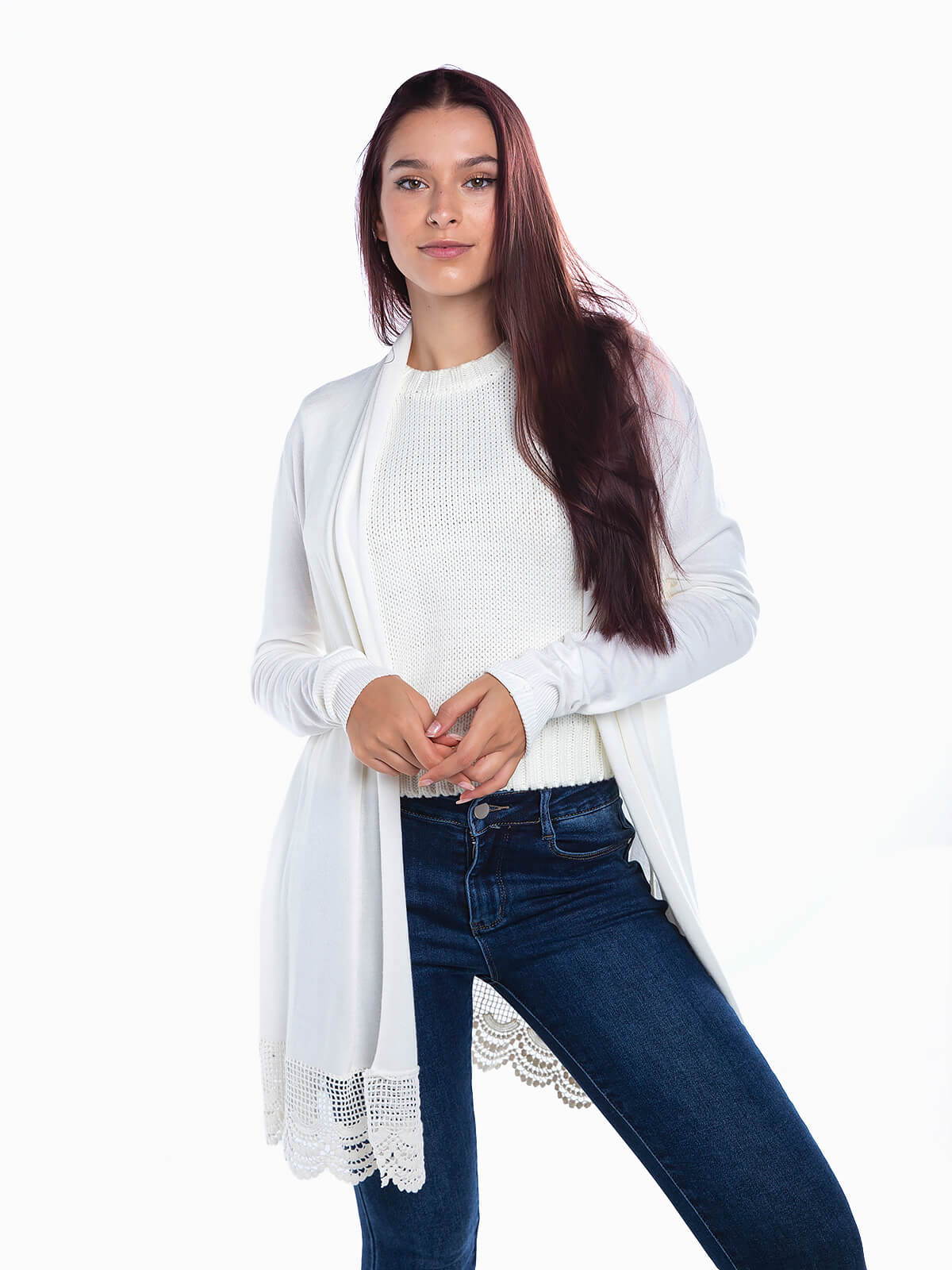 Casaco de malha aberto com encaixe em crochet na base. Casaco malha comprido para senhora. Manga comprida.