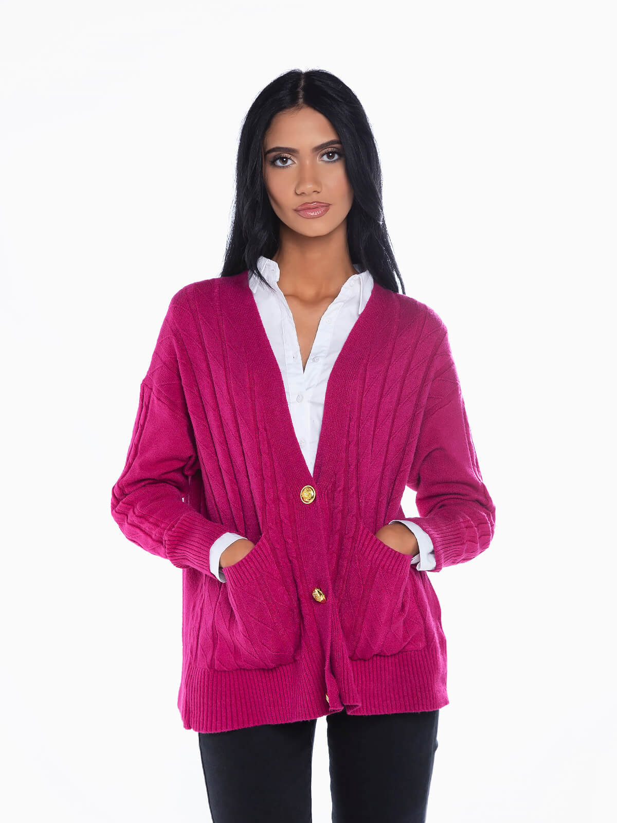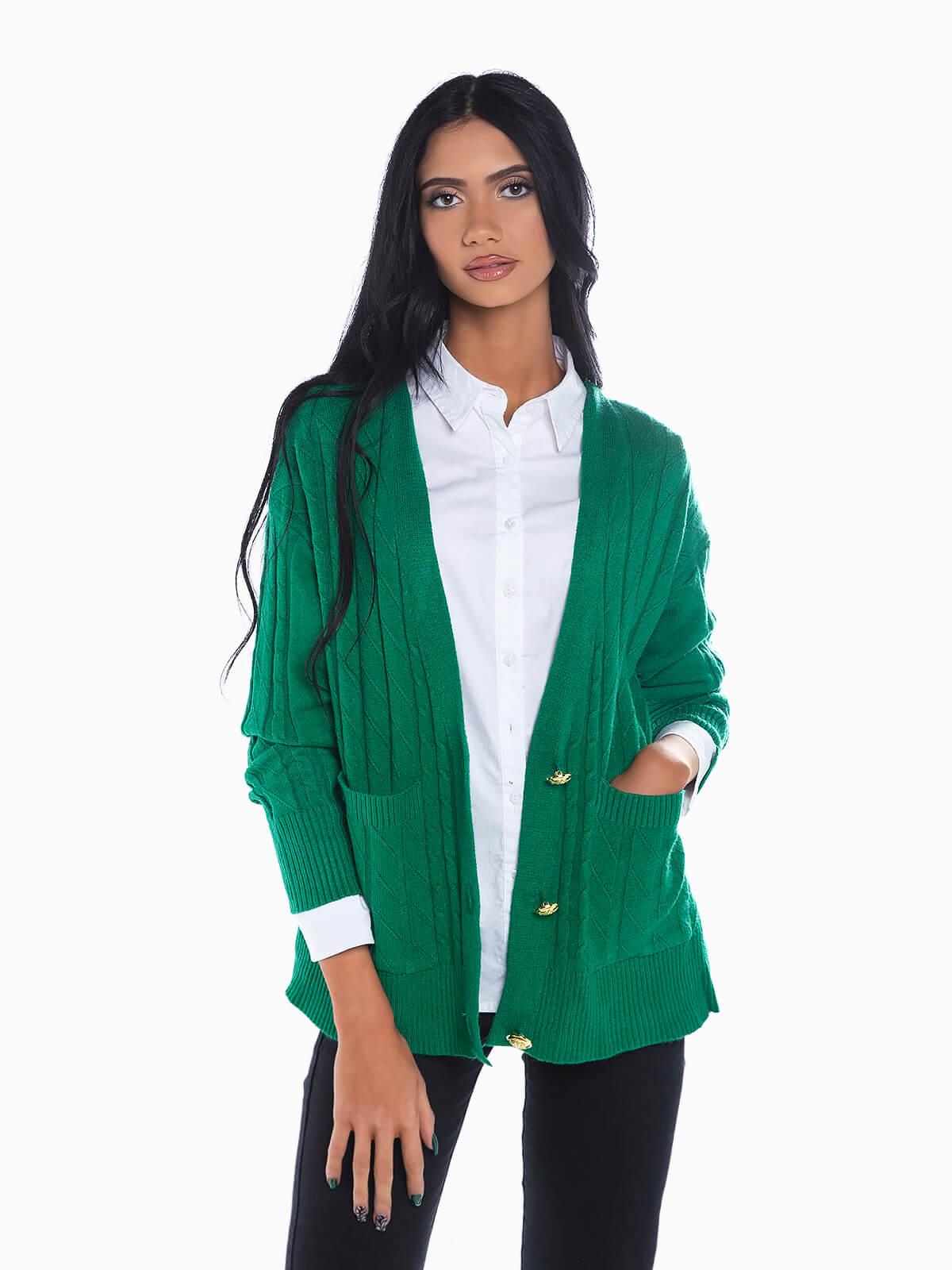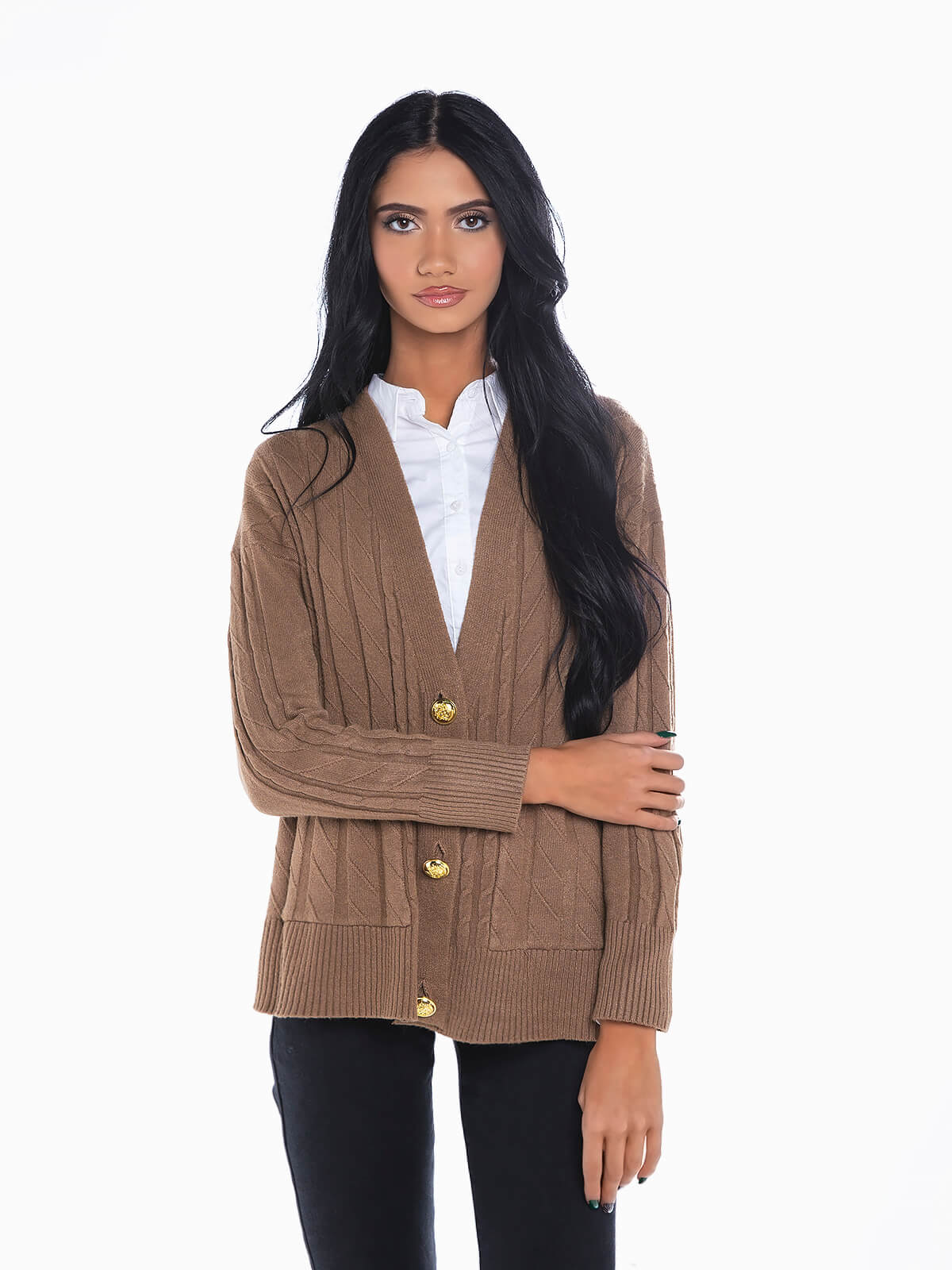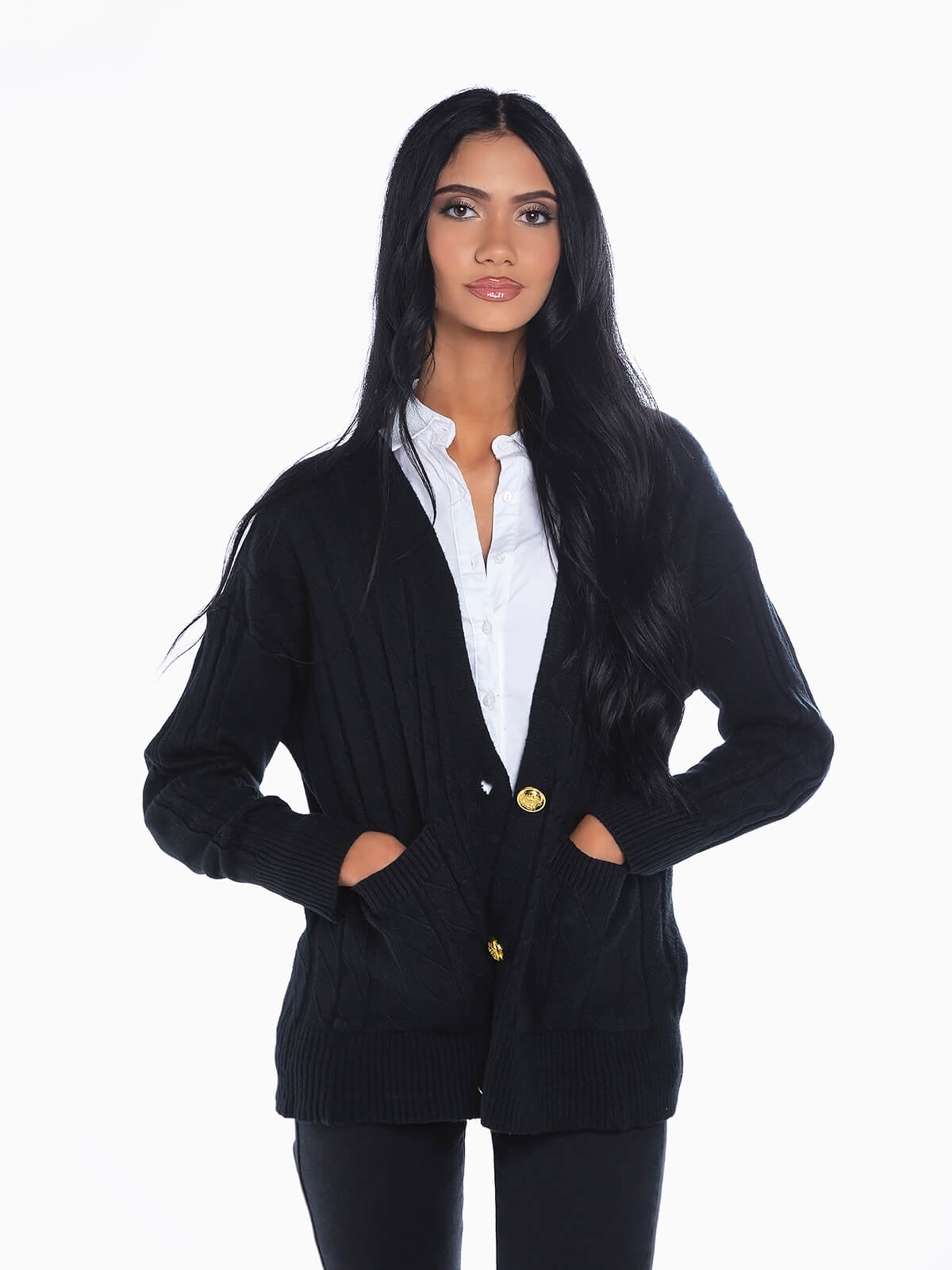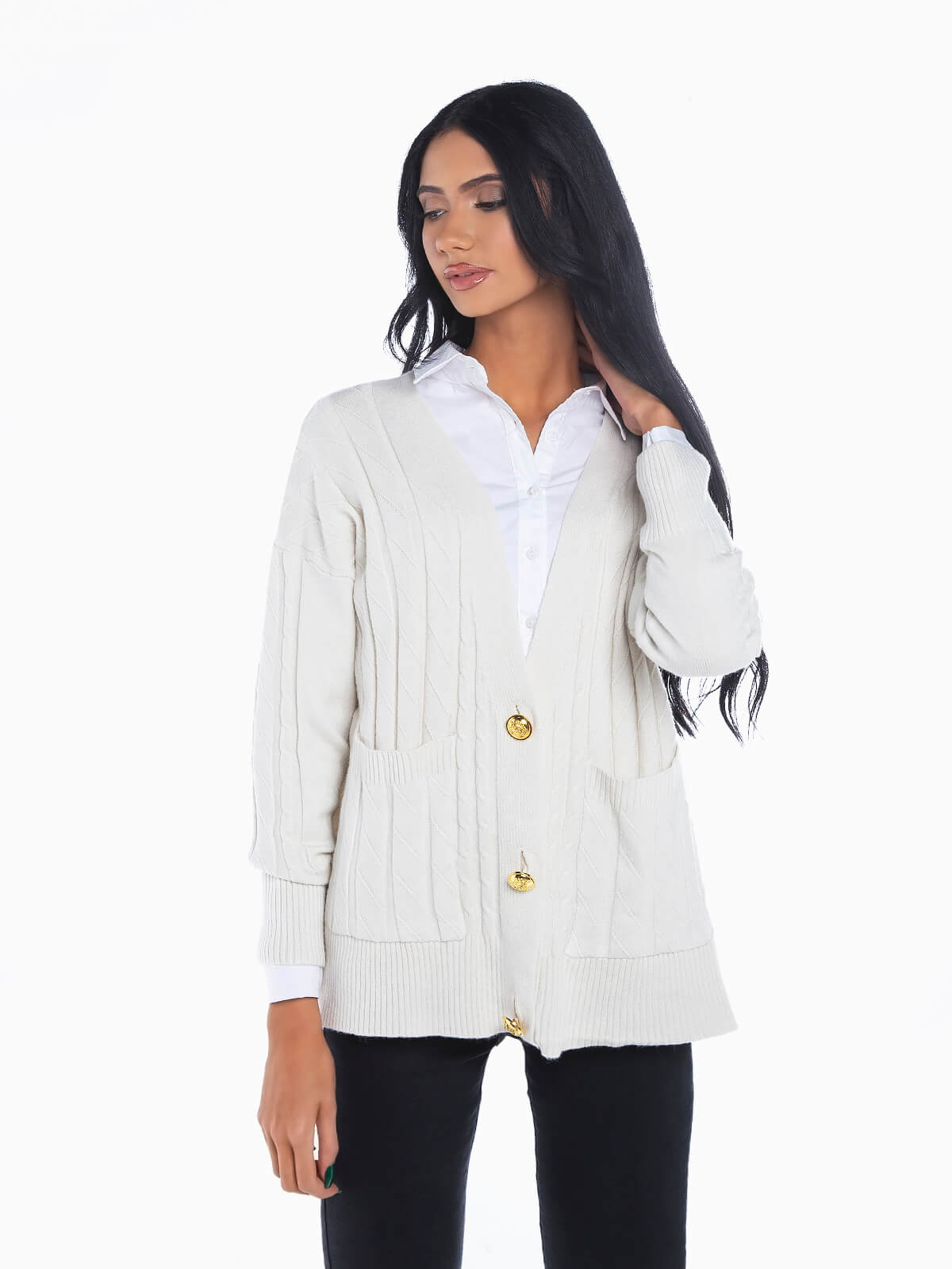 Casaco de malha com aperto de botões dourados. Casaco estruturado com decote em bico e manga comprida. Extremidades caneladas.