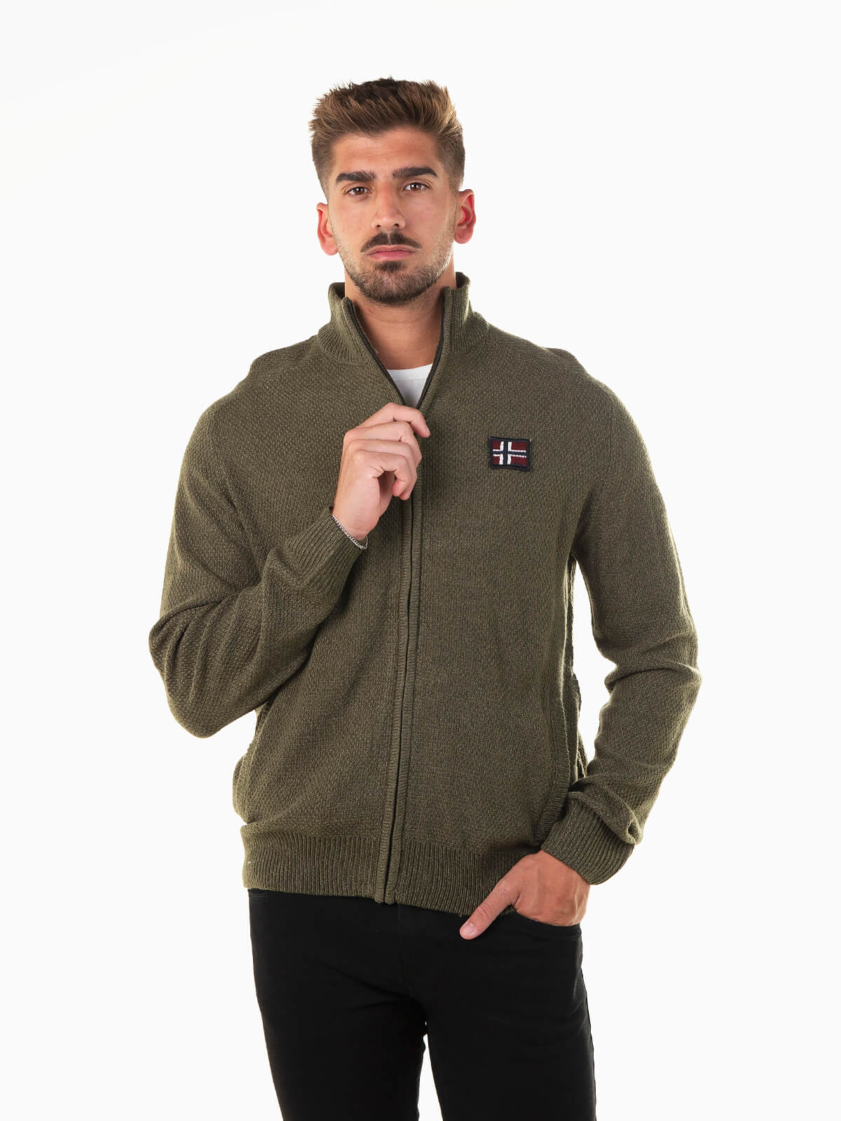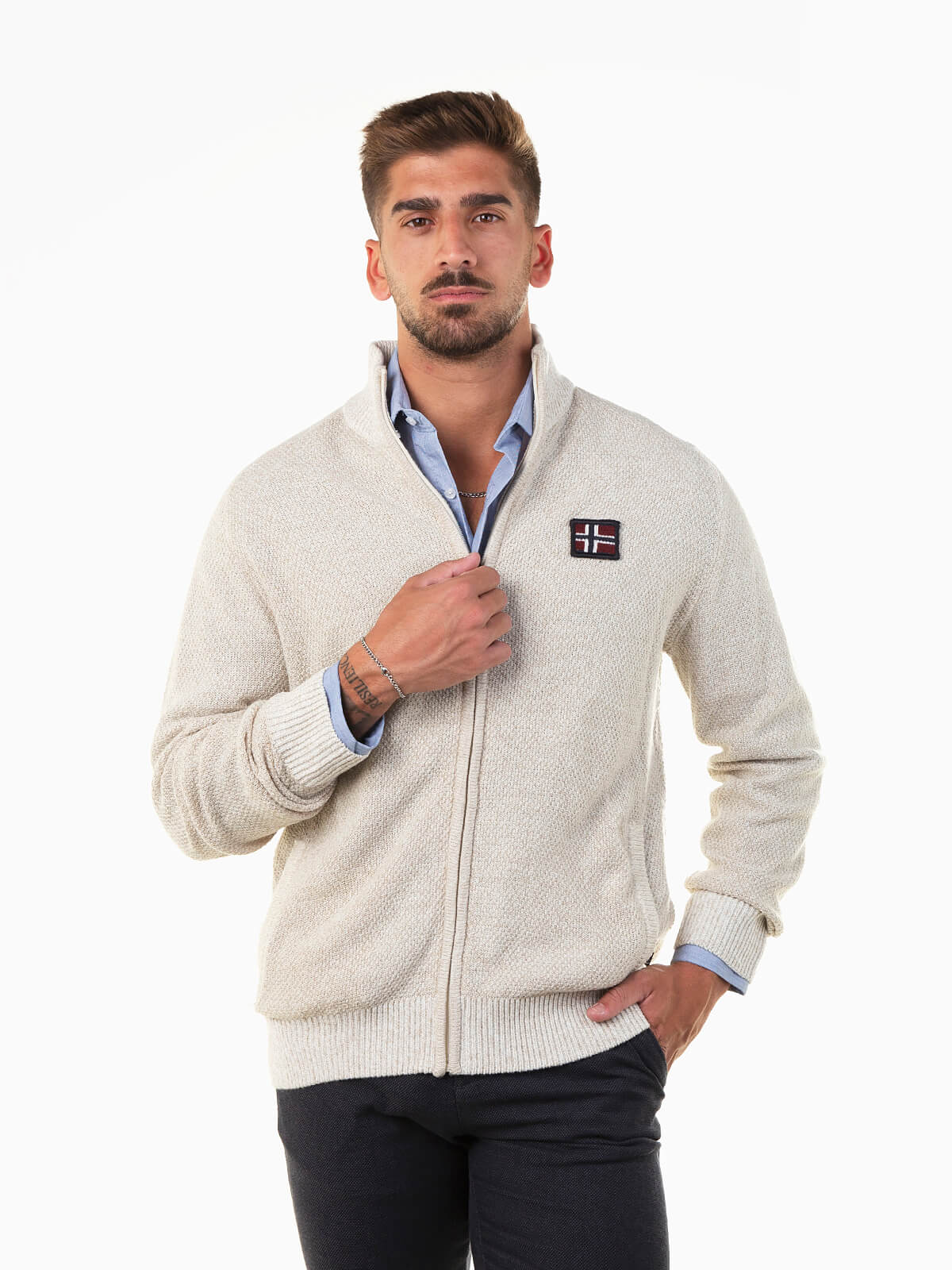 Casaco de malha estruturada para homem, com símbolo bordado no peito para um toque distinto. Modelo com gola subida, aperto em fecho zíper e dois bolsos práticos na frente. Versátil e confortável, é a escolha ideal para um look casual ou para complementar coordenados de fim de semana.