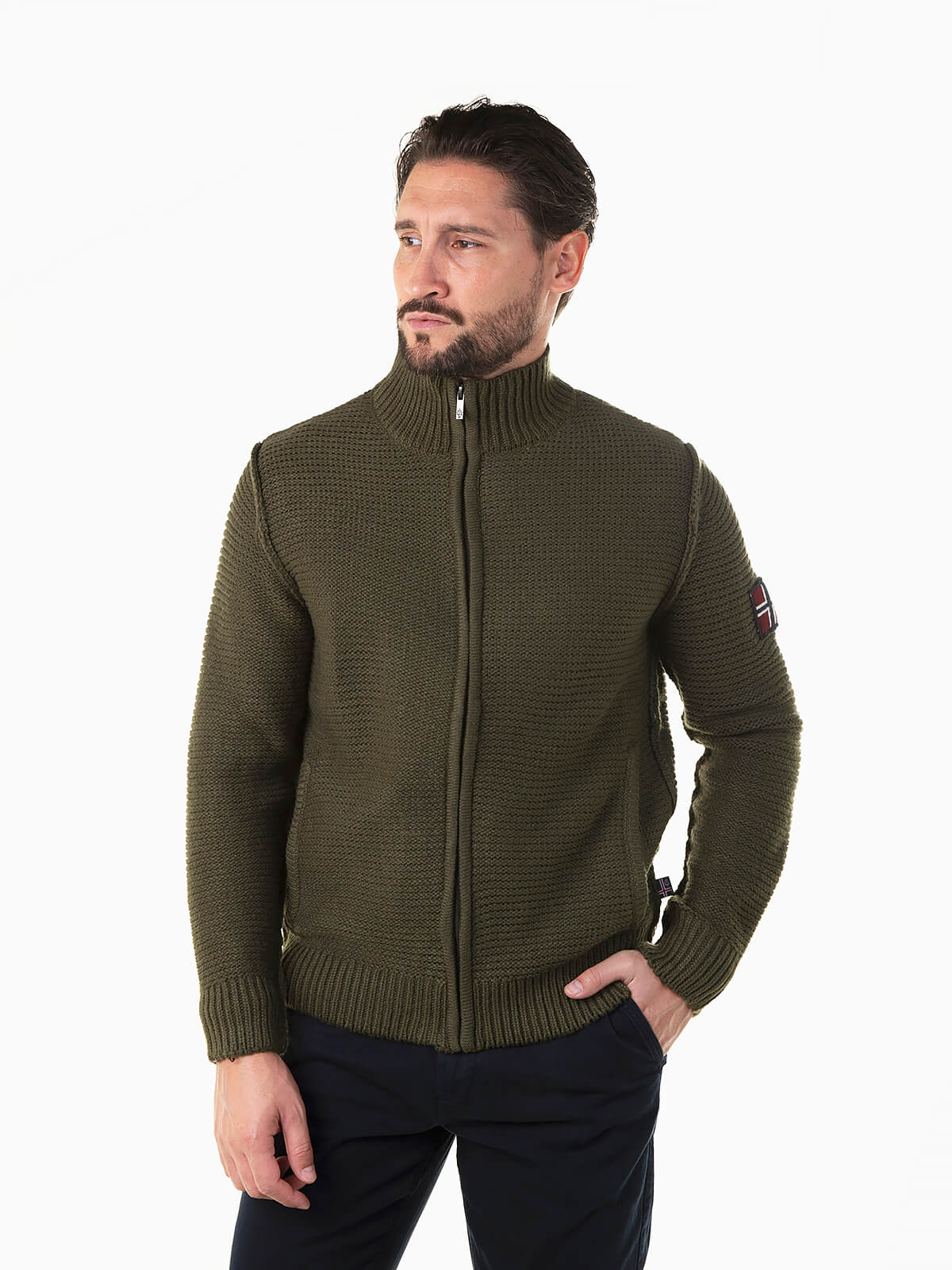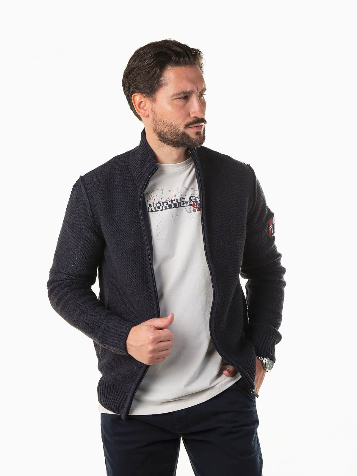 Casaco de malha estruturada para homem, com símbolo bordado na manga para um toque distinto. Modelo com gola subida, aperto em fecho zíper e dois bolsos práticos na frente. Versátil e confortável, é a escolha ideal para um look casual ou para complementar coordenados de fim de semana.