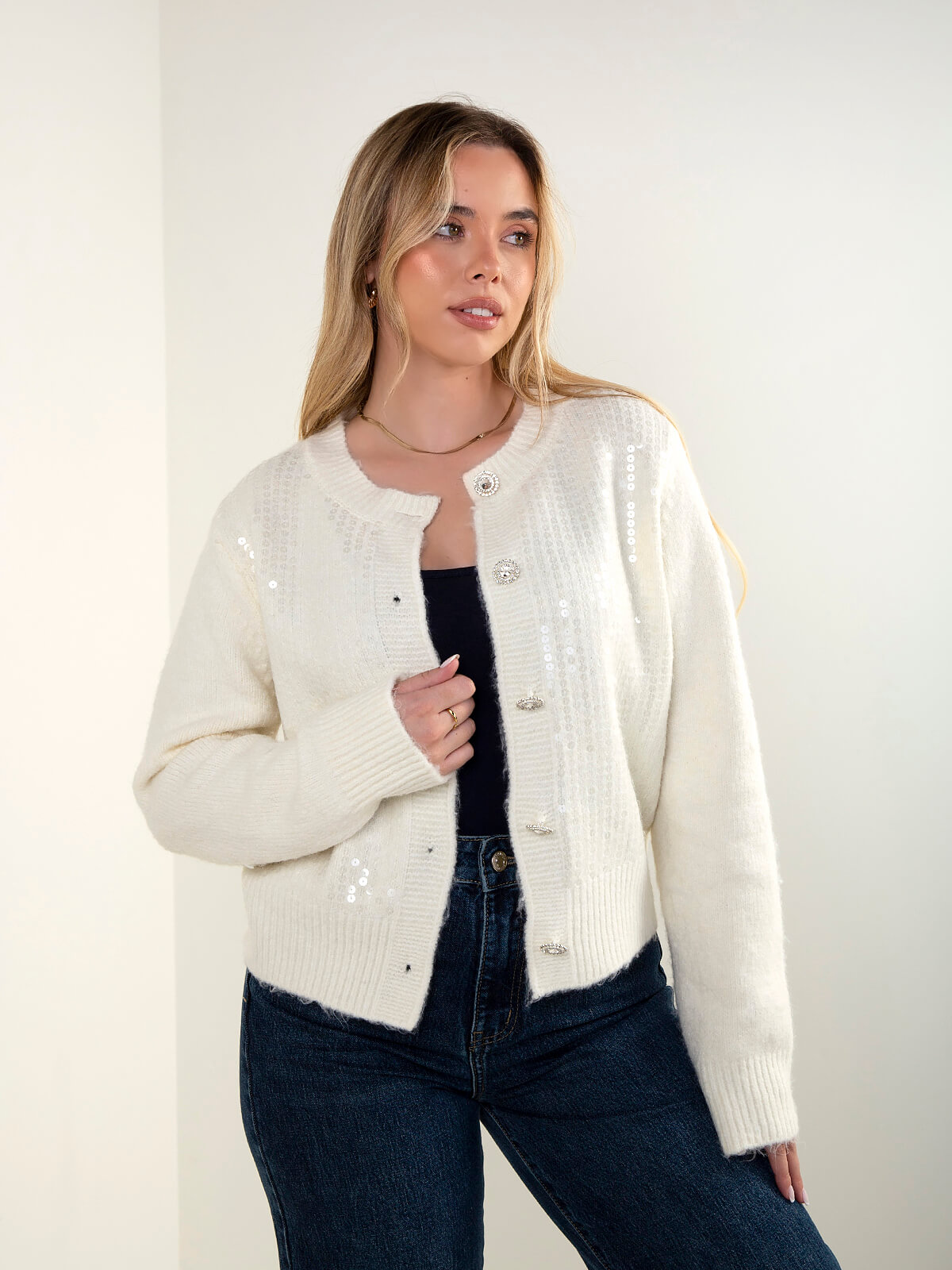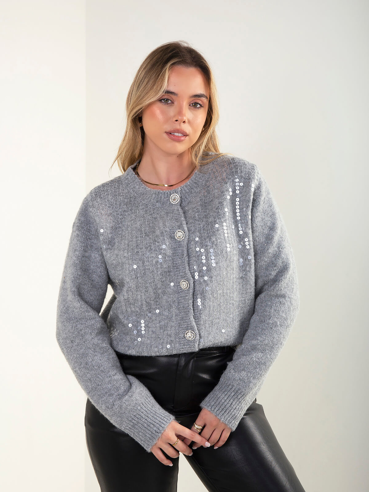Casaco de malha com lantejoulas, decote redondo e aperto de botões. Macio e confortável, perfeito para looks casuais ou mais arranjados. Um básico com brilho dentro da moda acessível.