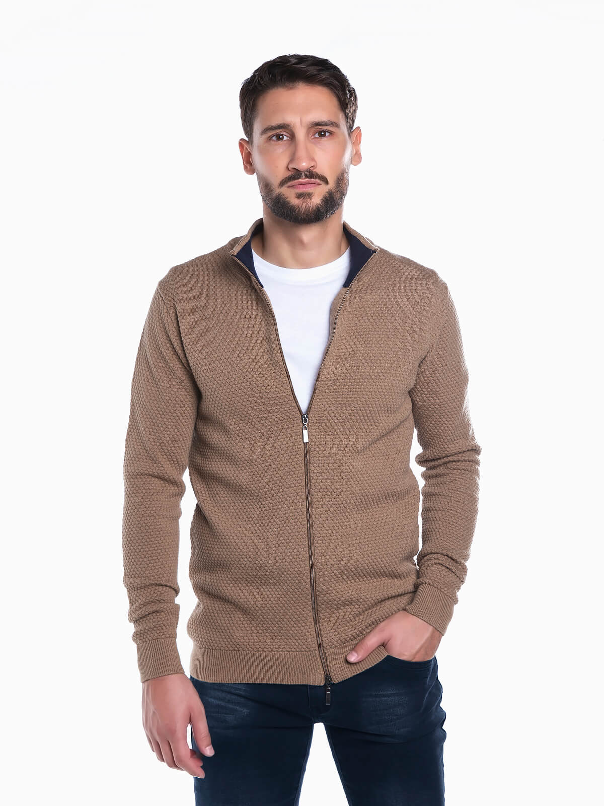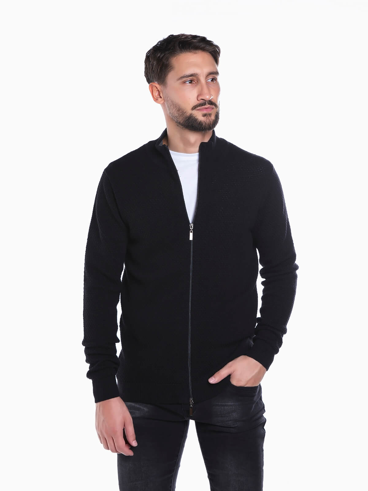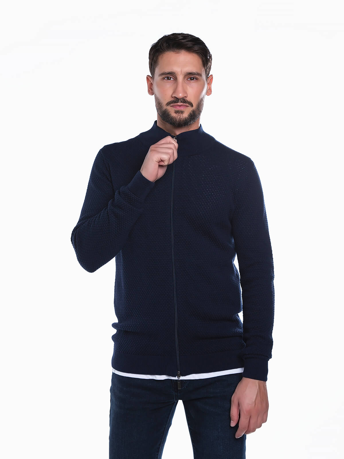 Casaco em malha com textura para homem. Cardigan em tecido de algodão com gola subida. Manga comprida. Extremidades caneladas. Aperto de fecho éclair.
