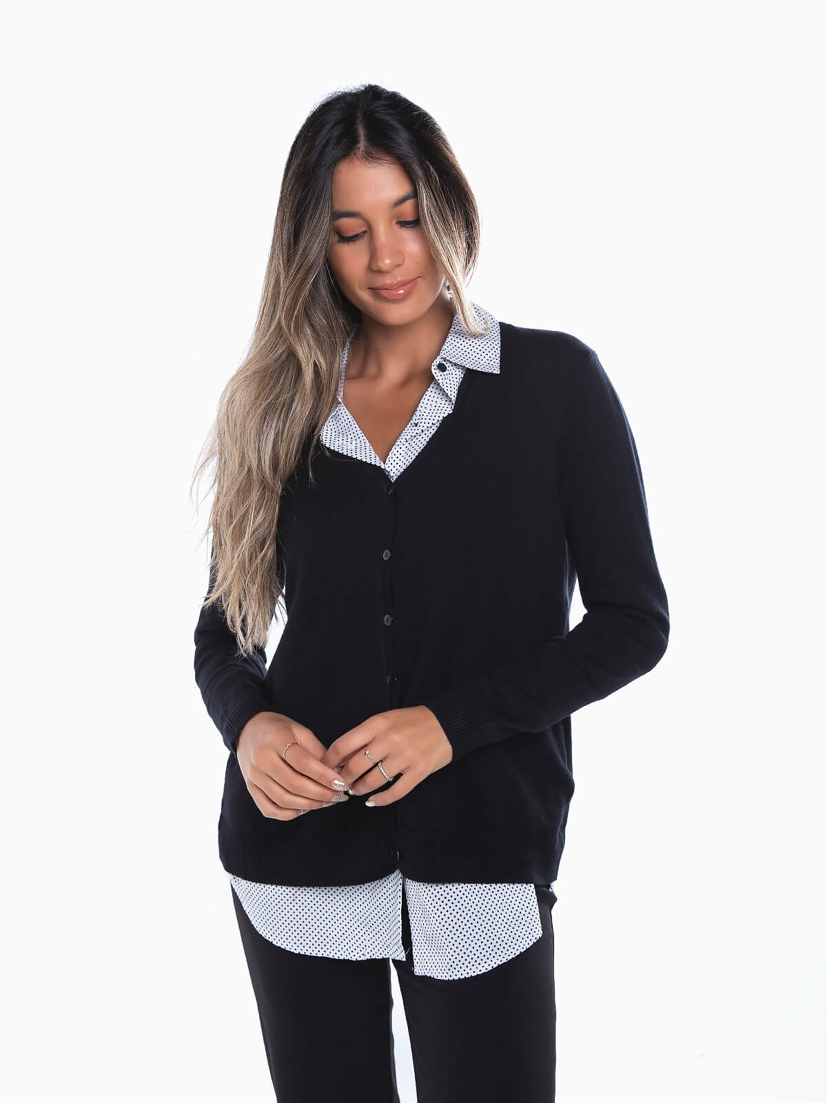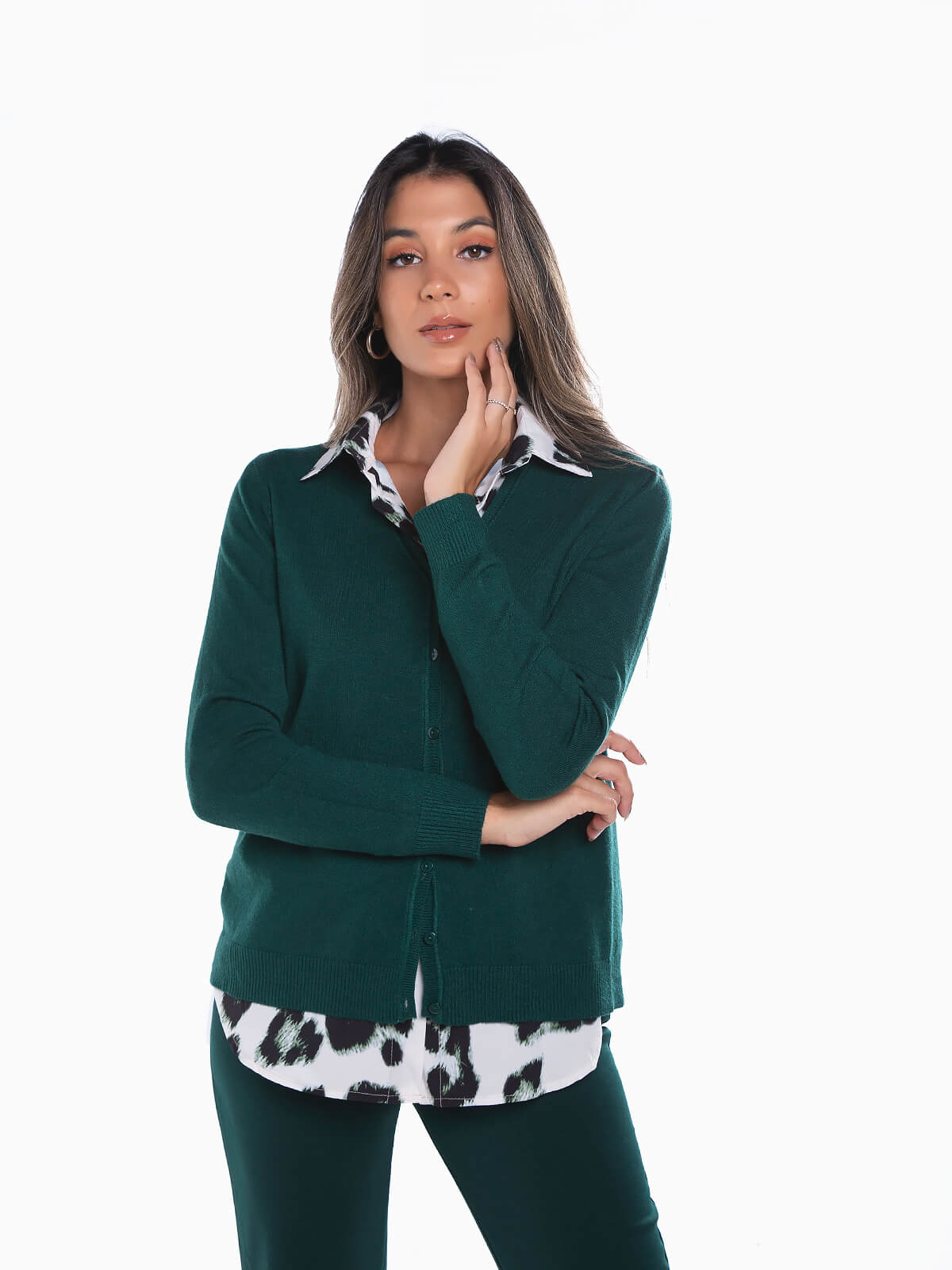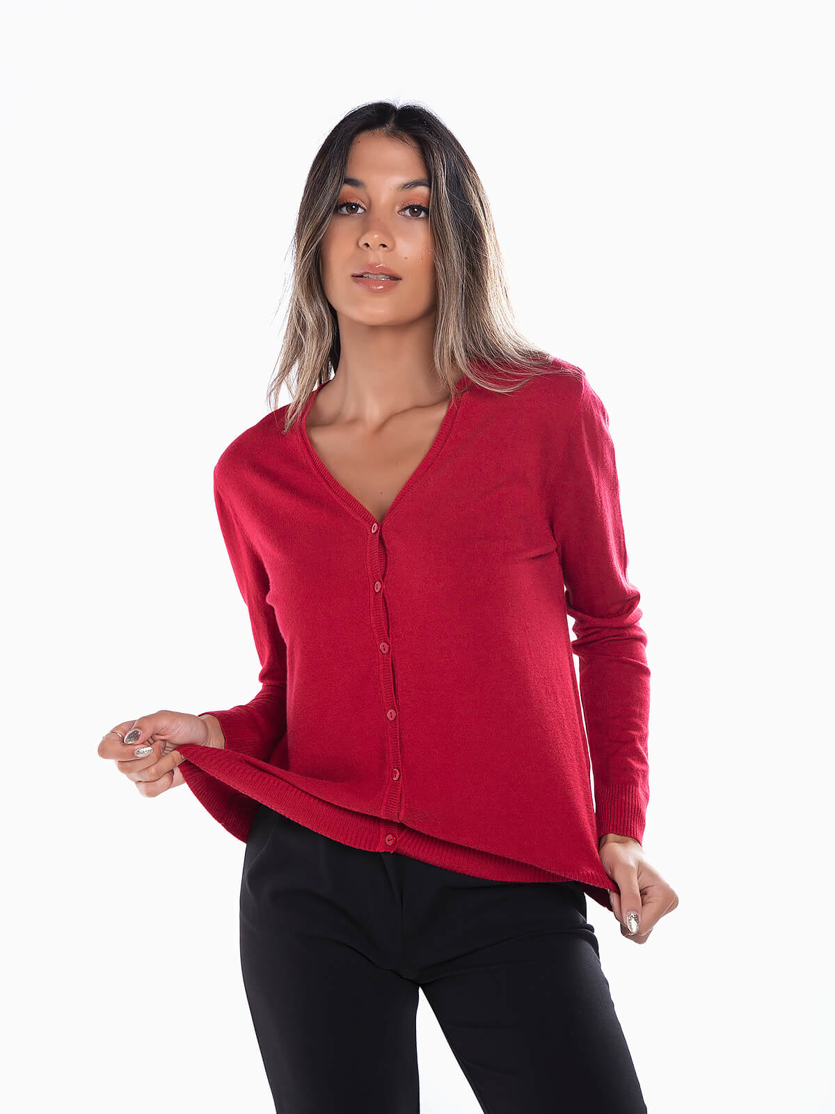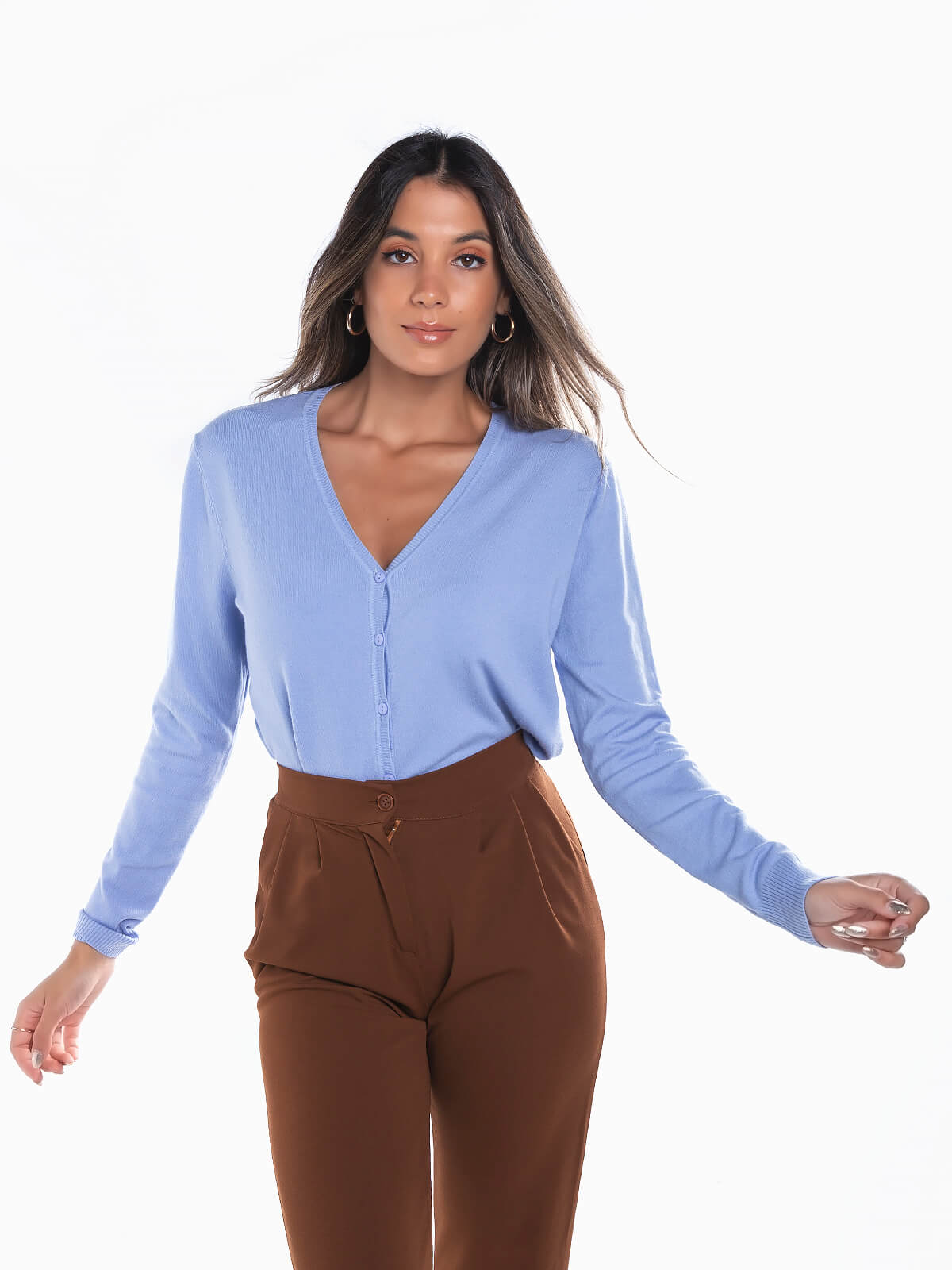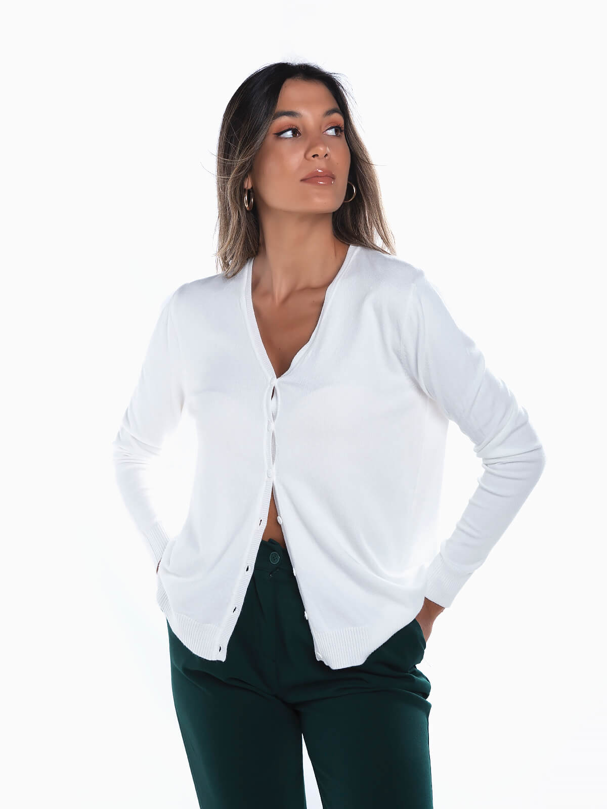 Casaco de malha com decote em V para senhora. Cardigan fino com punhos elásticos e aperto de botões na frente.