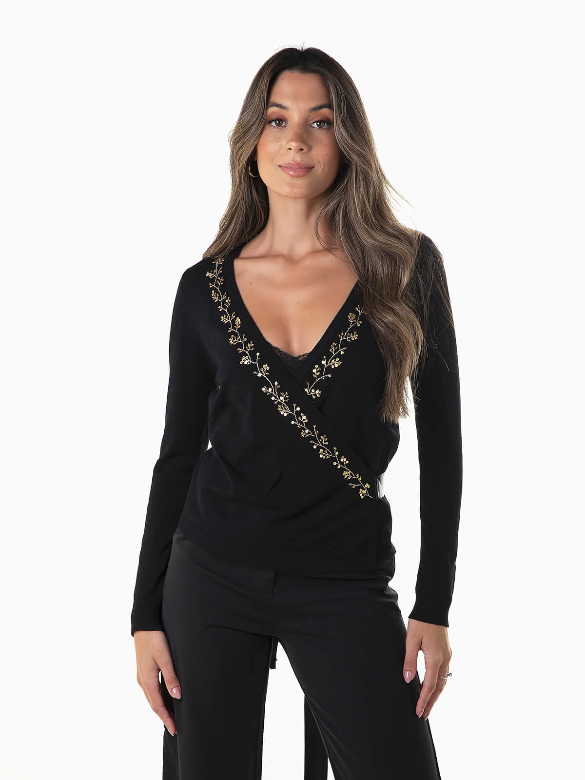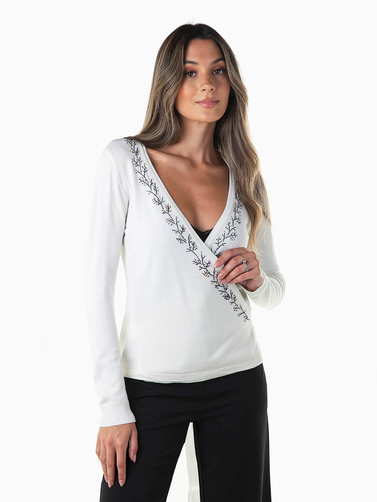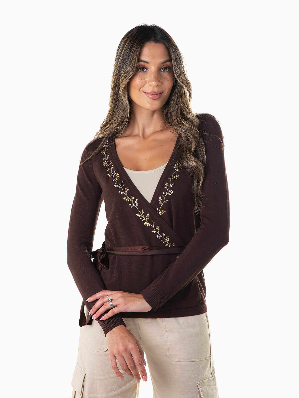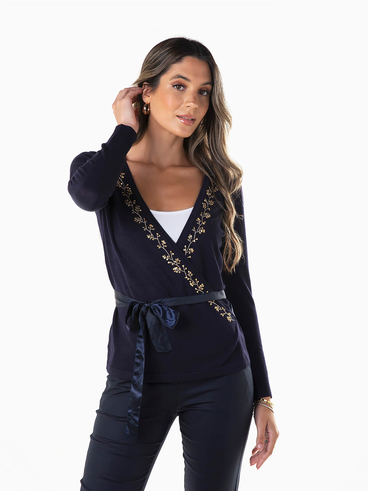 Casaco de malha com decote de trespasse e aperto de cinto acetinado. Cardigan manga comprida com pormenores bordados e lantejoulas. Punhos canelados.