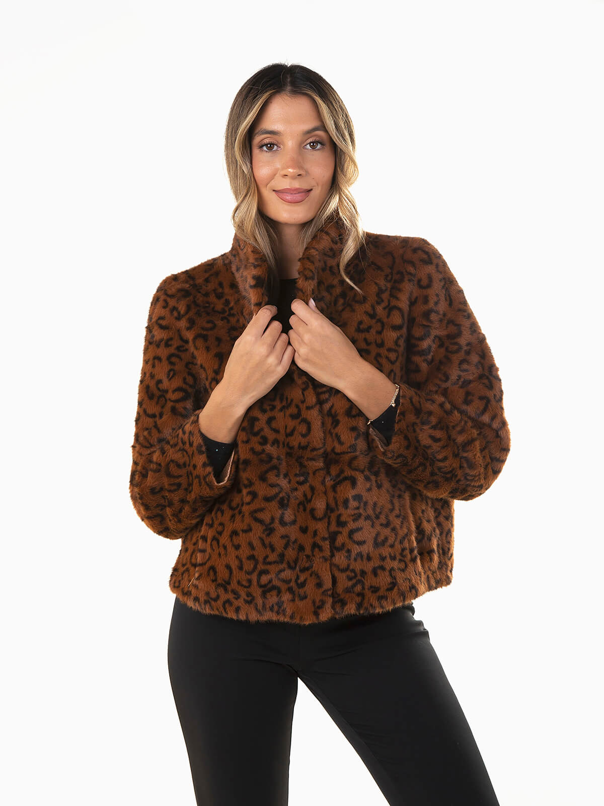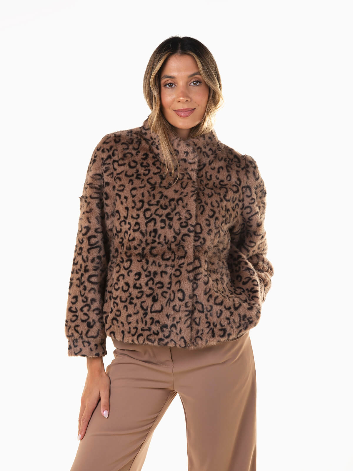 Casaco em pelo sintético animal print, macio e aconchegante, perfeito para os dias frios. Com gola subida, bolsos práticos, elástico na base e botões de pressão, é a escolha ideal para um look tendência que une conforto e estilo.