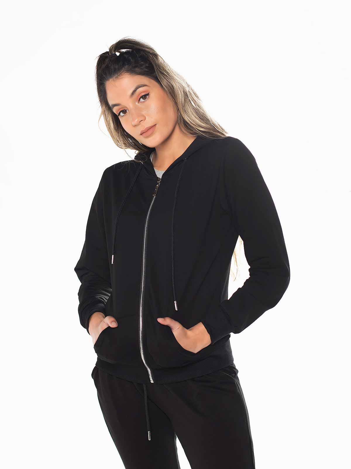 Casaco desportivo básico em felpa com capuz. Casaco fitness com bolsos laterais. Punhos elásticos. Aperto de fecho éclair.