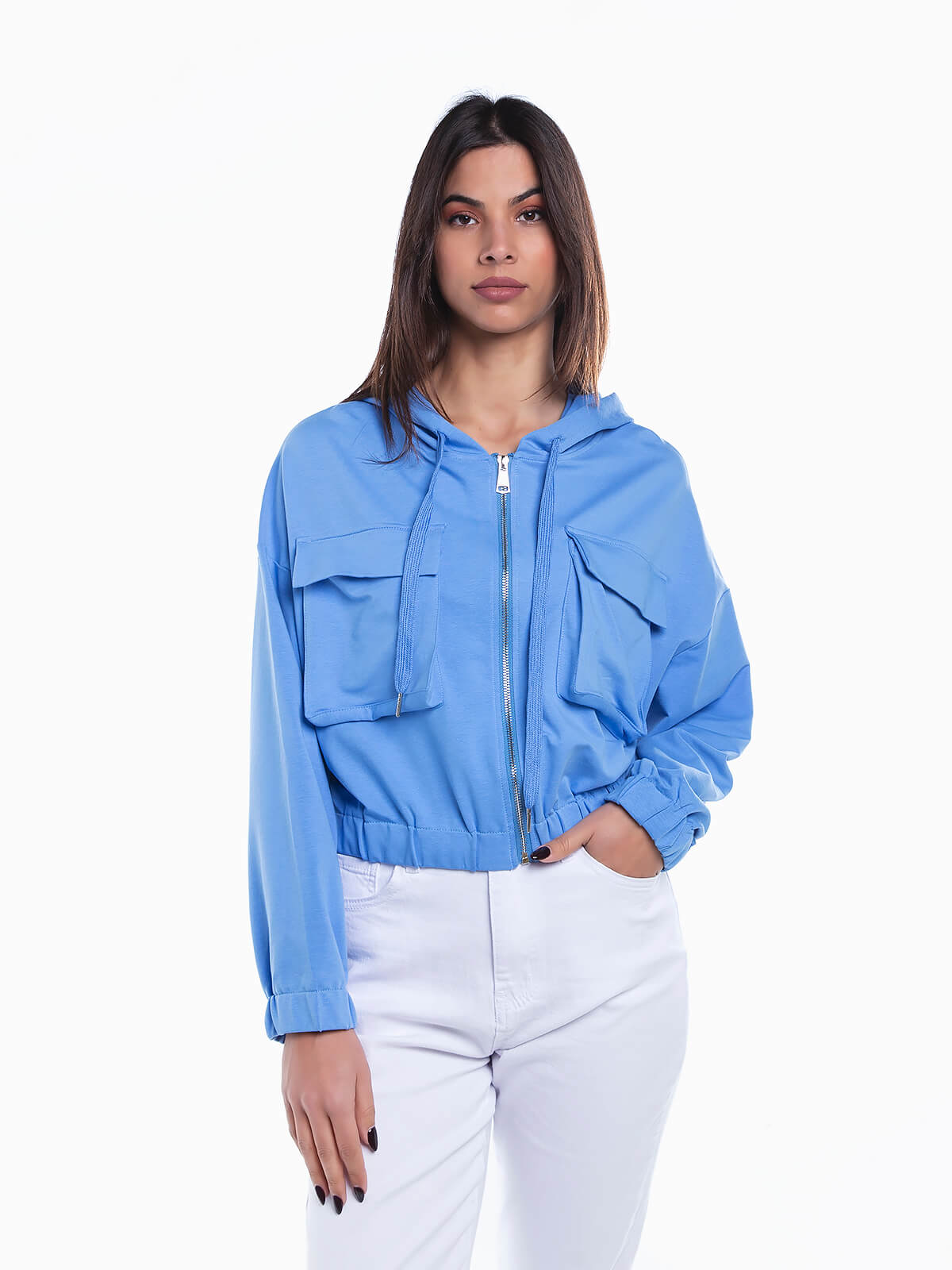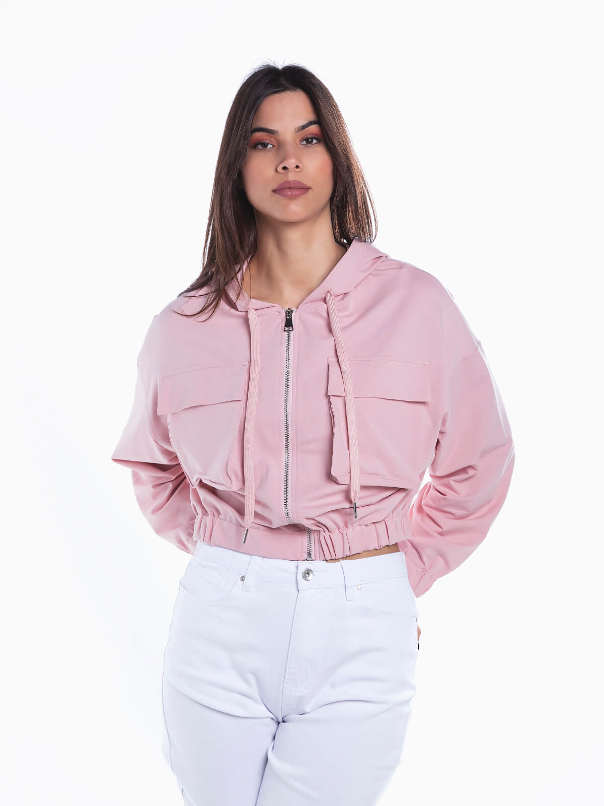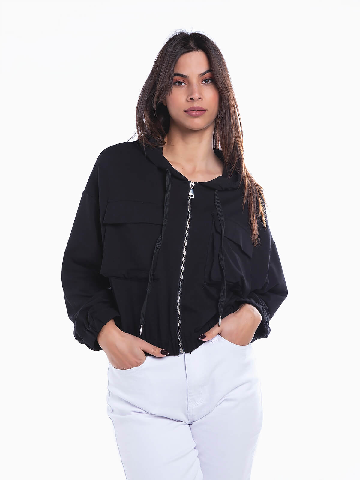 Casaco desportivo com bolsos quadrados frontais. Casaco curto com capuz e cordão para ajustar. Extremidades elásticas. Aperto de fecho éclair.