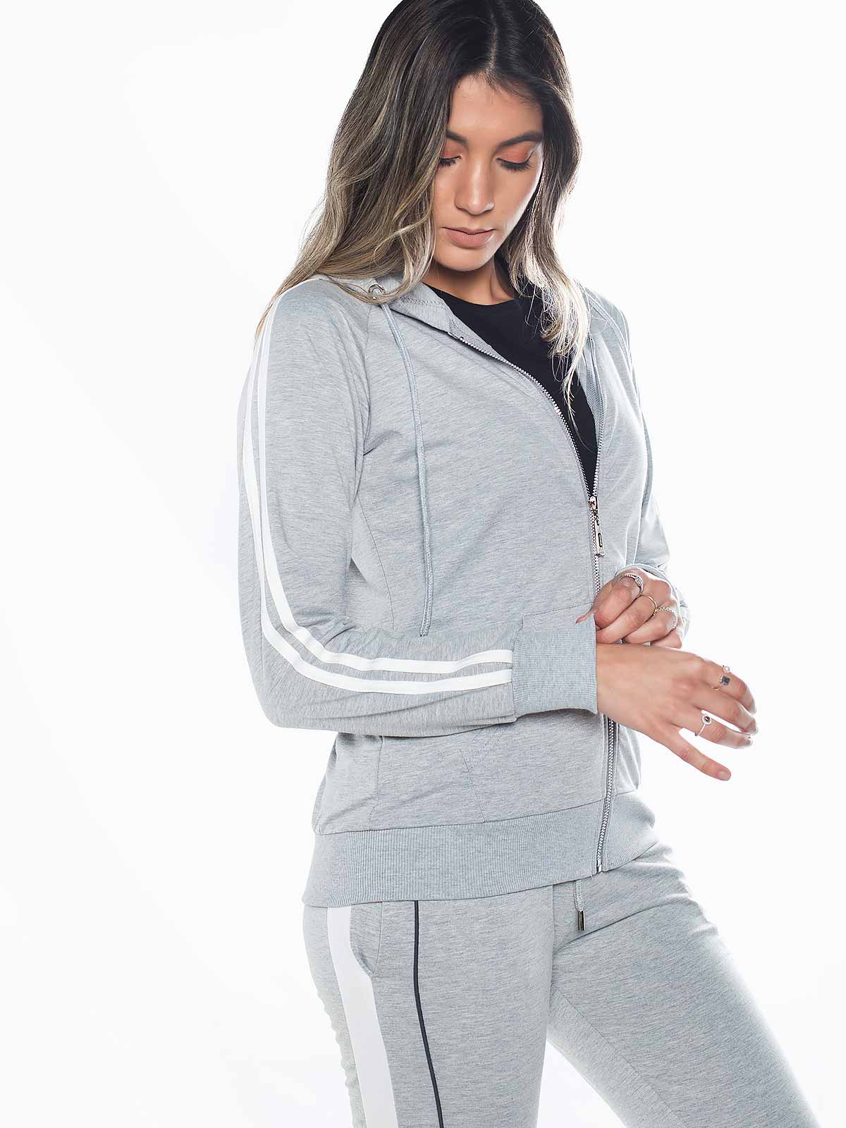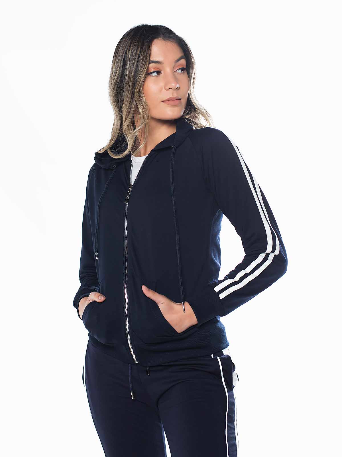 Casaco desportivo de capuz com riscas brancas nas mangas. Casaco fitness com bolso canguru. Punhos elásticos. Aperto de fecho éclair.