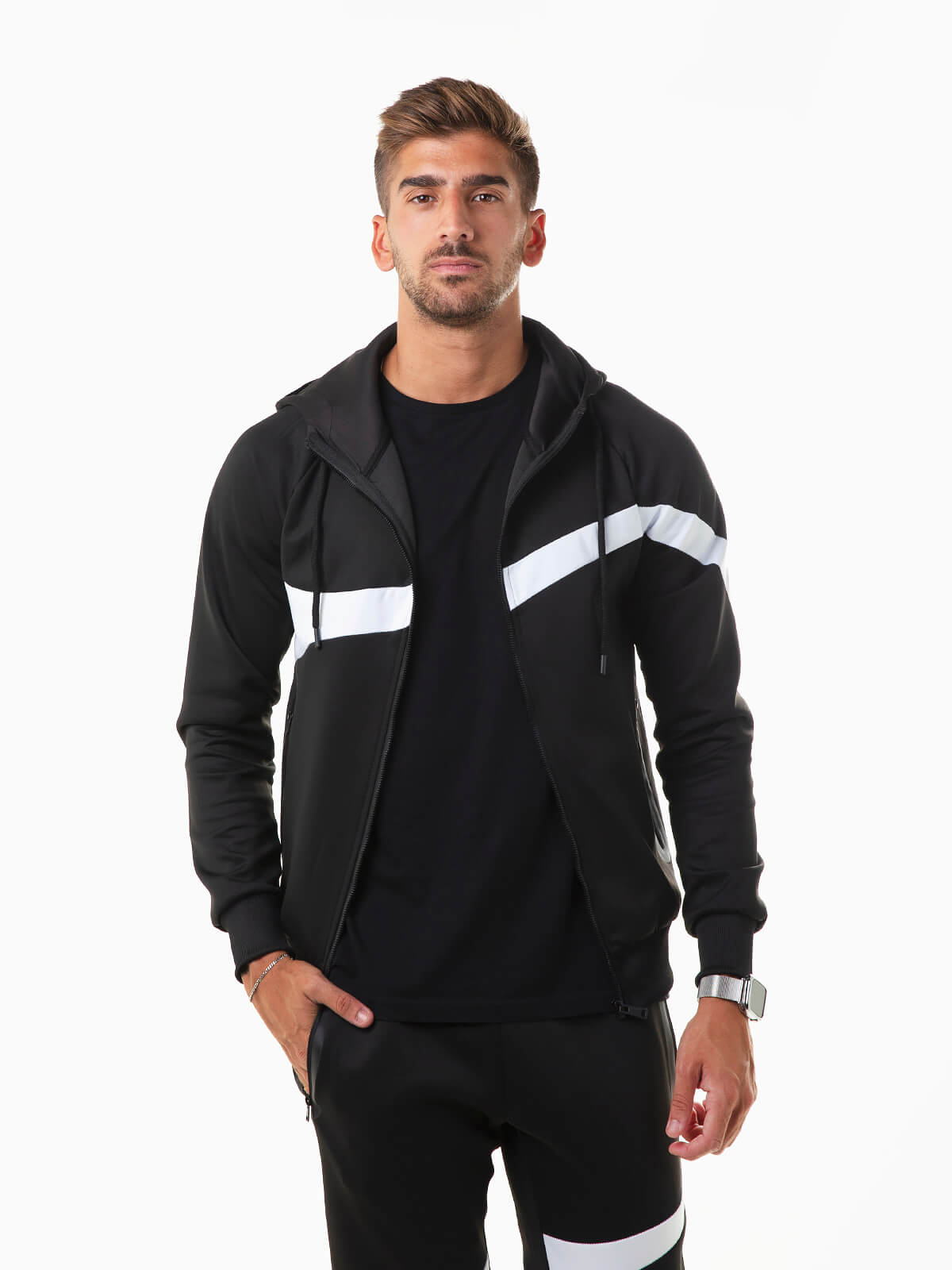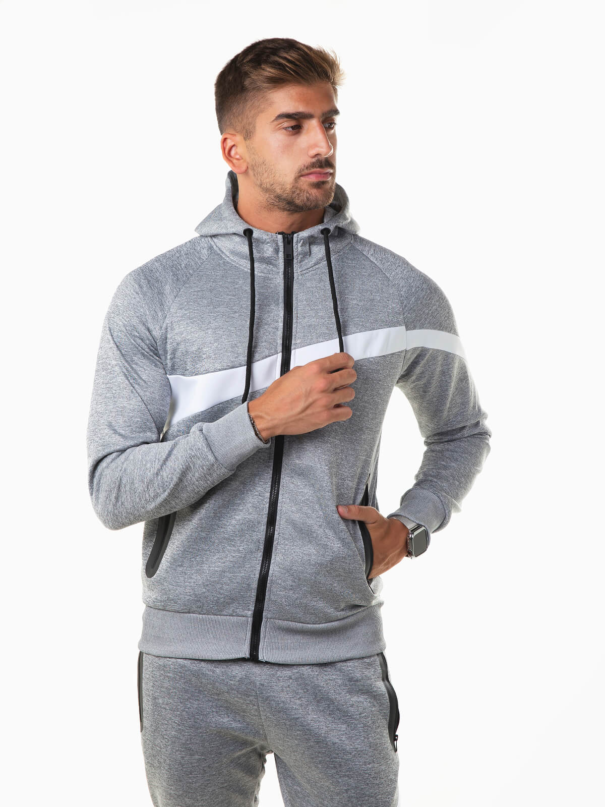 Casaco desportivo com capuz e cordão para ajustar. Casaco fato treino com manga comprida e color block. Extremidades elásticas. Gola subida. 2 bolsos. Aperto fecho zíper.