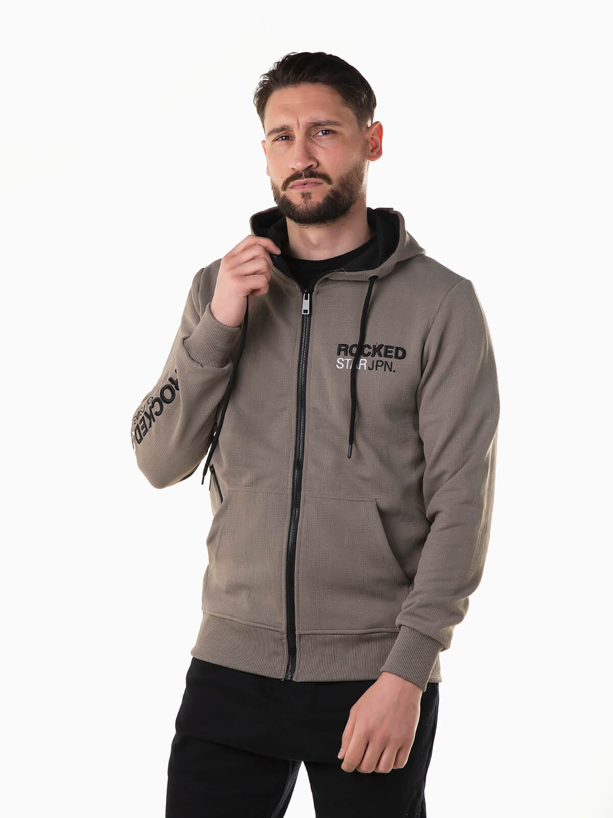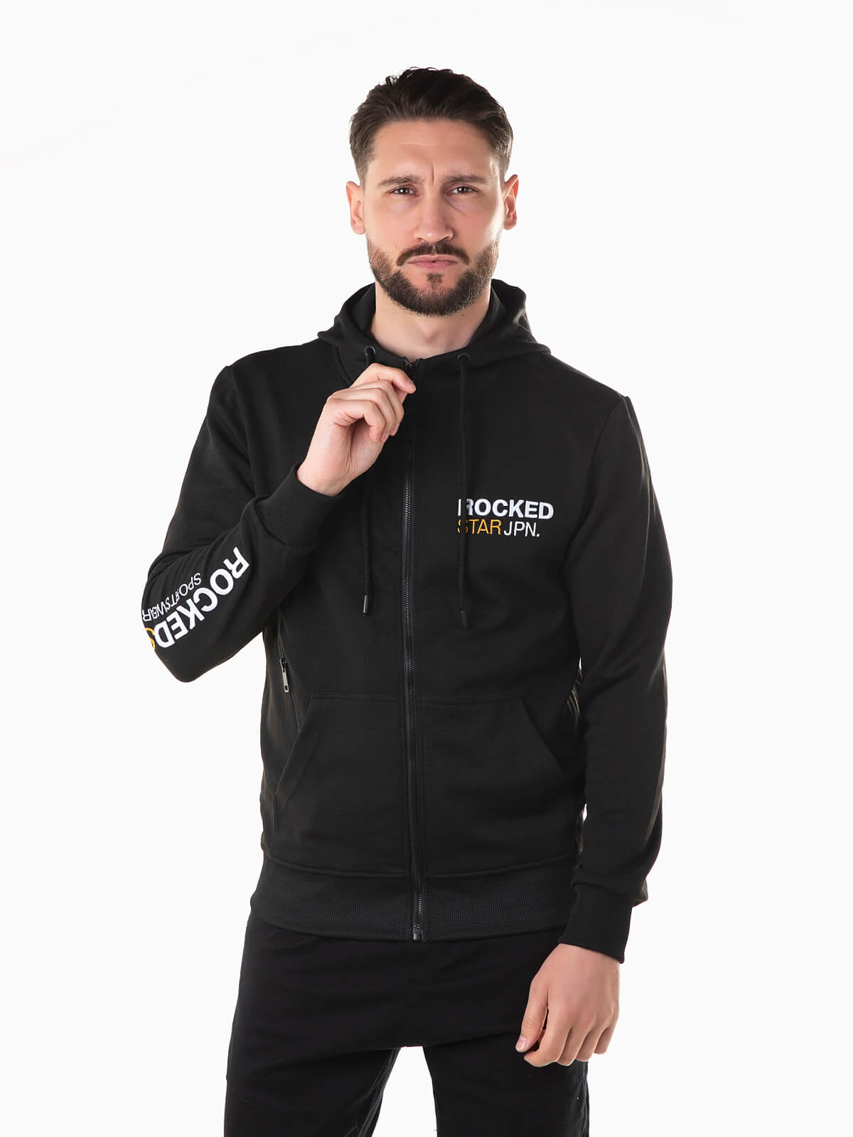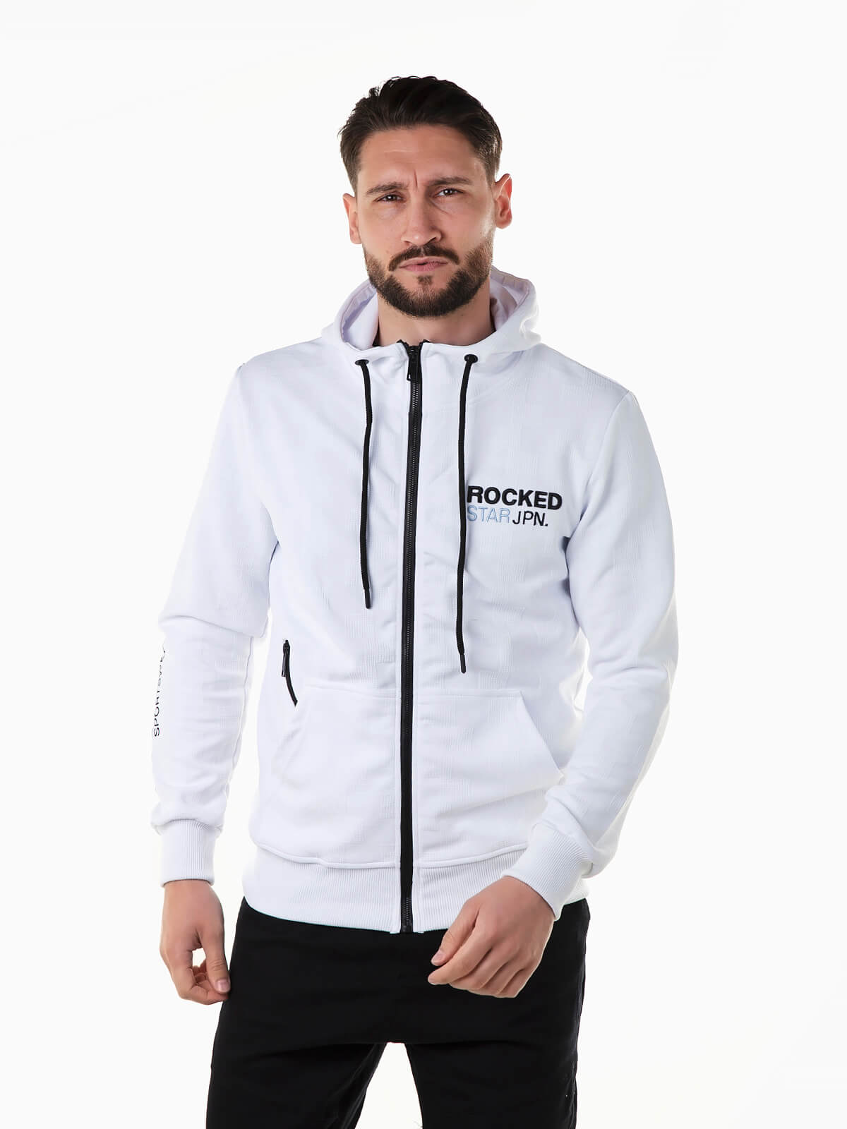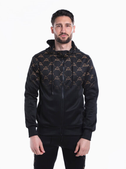Casaco desportivo manga comprida com pormenores bordados. Hoodie com fecho zíper e bolso canguru. Cordão no capuz para ajustar. Acabamentos canelados.