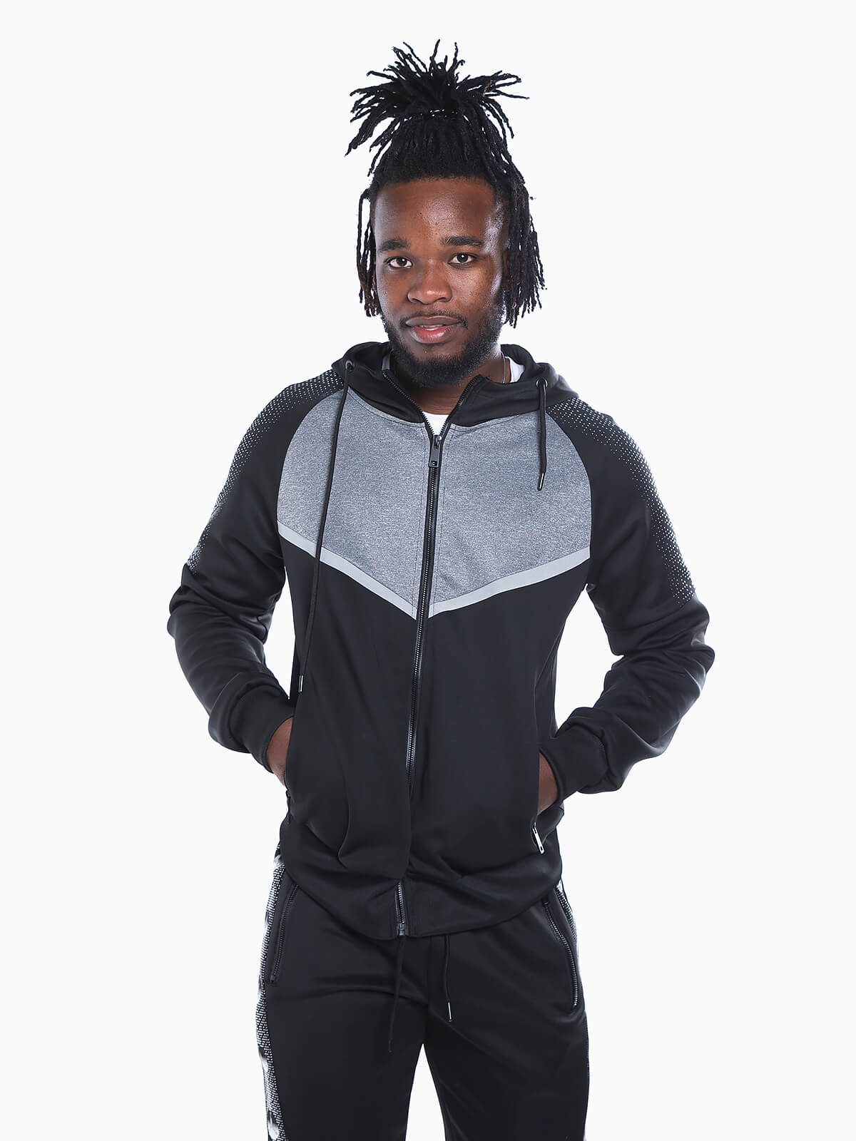 Casaco desportivo com capuz e cordão para ajustar. Casaco hoodie com encaixe de cores na frente e mangas compridas estampadas. Extremidades elásticas. Gola subida. 2 bolsos. Aperto de fecho zíper.