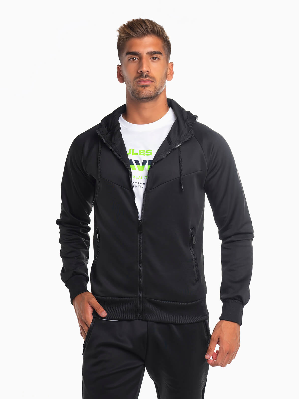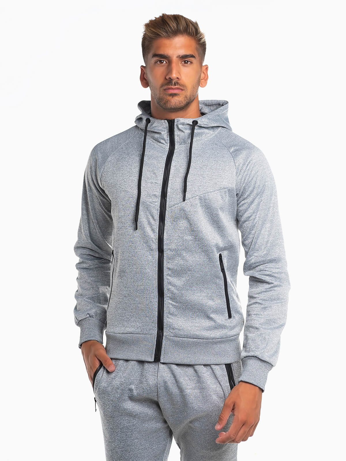 Casaco desportivo com capuz e cordão para ajustar. Casaco hoodie com gola subida e extremidades elásticas. 2 bolsos. Aperto frontal fecho zíper.