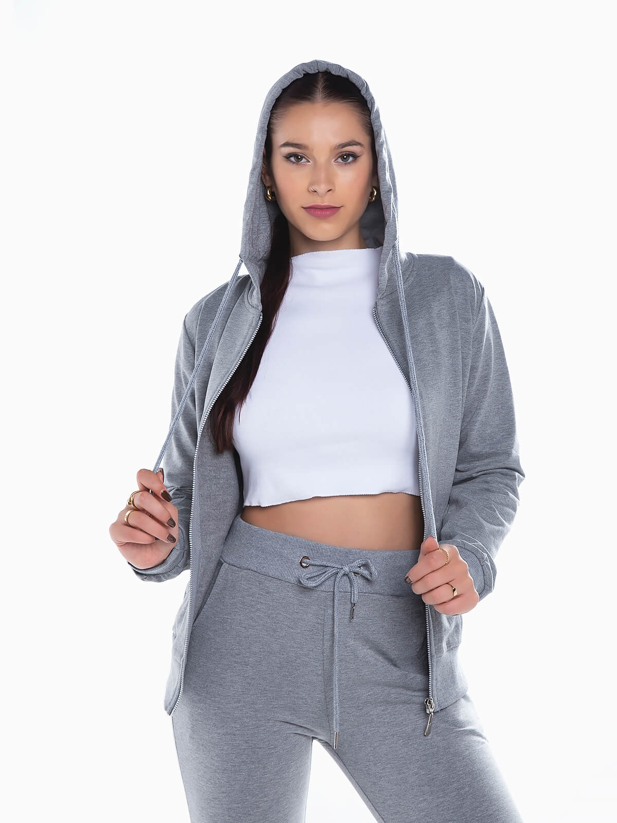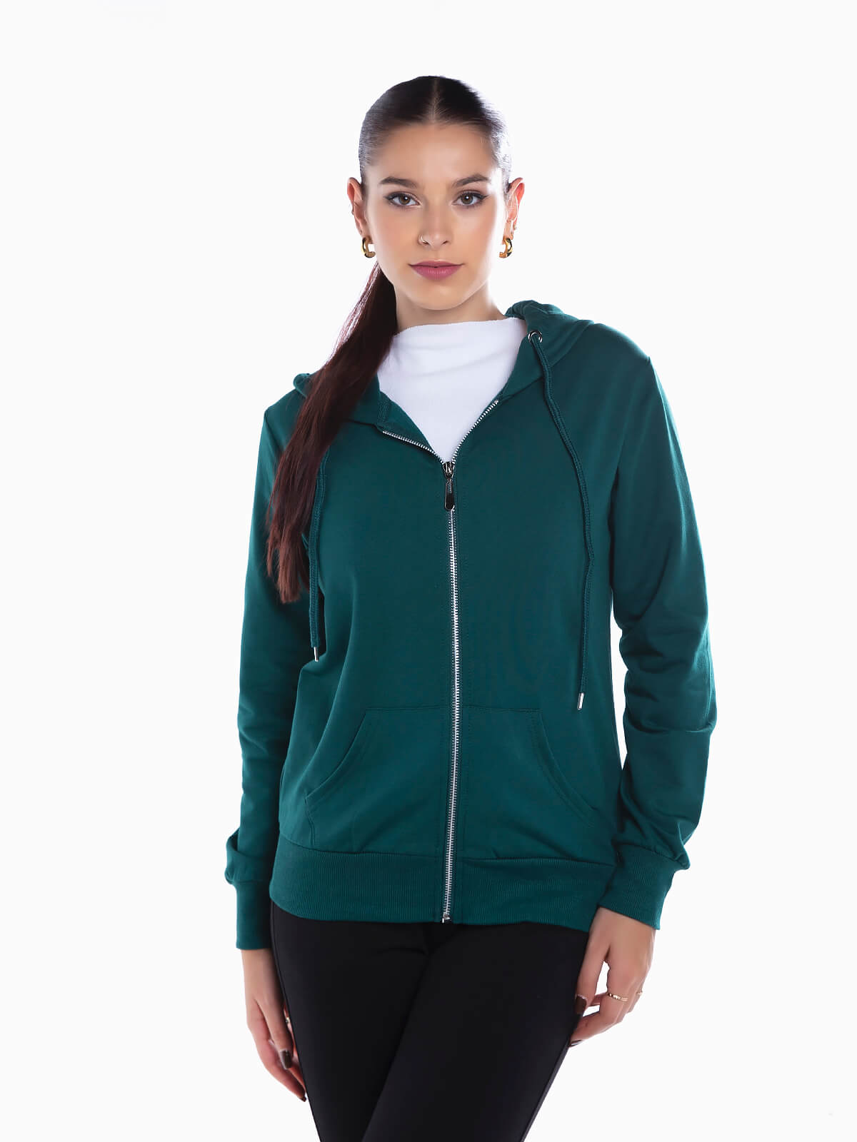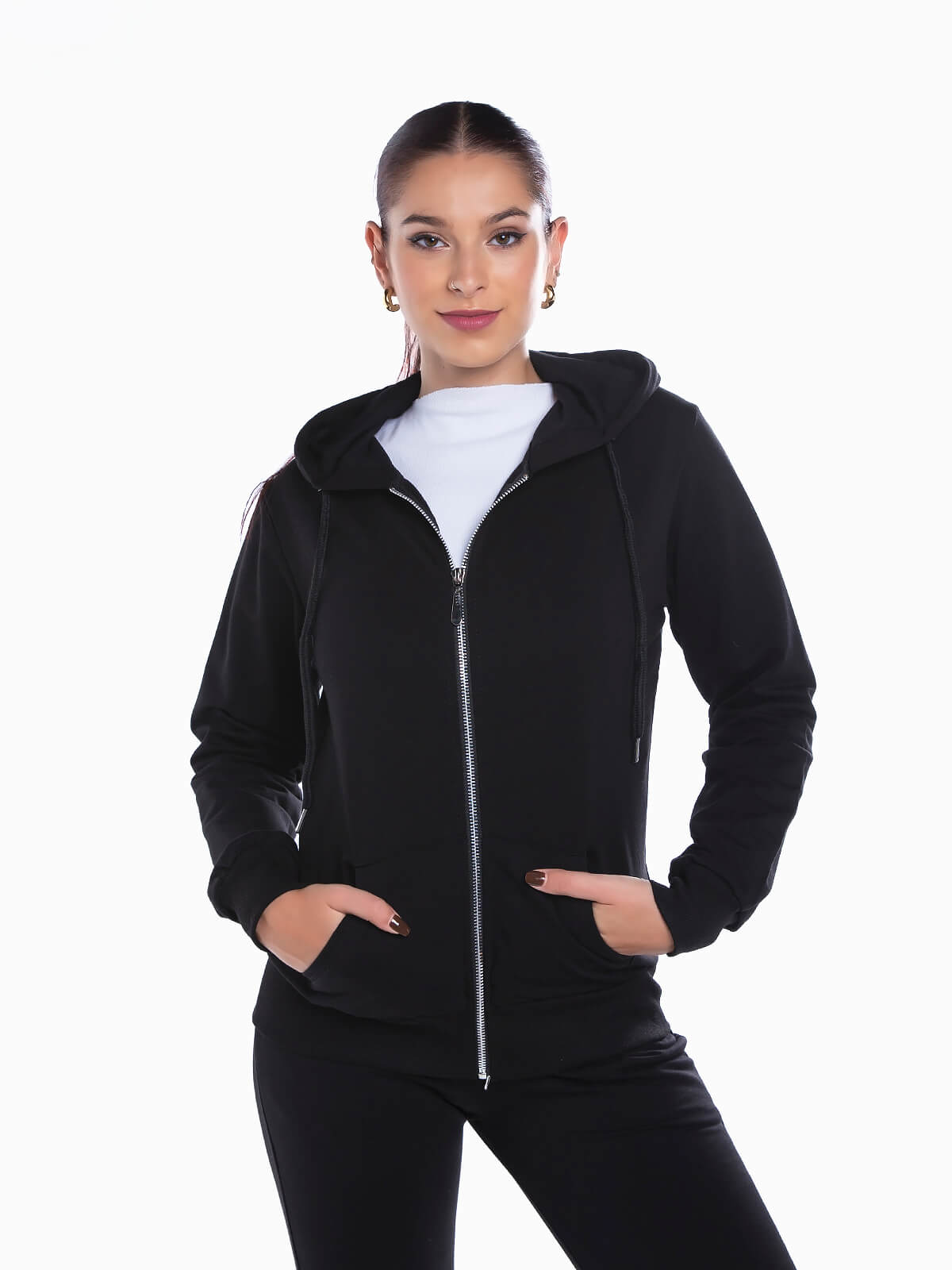 Casaco desportivo com capuz para senhora. Casaco hoodie com interior cardado. Capuz com cordão para ajustar. 2 bolsos. Acabamentos elásticos. Aperto frontal de fecho zíper.