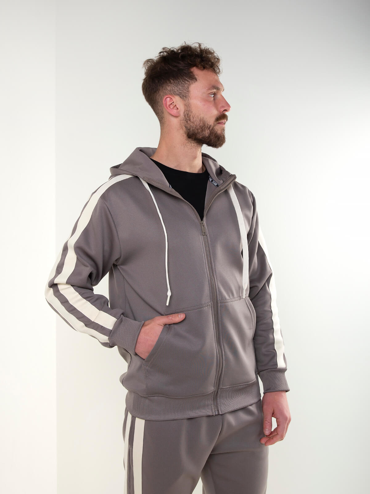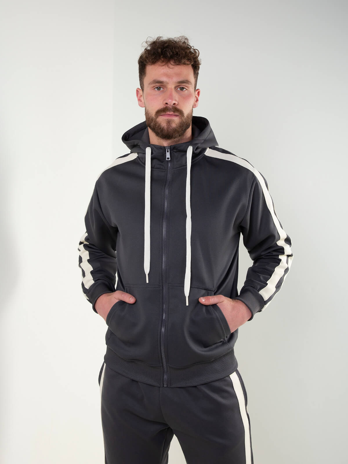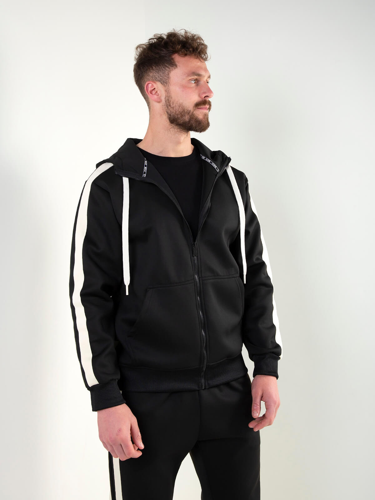 Casaco desportivo de homem com capuz ajustável e fecho frontal. Modelo com bolso canguru, punhos e base canelados para melhor ajuste. Destaque para a faixa em contraste ao longo das mangas, que dá um toque desportivo e atual.
