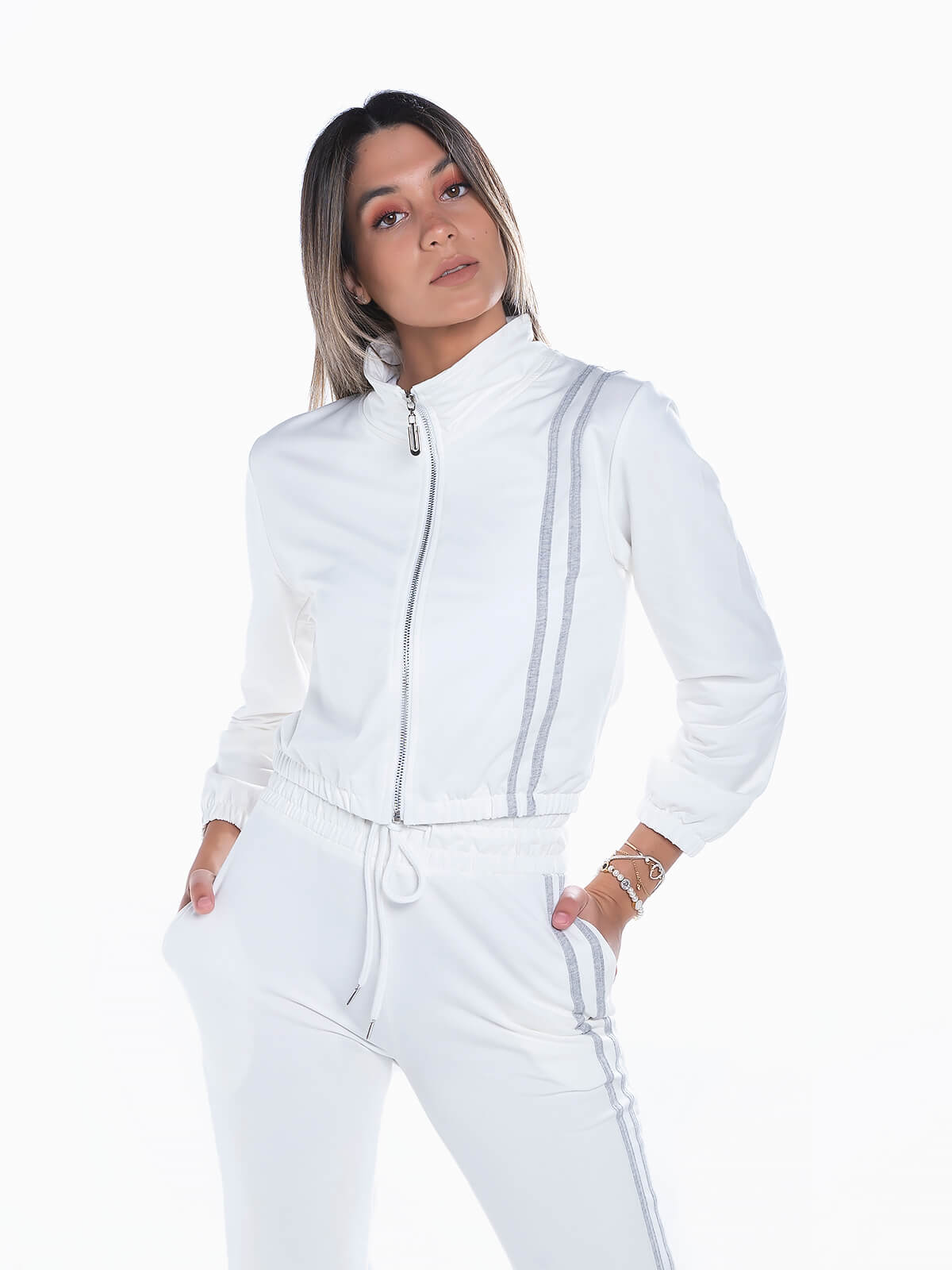 Casaco desportivo com gola alta e riscas aplicadas. Extremidades elásticas. Aperto com fecho éclair.