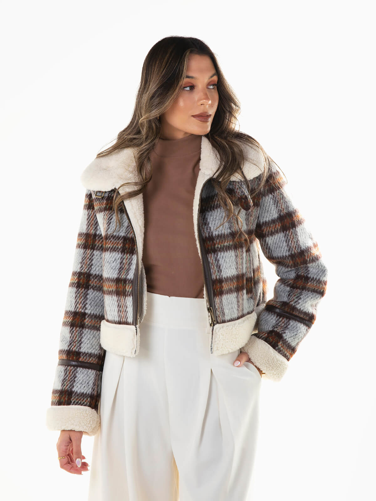 Casaco de dupla face em xadrez com interior em pelo velocino. Blusão jaspeado para mulher com gola de abas com fivela. 2 bolsos. Aperto fecho zíper.