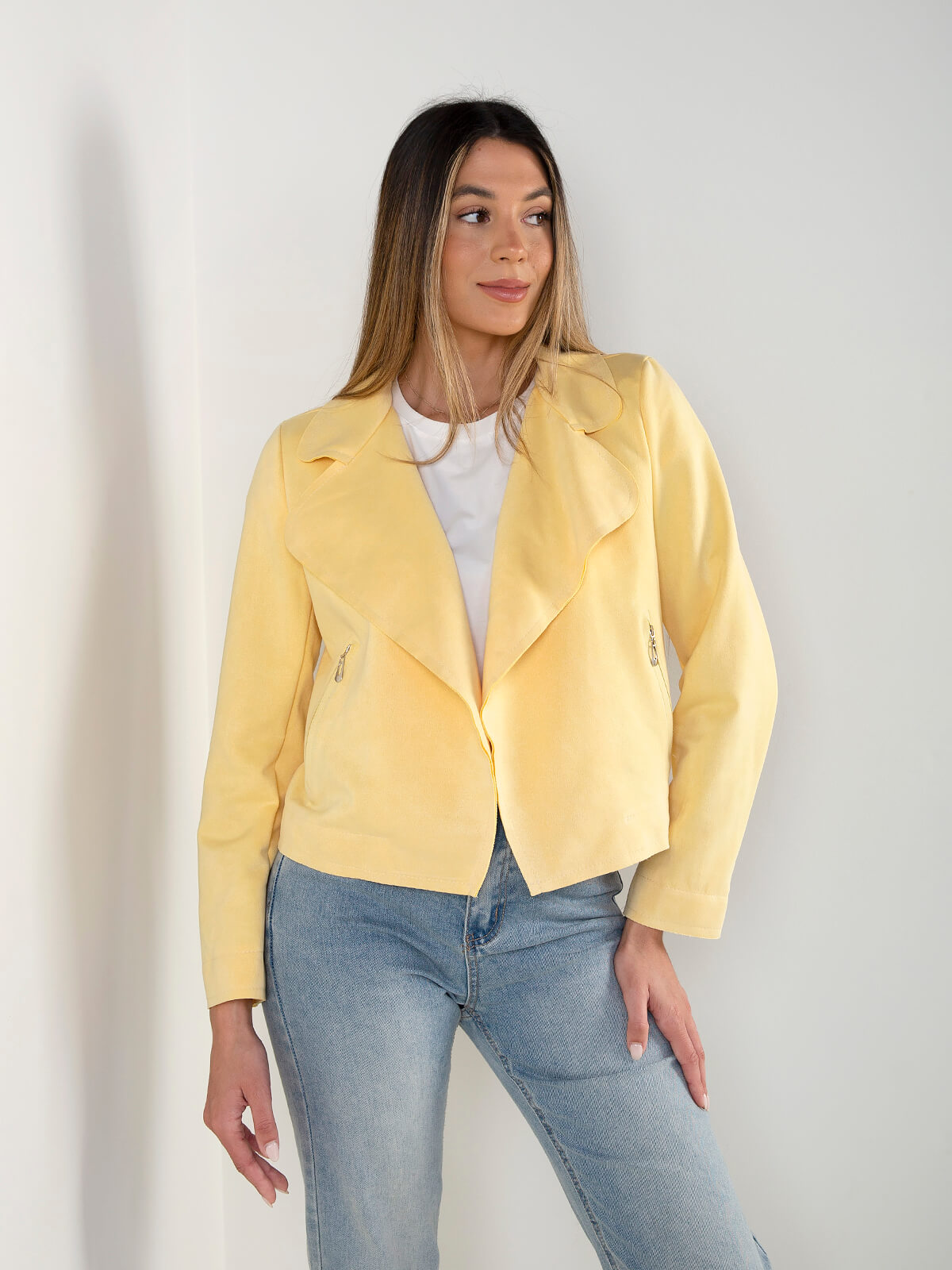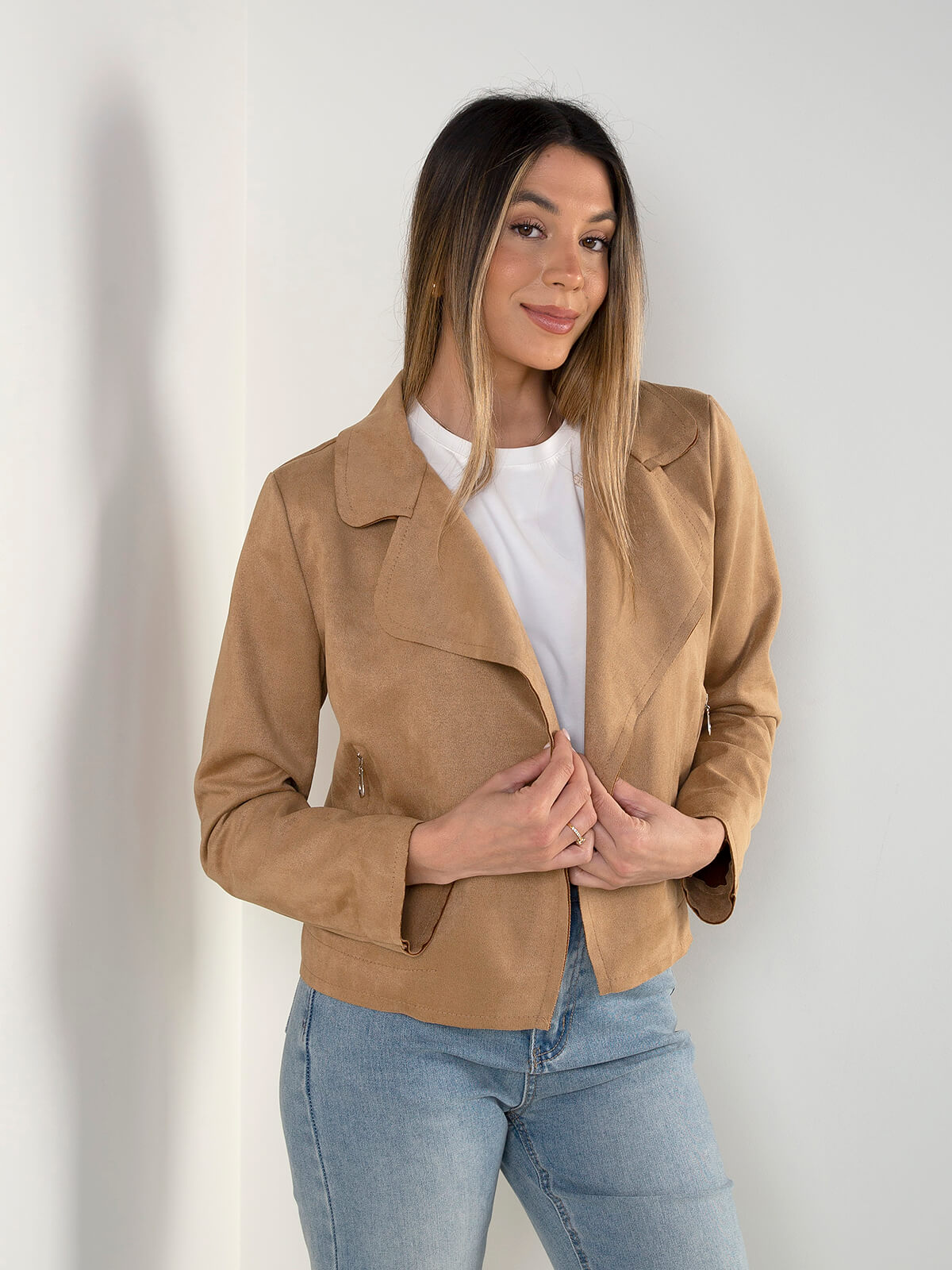 Casaco de mulher efeito camurça. Modelo aberto com gola larga e fechos decorativos. Leve e versátil para looks de meia estação.