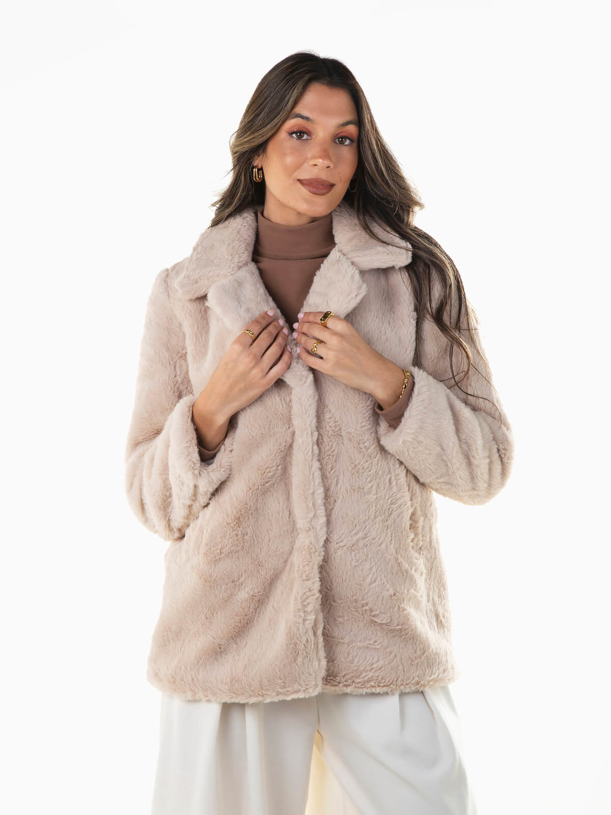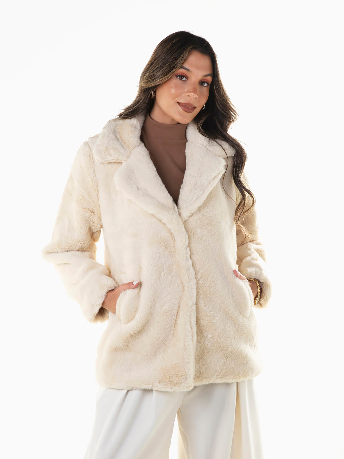 Casaco em pelo sintético com gola de abas e lapelas para mulher. Casaco manga comprida com interior forrado e 2 bolsos. Aperto de botões de pressão.