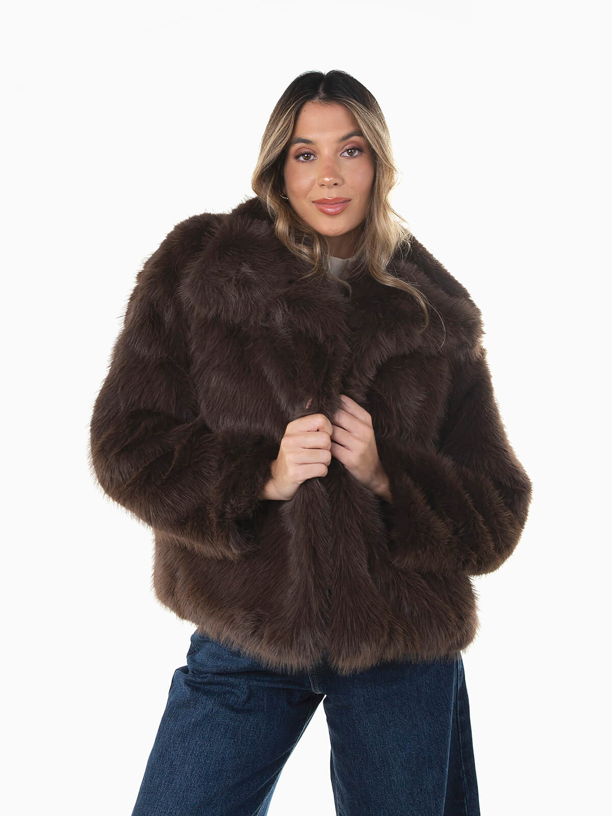 Casaco efeito pelo com gola larga e aperto de colchetes invisíveis. Modelo suave e aconchegante, com 2 bolsos laterais. Uma peça elegante e moderna que acrescenta textura e estilo aos looks de outono-inverno. Combina com calças de alfaiataria ou ganga escura para um look trendy e sofisticado.