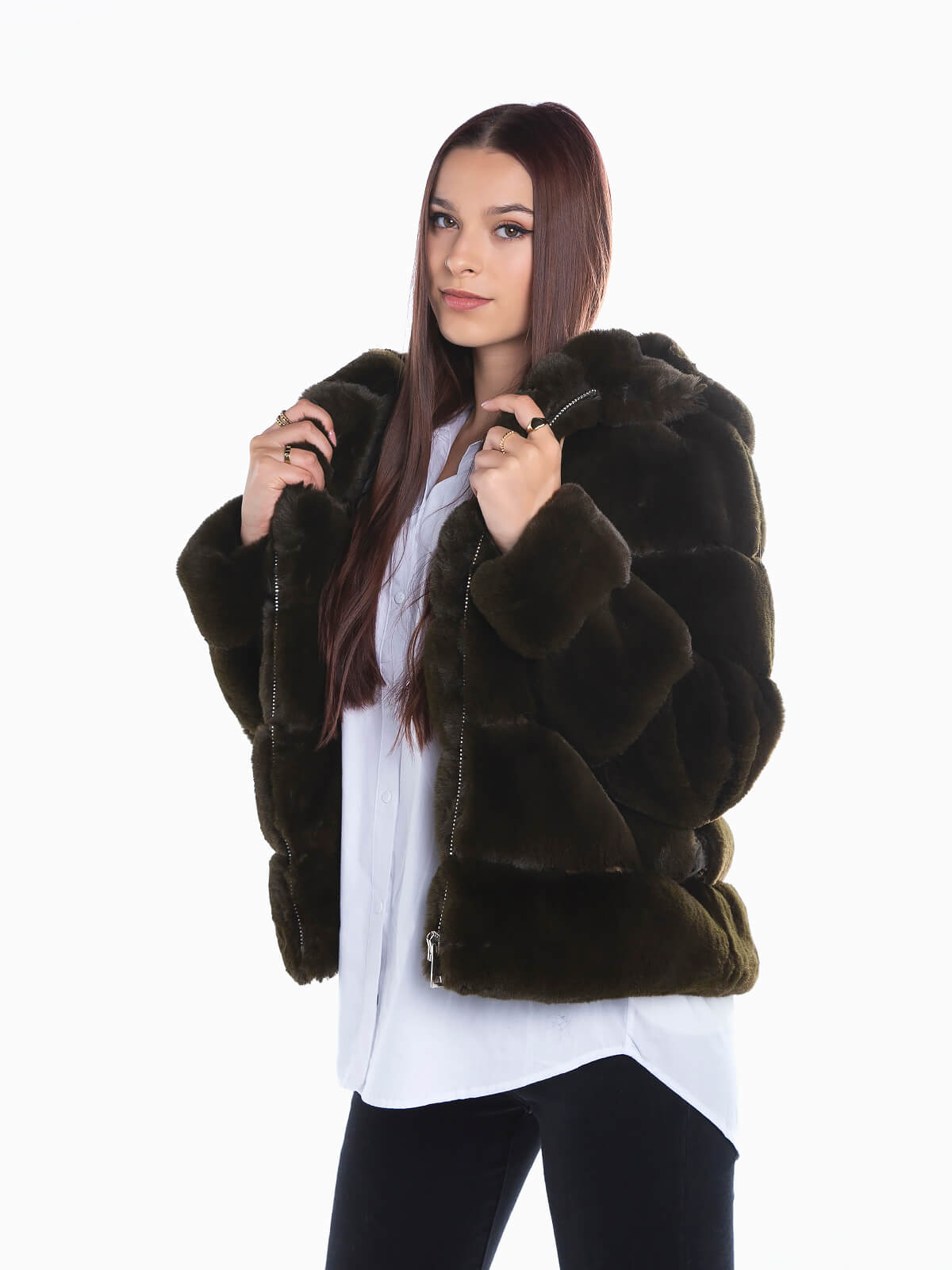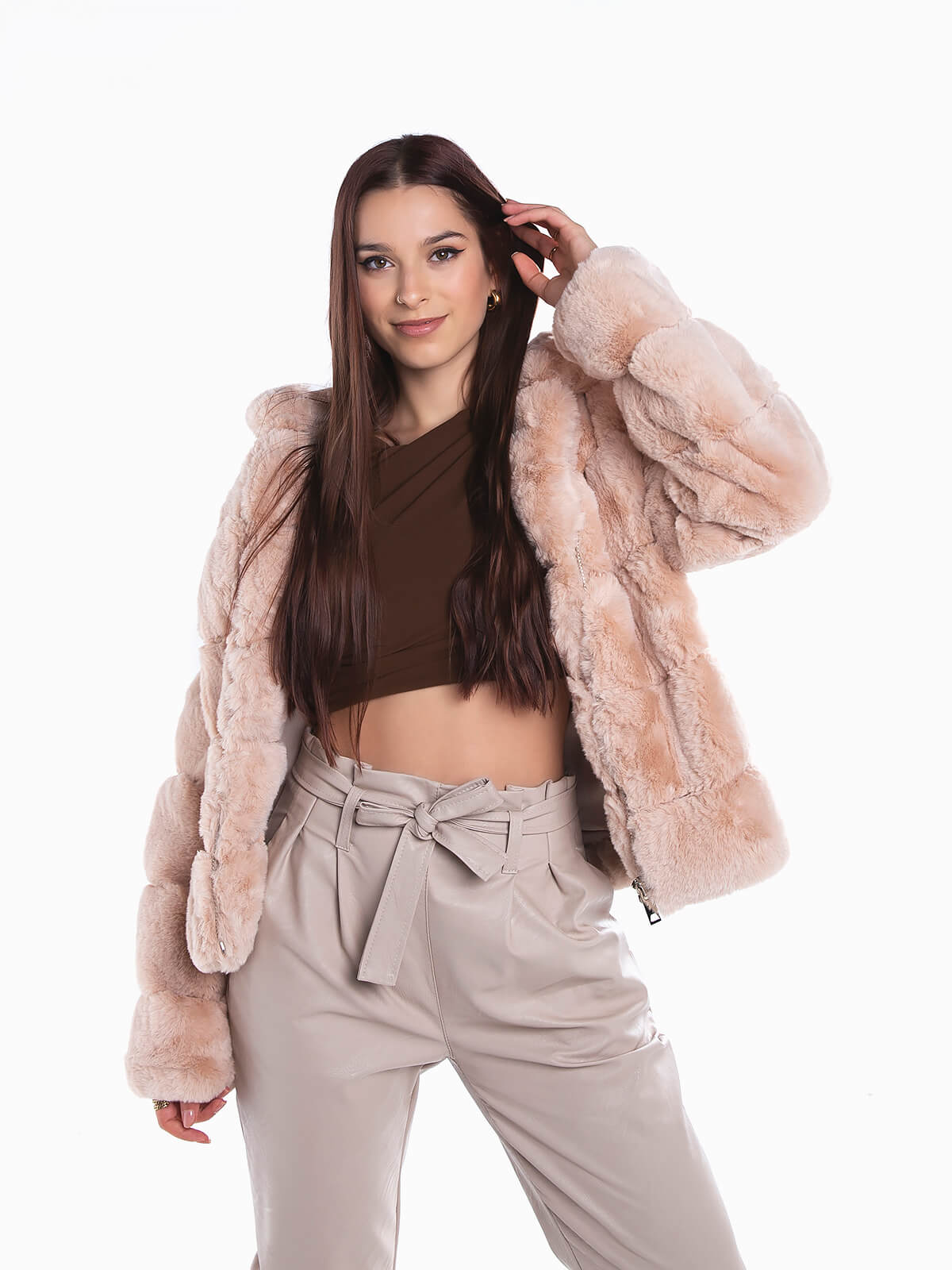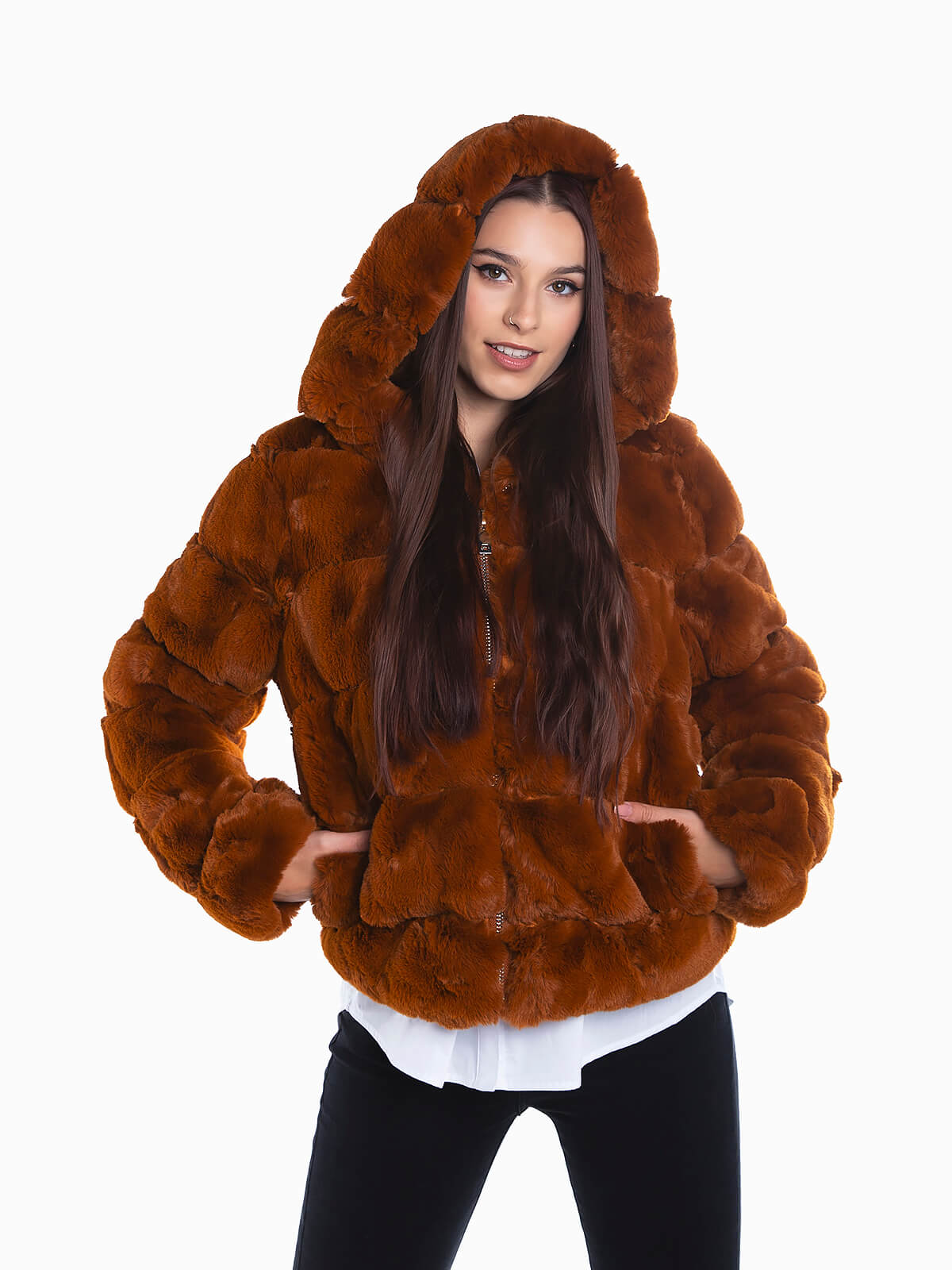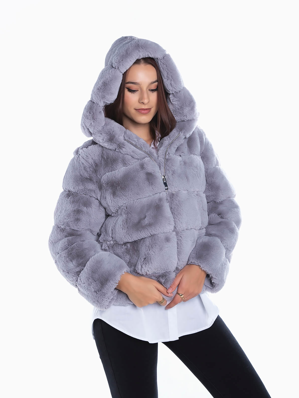 Casaco efeito pelo com capuz para senhora. Casaco de tato suave forrado com 2 bolsos laterais.