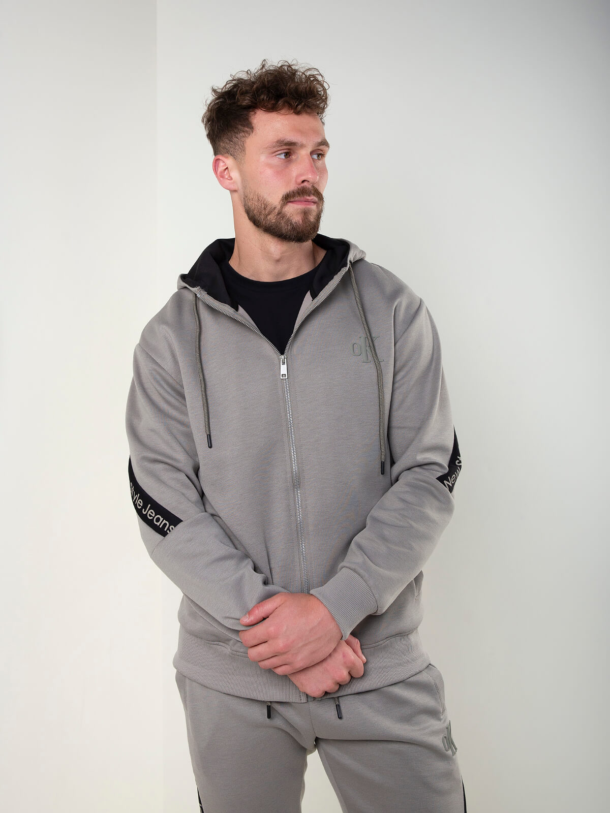Casaco de fato de treino com capuz e cordão ajustável. Modelo confortável com fecho frontal de correr e bolsos laterais. Detalhe contrastante com lettering nas mangas e costas. Punhos e base canelados para melhor ajuste. Ideal para looks casuais e desportivos.