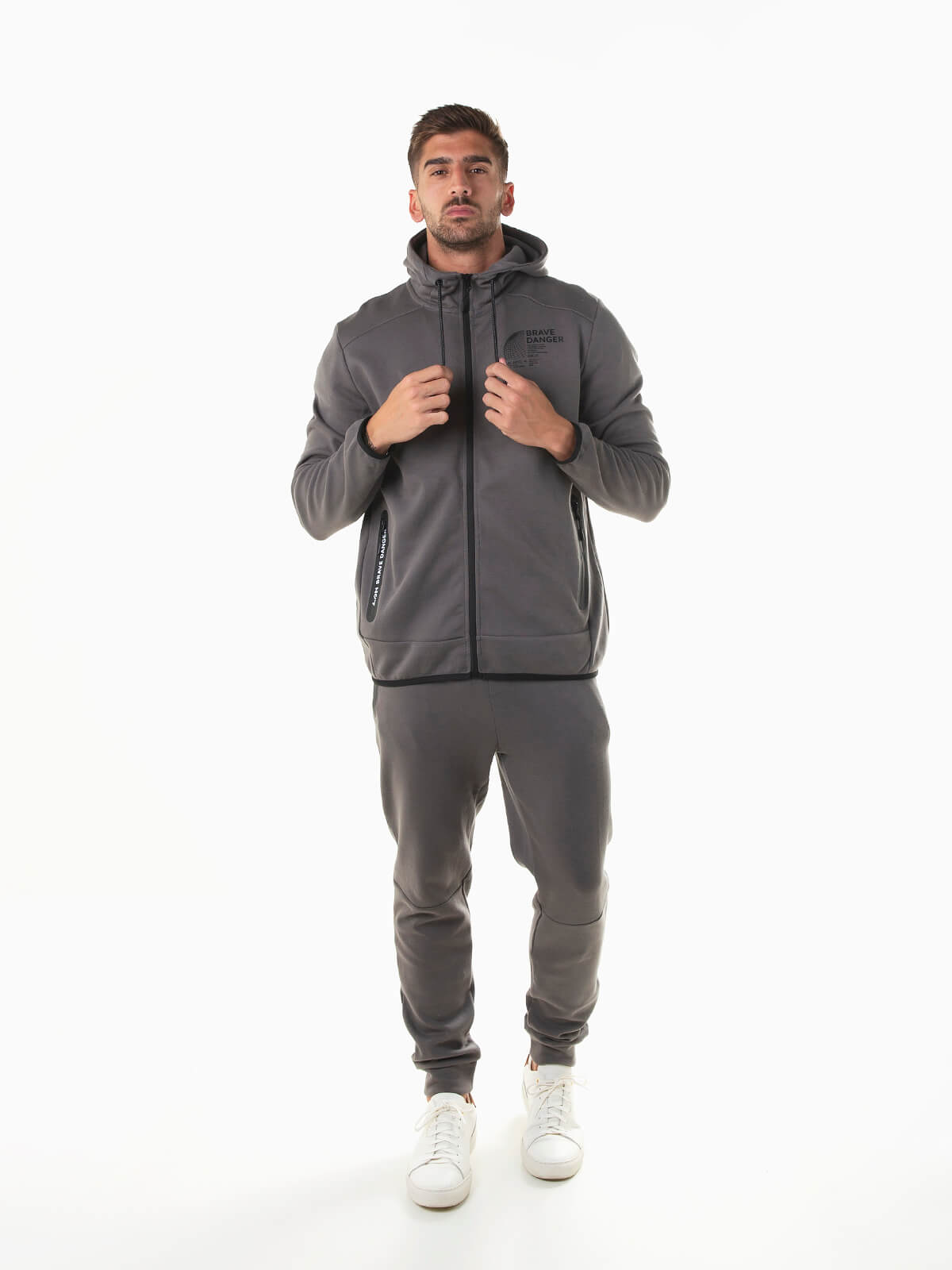 Casaco de fato treino cinza escuro para homem. Casaco hoodie manga comprida com gola alta e estampado no peito. Capuz com cordão para ajustar. Aperto frontal de fecho zíper.