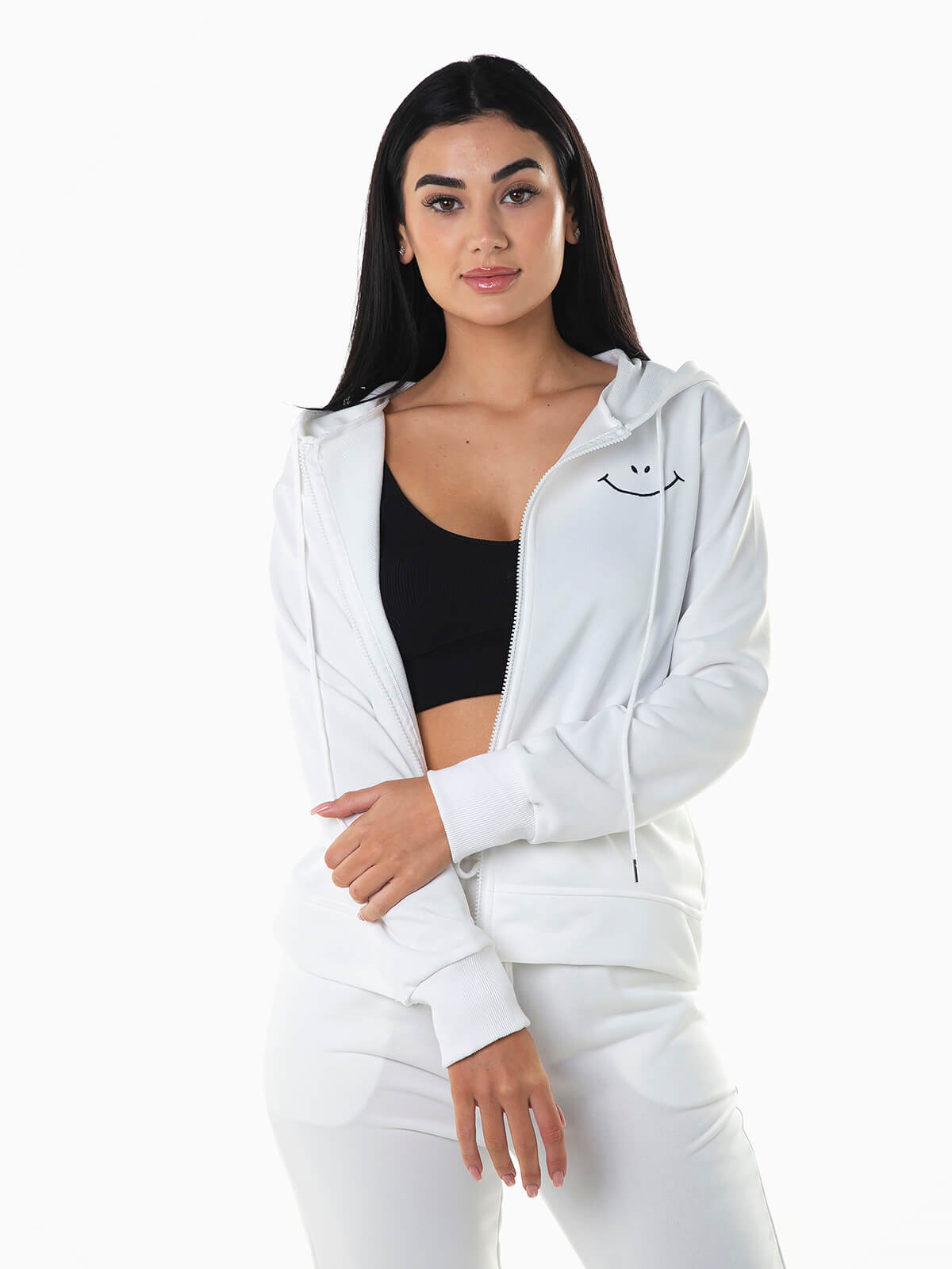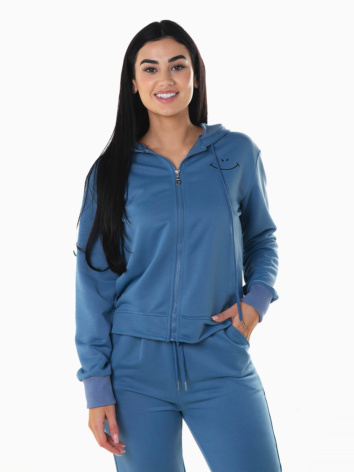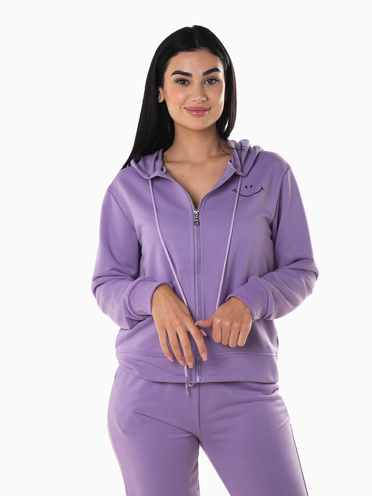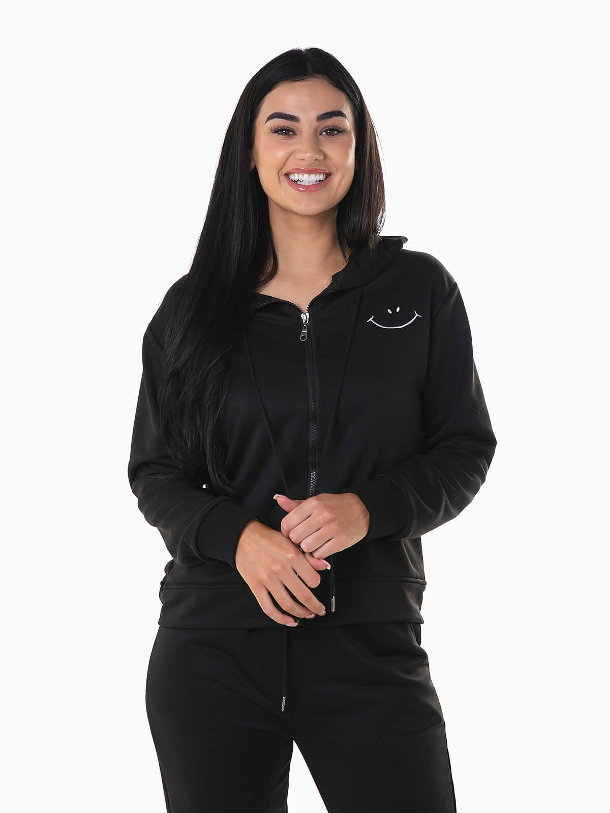 Casaco fato de treino com smile bordado no peito. Casaco com capuz e cordão para ajustar. Tecido de poliamida para maior resistência e conforto. Aperto fecho zíper.