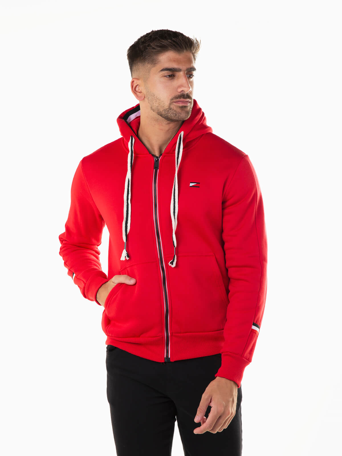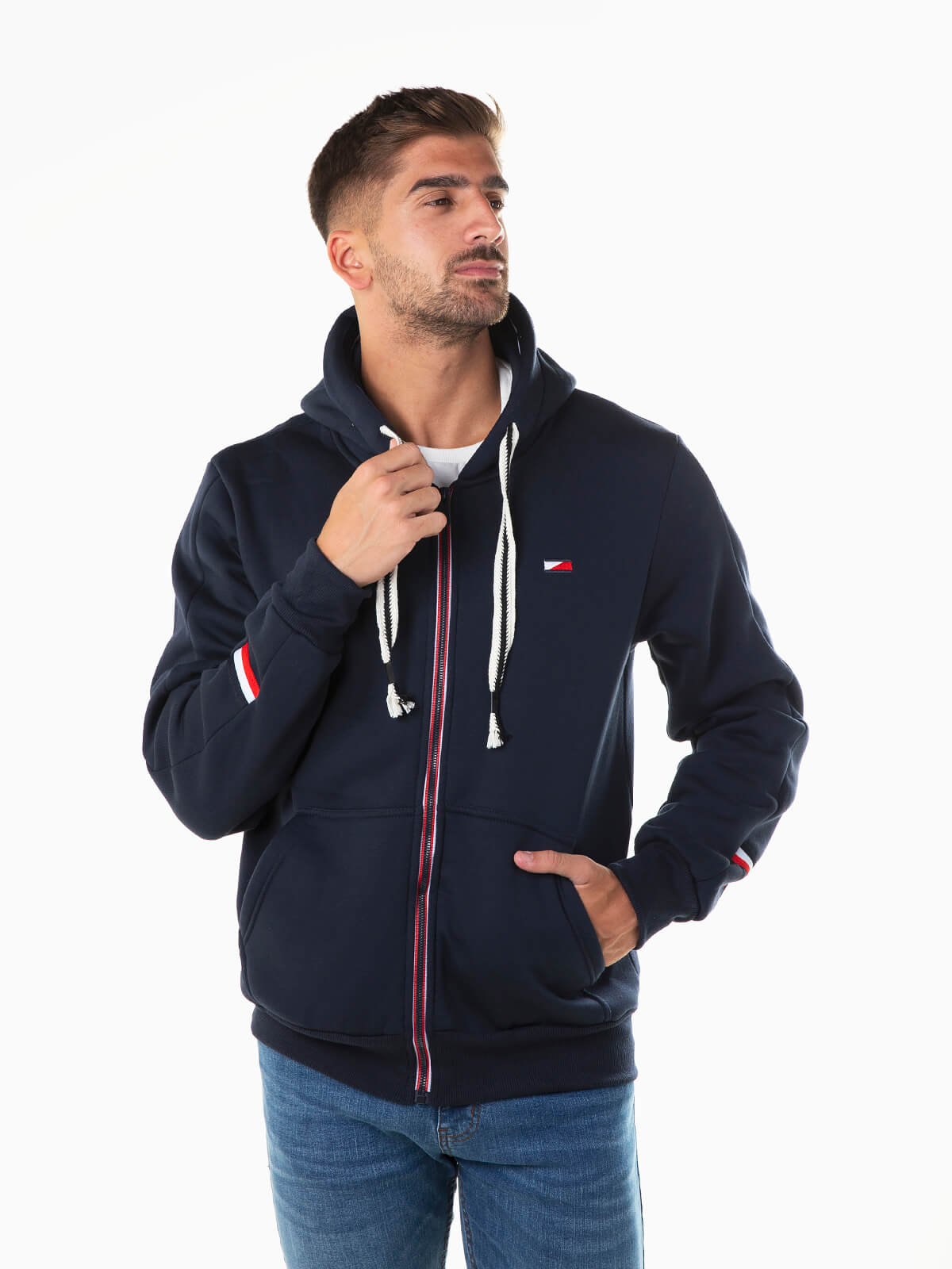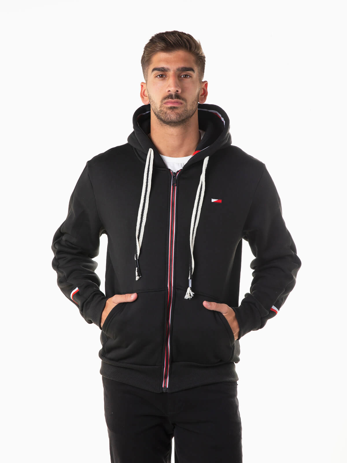 Casaco fato treino com símbolo bordado. Casaco hoodie de manga comprida com cordão bicolor para ajustar. Pormenor de bandeira nos punhos. 2 bolsos. Aperto fecho zíper.