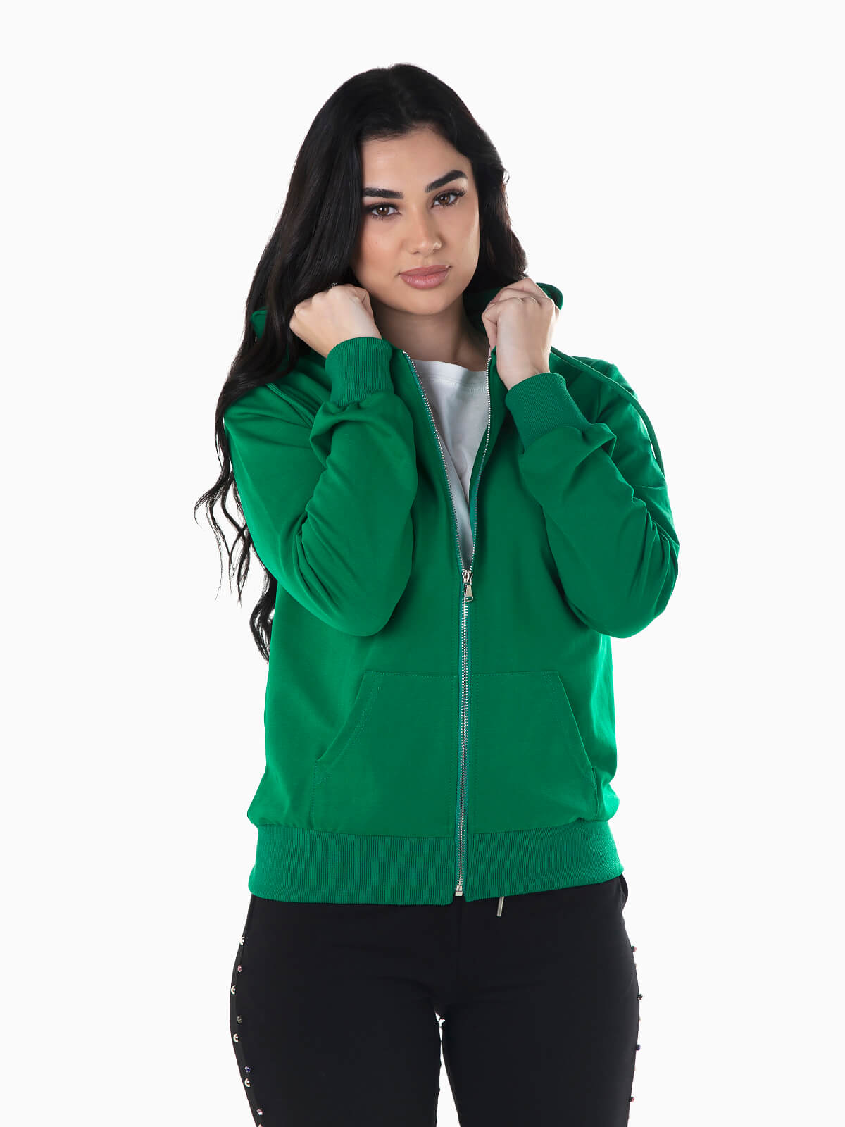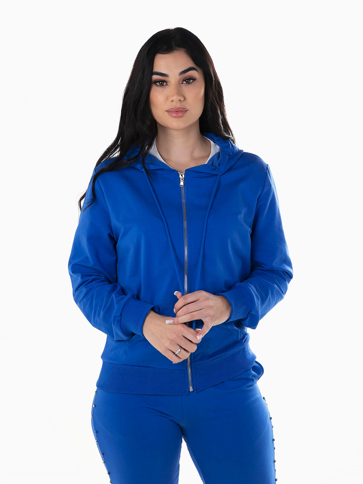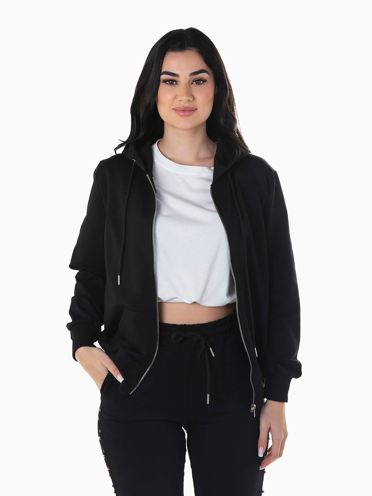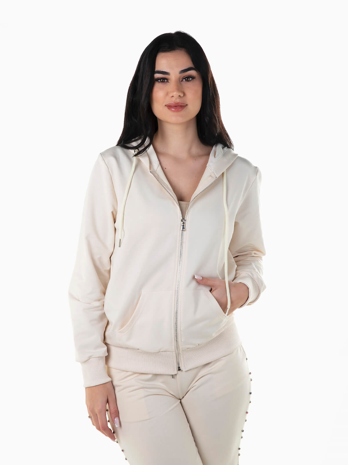 Casaco fato de treino com capuz e cordão para ajustar. Casaco felpa manga comprida com 2 bolsos. Aperto de fecho zíper.
