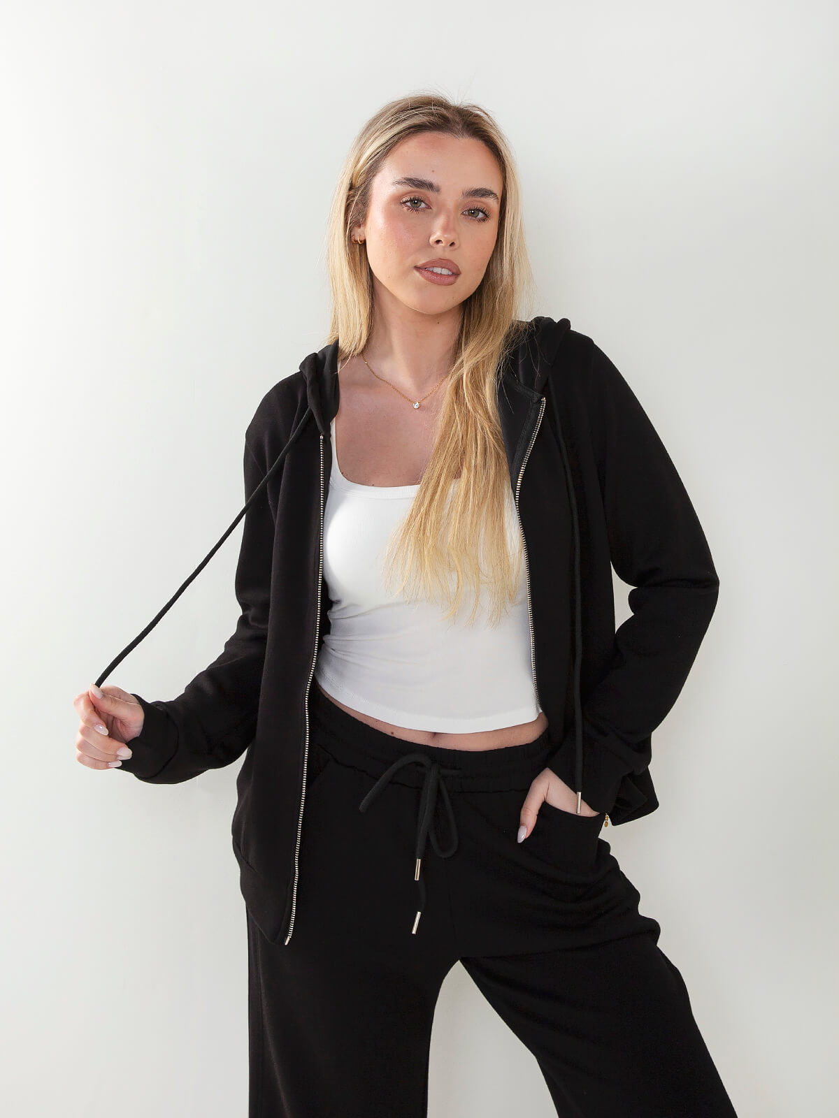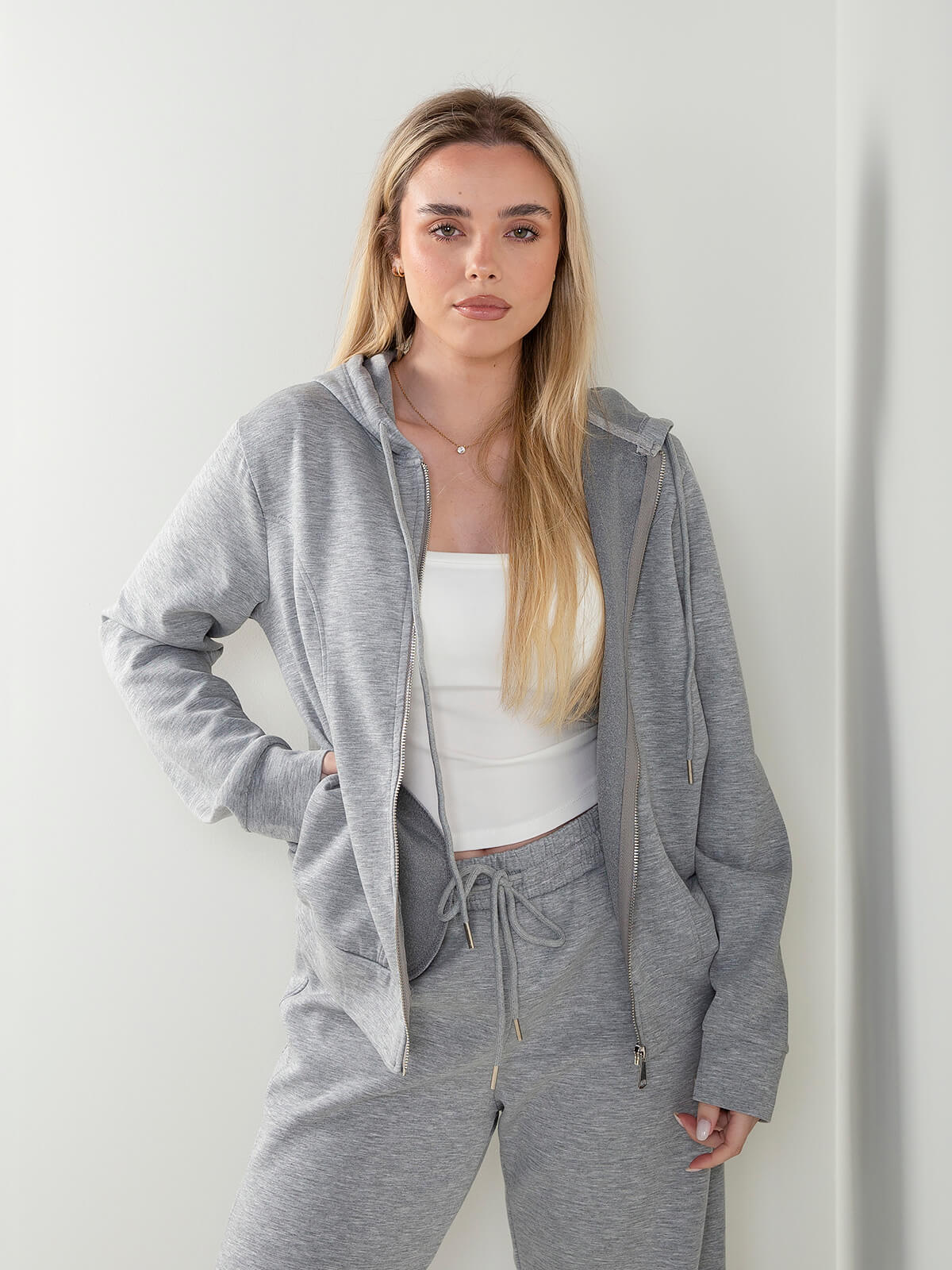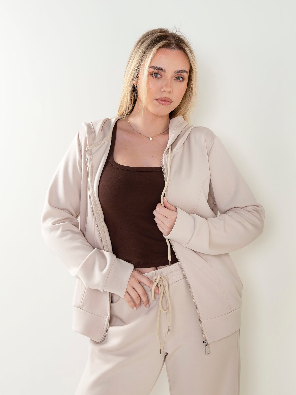 Casaco com capuz e fecho frontal, corte confortável e acabamento minimalista. Ideal para looks descontraídos de meia estação, combinando facilmente com jeans, leggings ou calças fluidas.