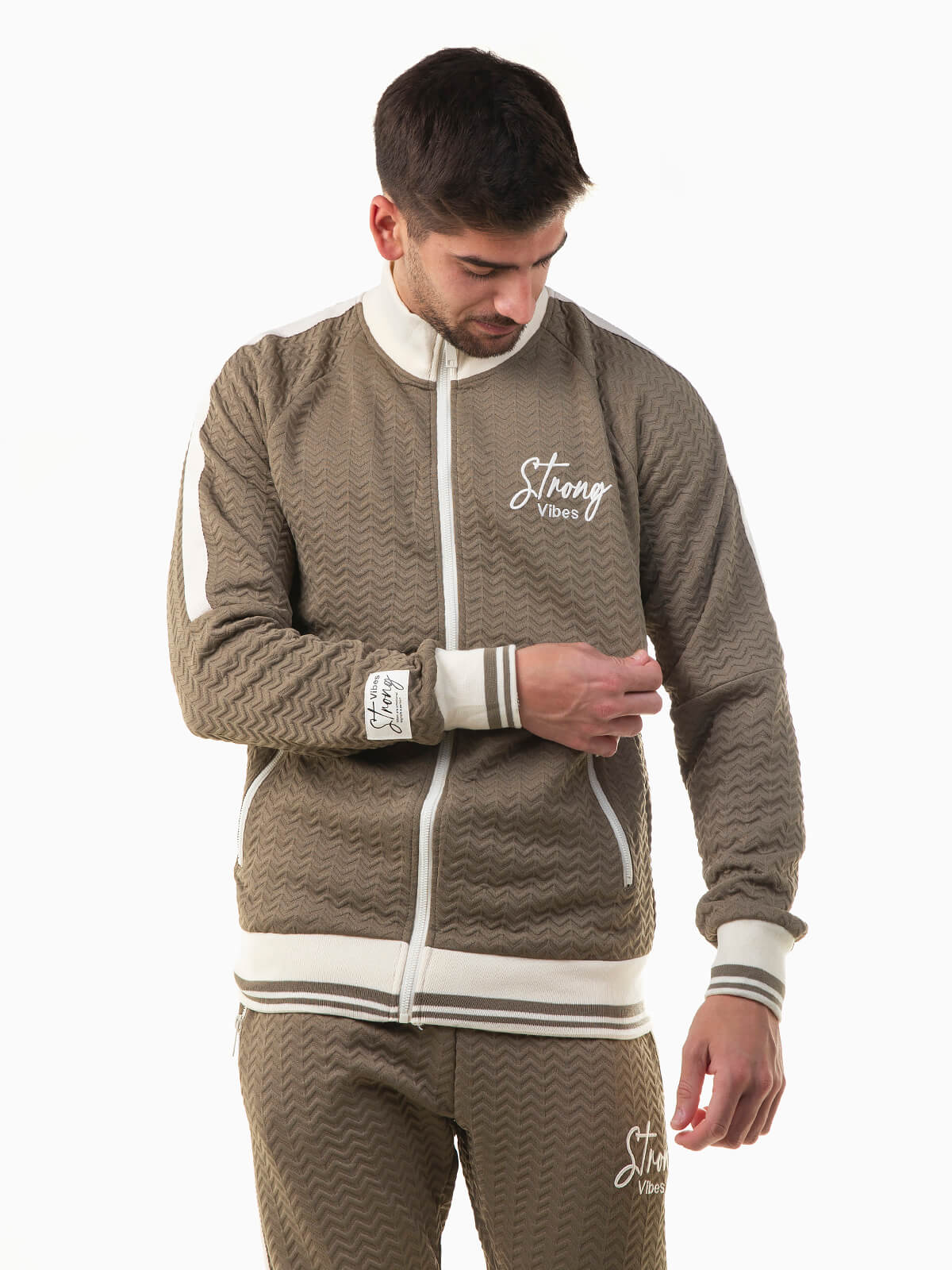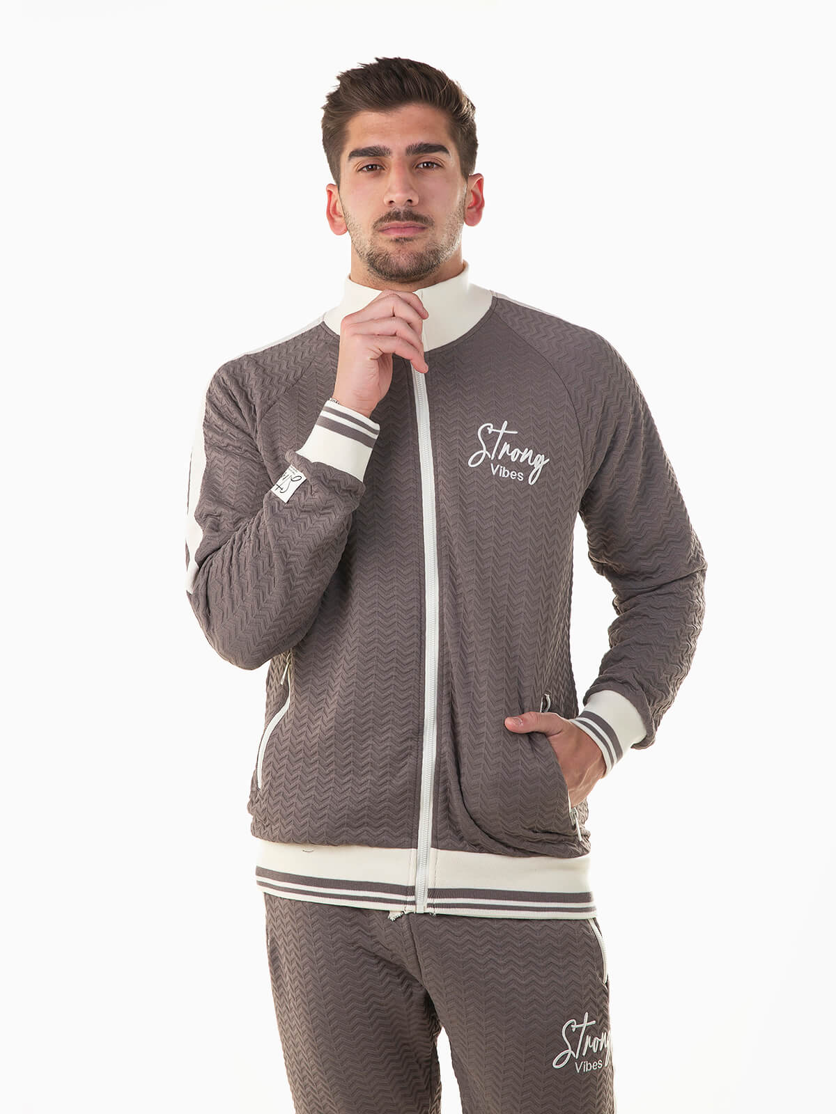 Casaco de fato treino com textura para homem. Casaco color block com acabamentos elásticos e pormenores bordados. Gola alta. 2 bolsos. Aperto de fecho zíper.