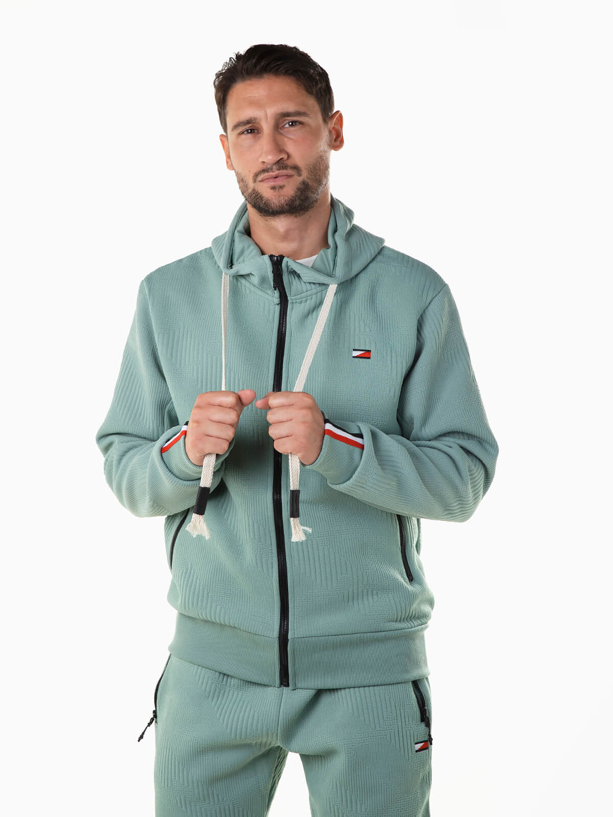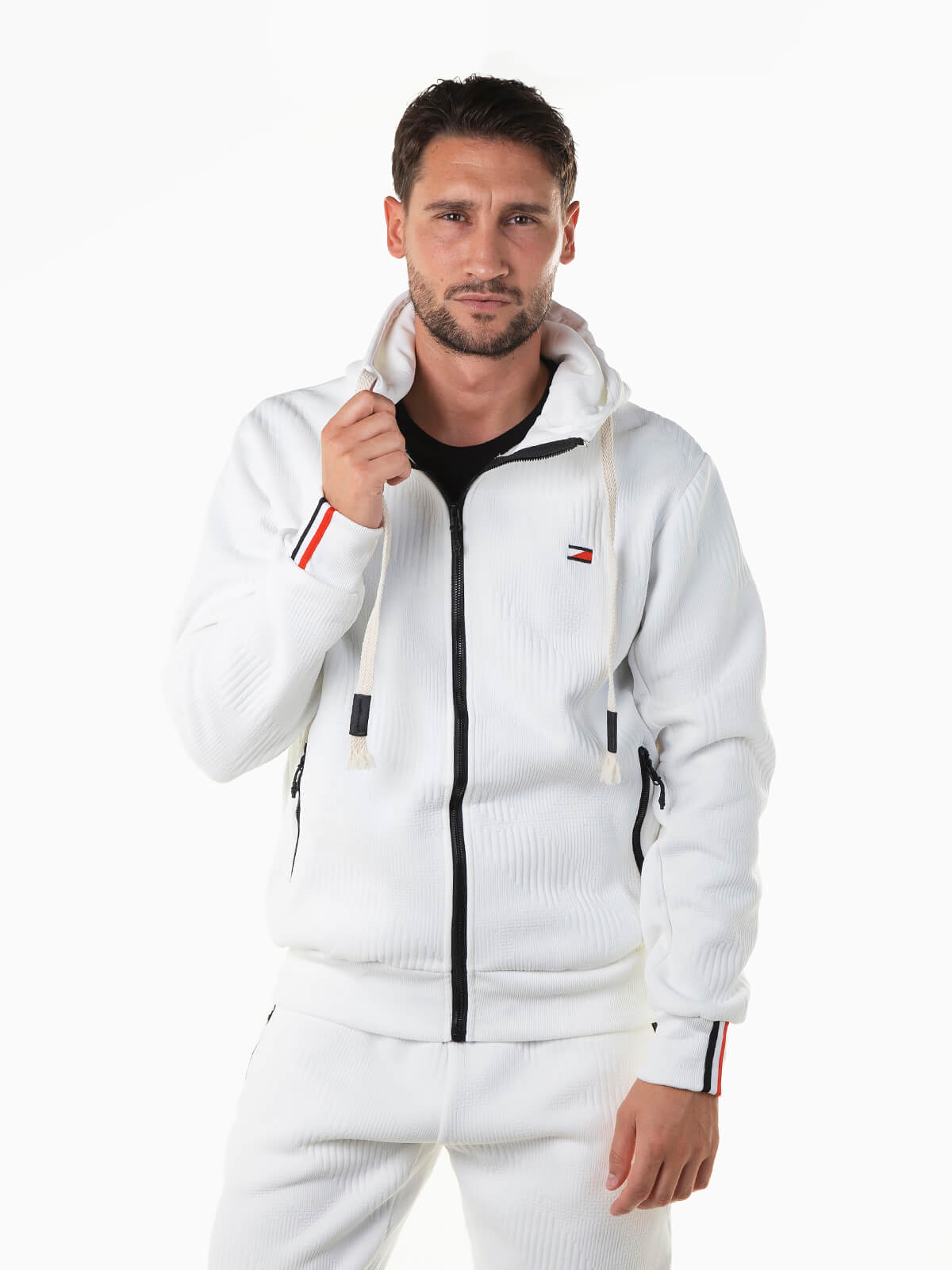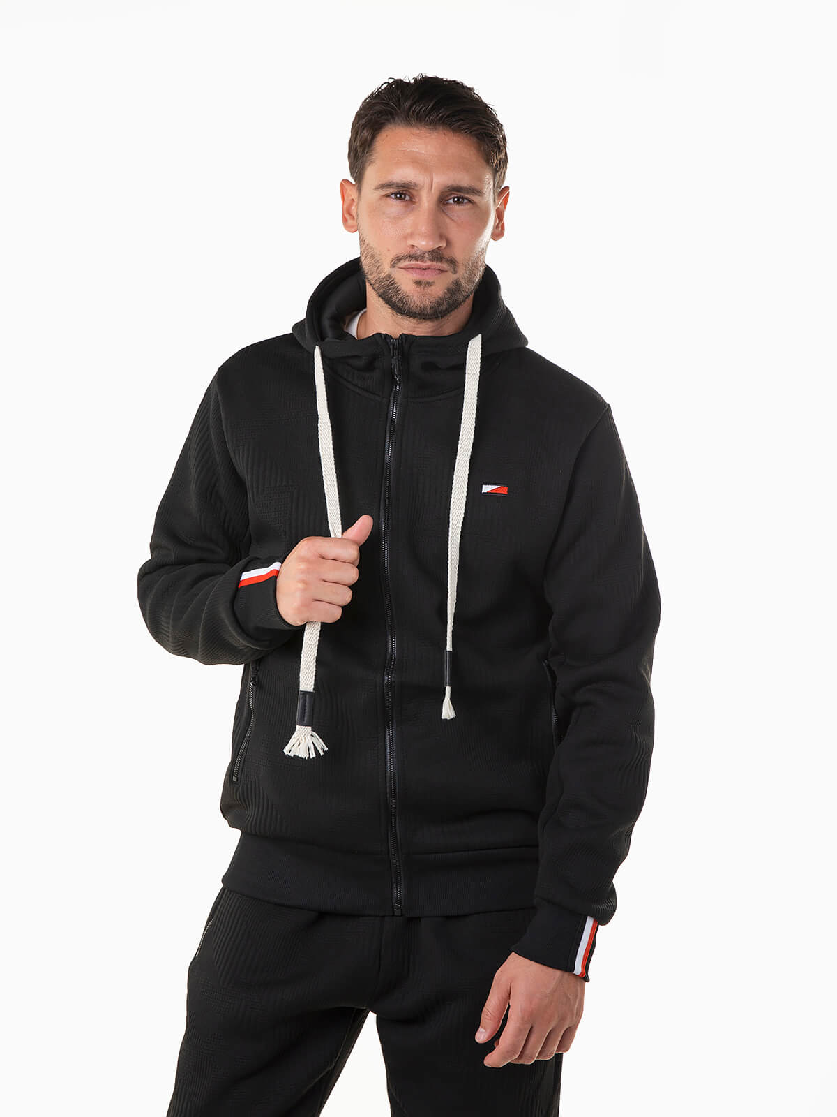 Casaco fato treino com textura e símbolo bordado no peito. Casaco hoodie manga comprida com cordão para ajustar. Pormenor de bandeira nos punhos. Gola alta. 2 bolsos. Aperto fecho zíper.