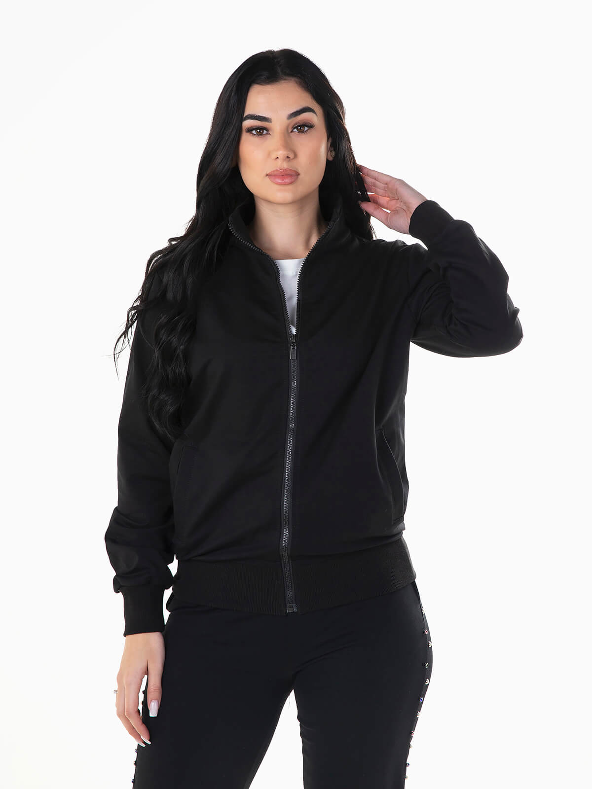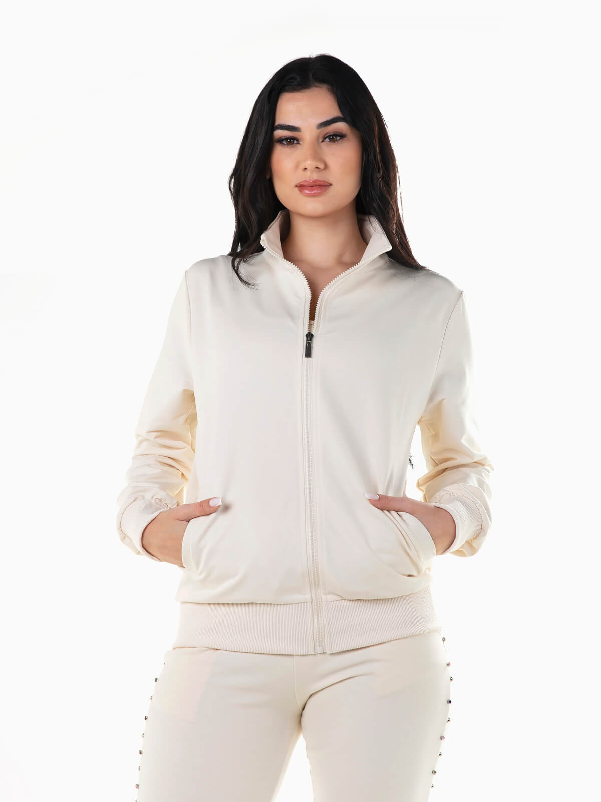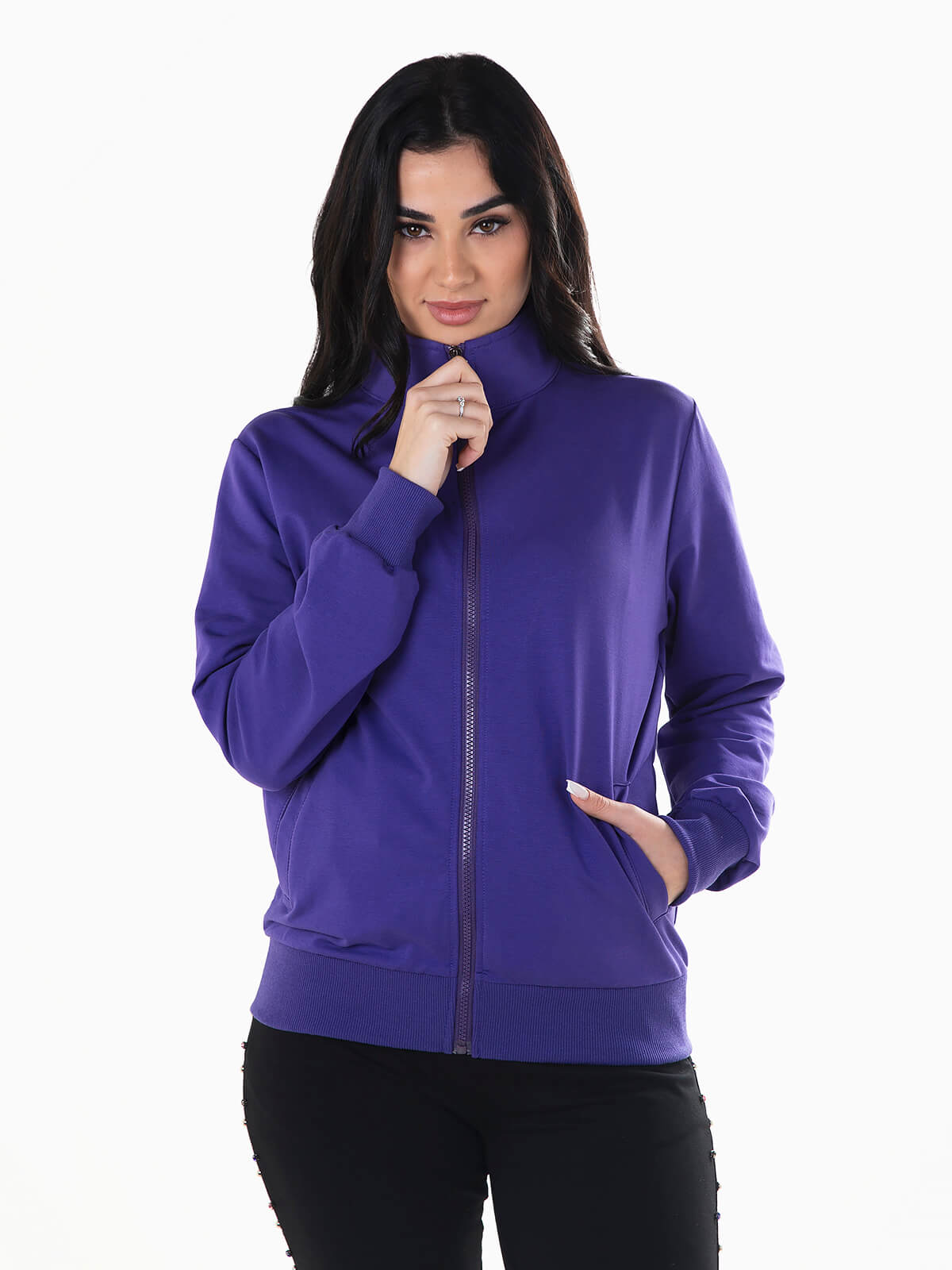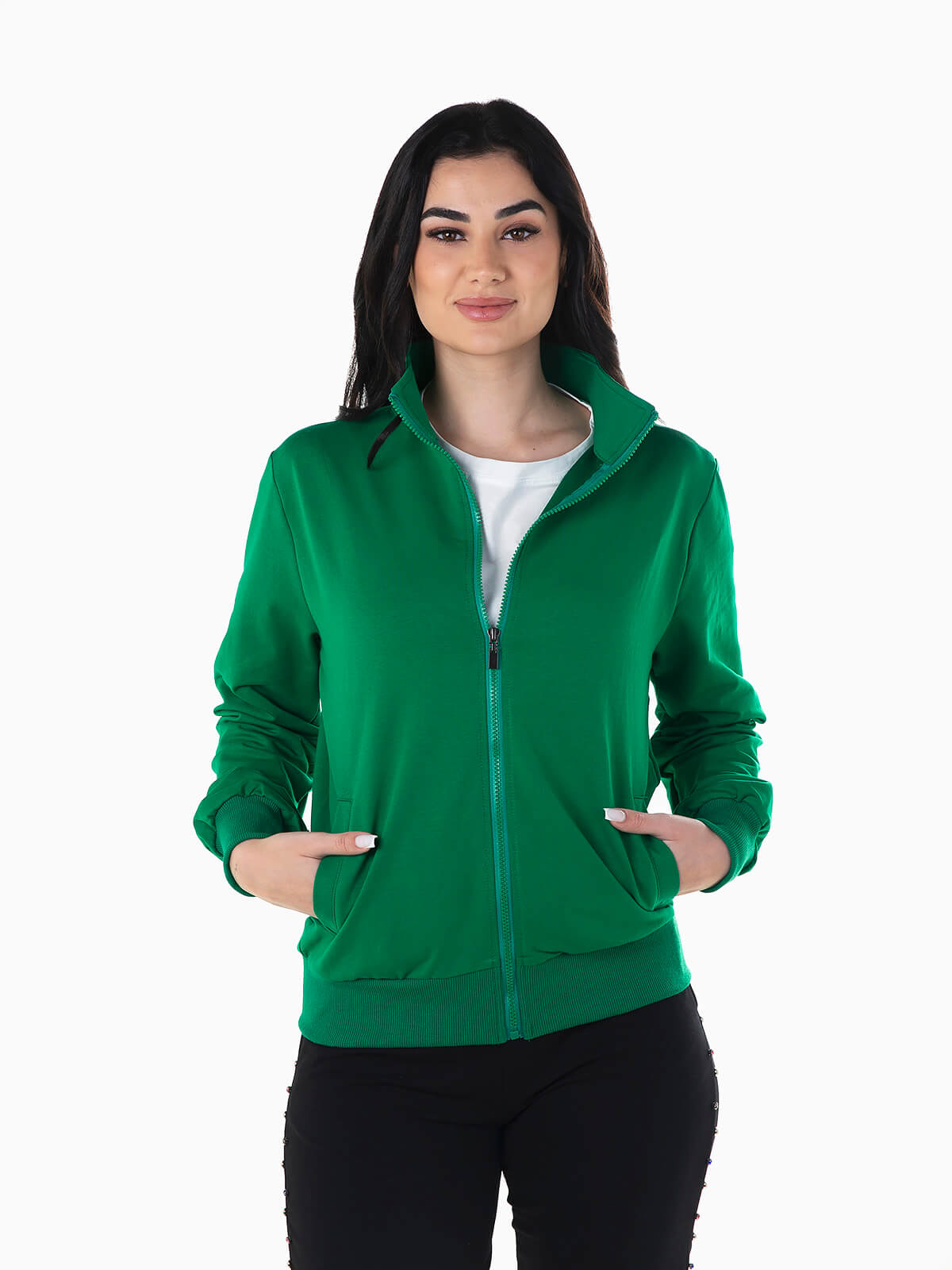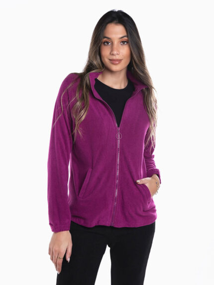 Casaco fato de treino com gola subida para senhora. Casaco felpa manga comprida com 2 bolsos. Aperto de fecho zíper.