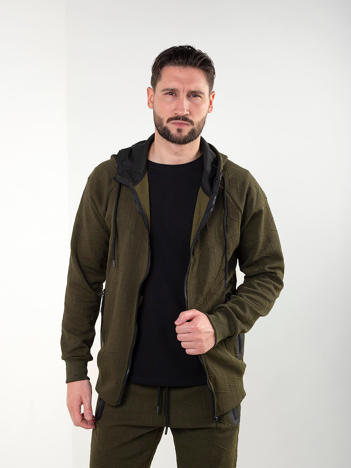 Casaco de homem felpa com capuz, fecho frontal e bolsos com zíper. Tecido texturado, confortável e perfeito para looks casuais. Punhos e cintura em rib para um ajuste prático no dia a dia.